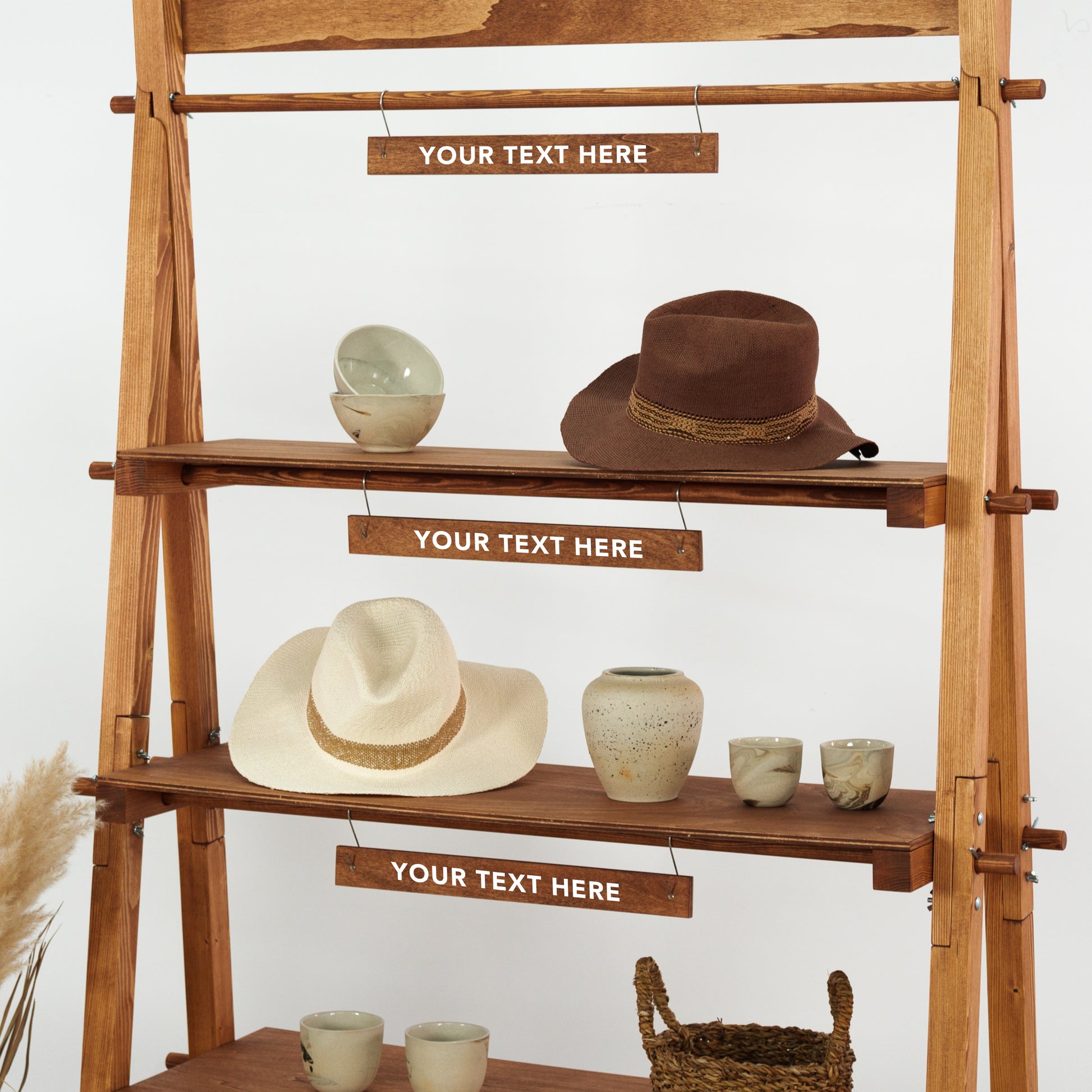 Ein Satz von 4 kleinen Schildern mit Haken eignet sich hervorragend zum Aufhängen an den Dübeln über den Regalen in unseren Regaleinheiten: VS-05-CF, VS-03-CF, VS-04-CF, VRS-01-CF. Sie können mit Ihrem Text, beispielsweise den Namen von Produkten oder Kategorien, personalisiert werden.