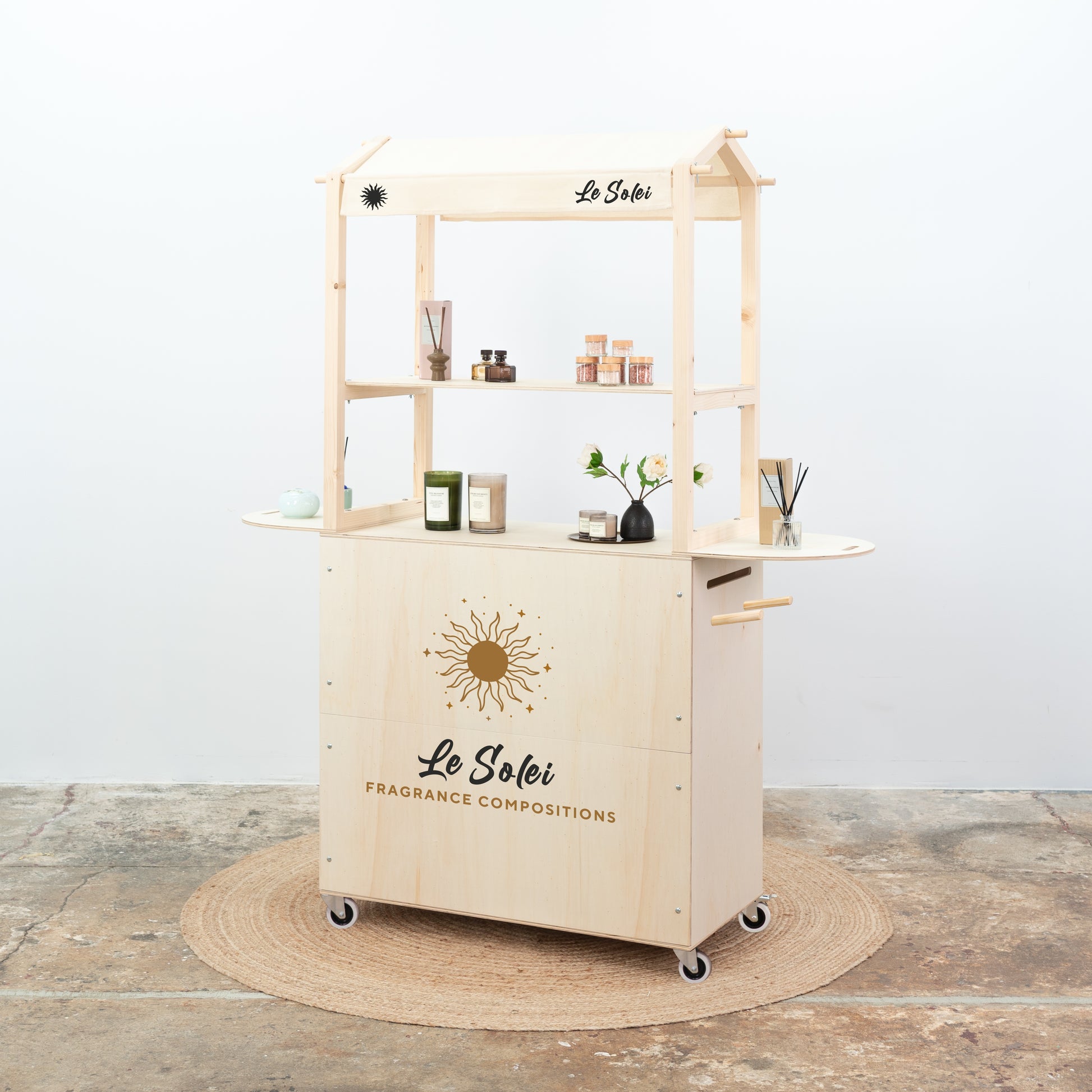 Eine originelle Art, Ihre Produkte zu präsentieren. Dieser Präsentationswagen auf Rädern kann auf Messen und Veranstaltungen viele Male auf- und abgebaut werden. Aus Sperrholz und Holz, mit Stoffdach.