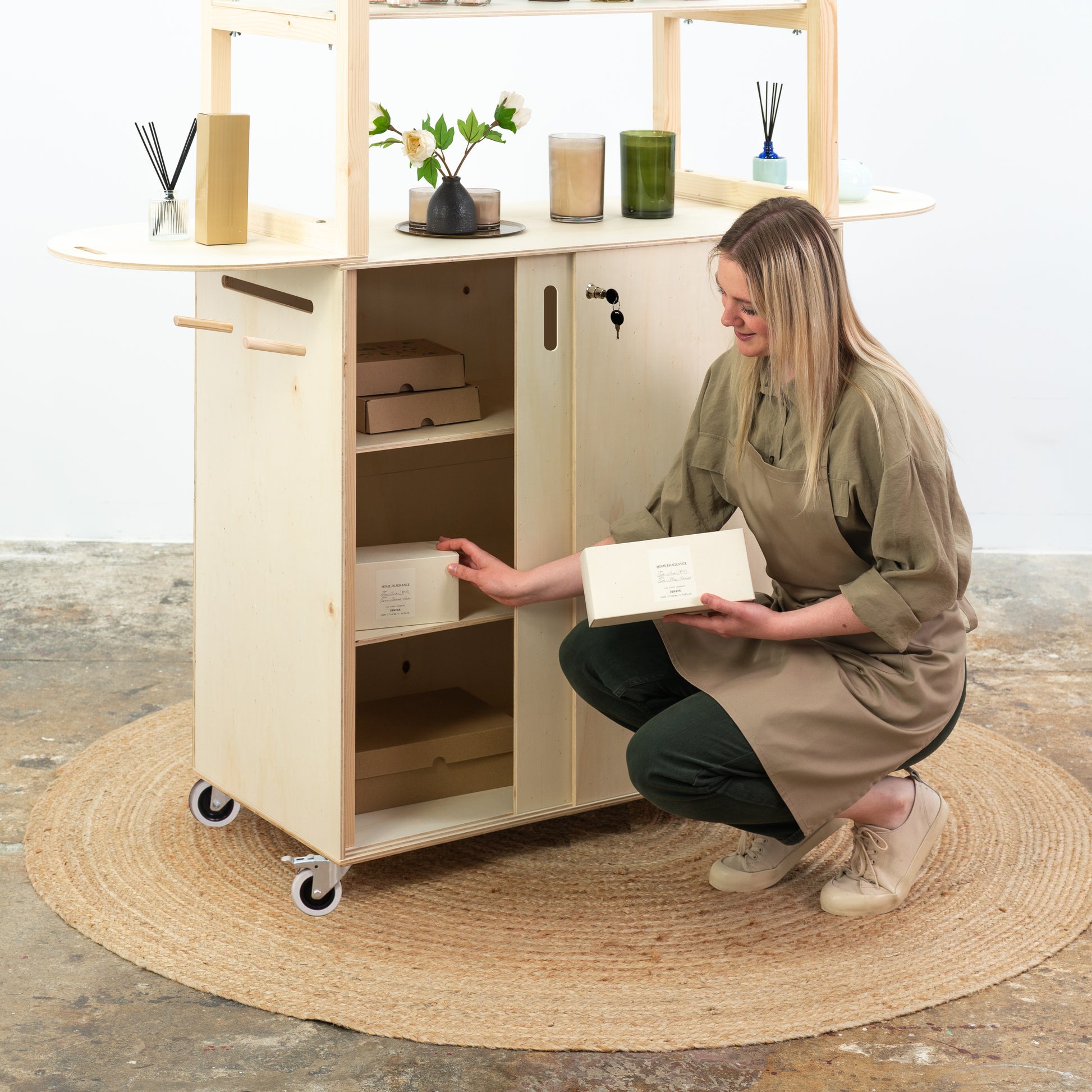 Großer Stauraum mit Schiebetüren und Schloss für zusätzliche Produkte oder persönliche Gegenstände.