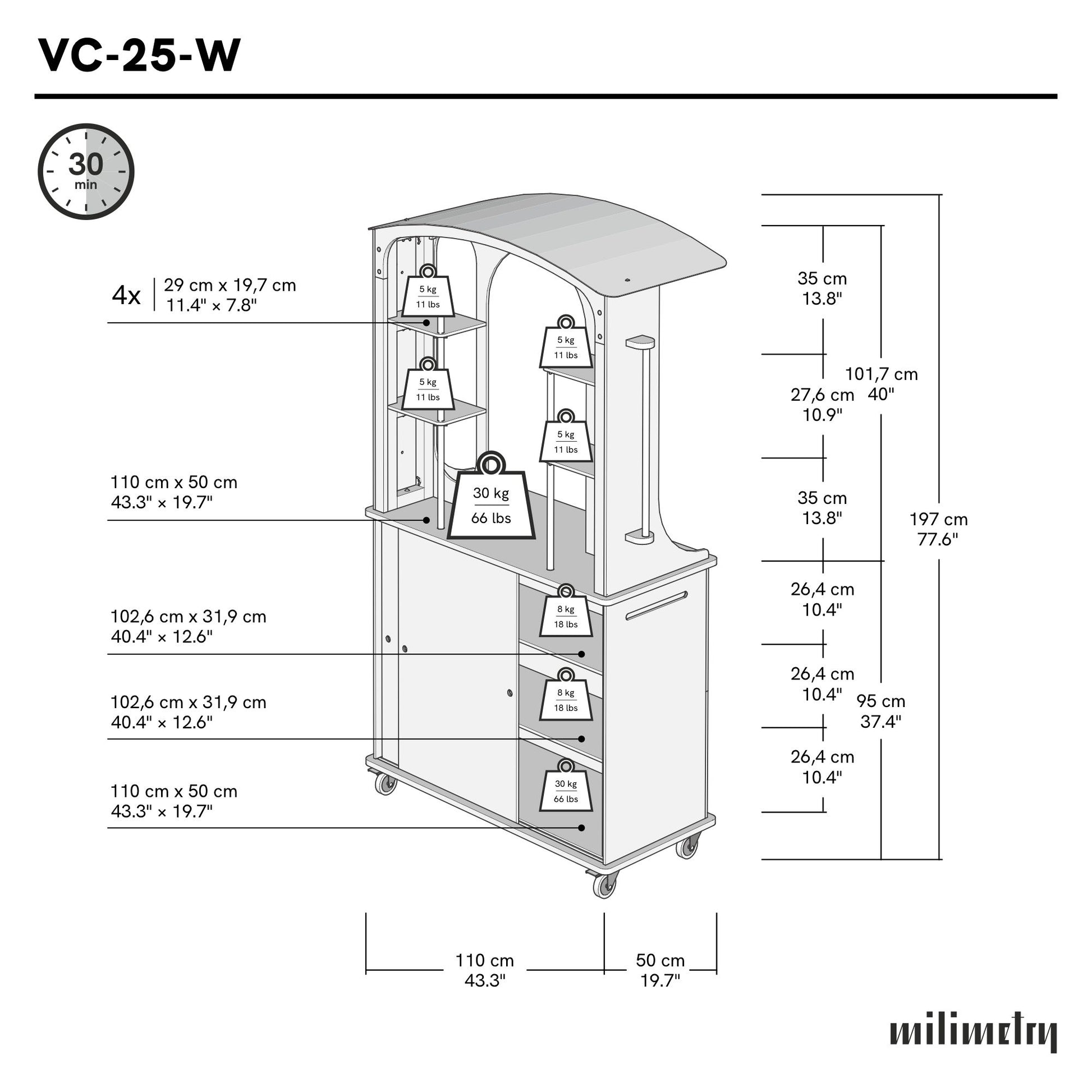 - Kleine Regale über der Arbeitsplatte: 2 kg (4,5 lbs)