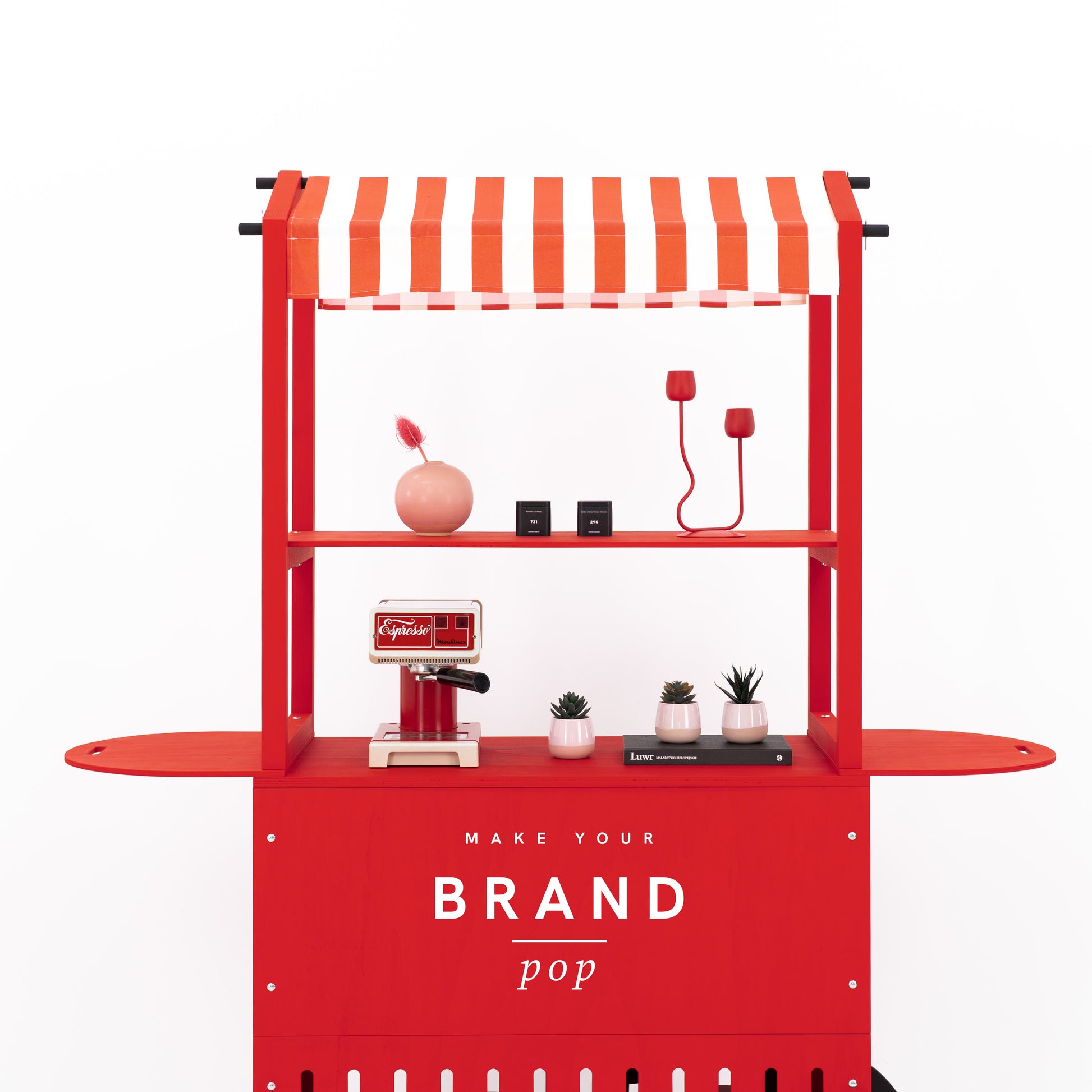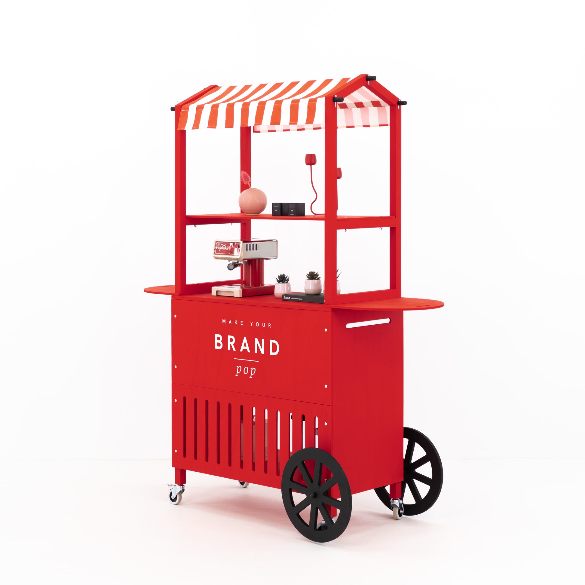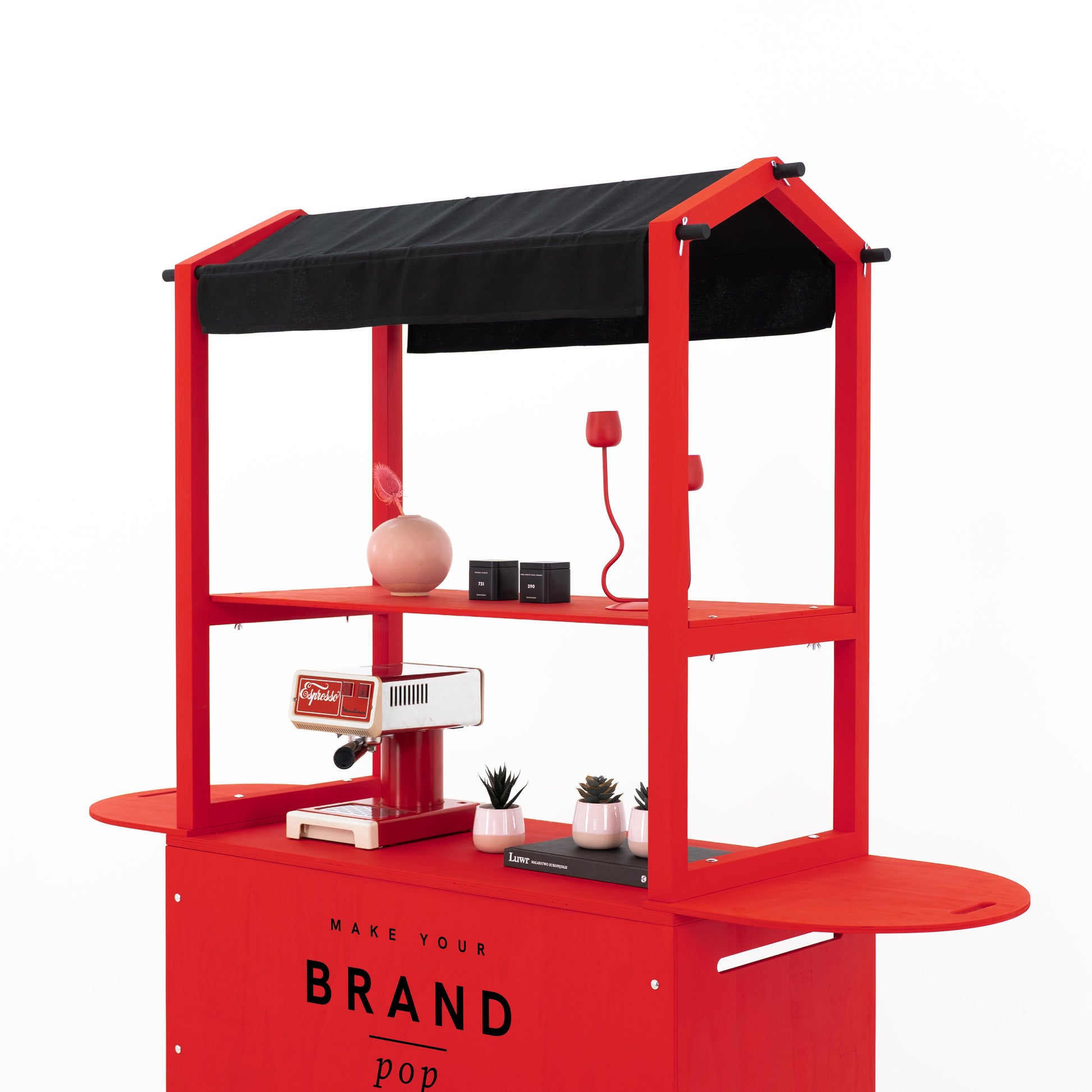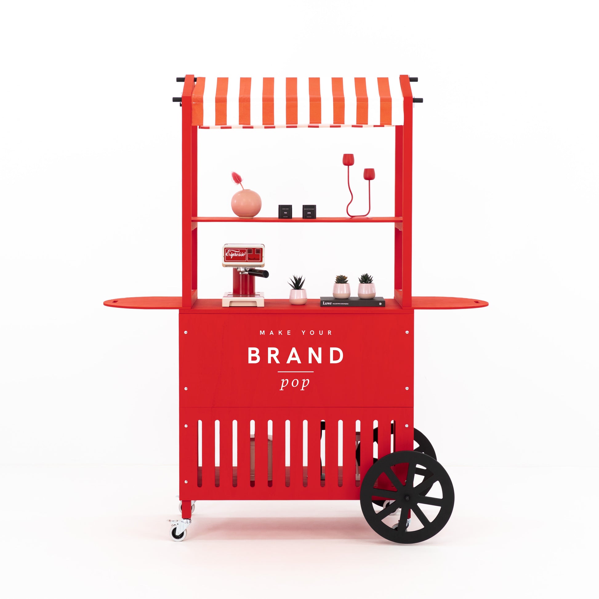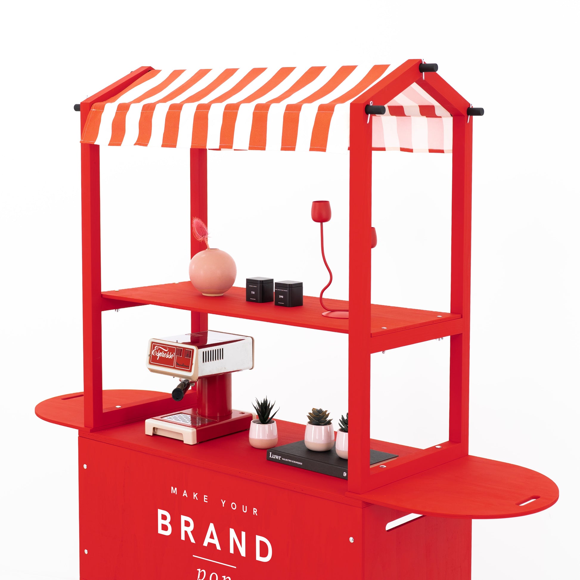 Crafted from durable plywood and solid spruce wood, the cart boasts a premium matte finish in any custom RAL or NCS color, allowing full alignment with your brand palette. Enhance visibility by printing your logo, campaign graphic, or custom design directly onto the front branding panel. Even the canopy can be fully personalized — choose a solid color, bold prints like stripes or dots, or have your logo and visual motifs printed across the surface for a truly on-brand expression that elevates your presence at any event. Thanks to its flat-pack structure, tool-free assembly (approx. 25 minutes), and compact footprint, this cart is built for frequent setup and teardown. It’s ideal for experiential marketing agencies, event rental companies, and corporate teams who need a portable yet professional solution for serving stations, info points, tasting kiosks, or multi-sensory retail activations.