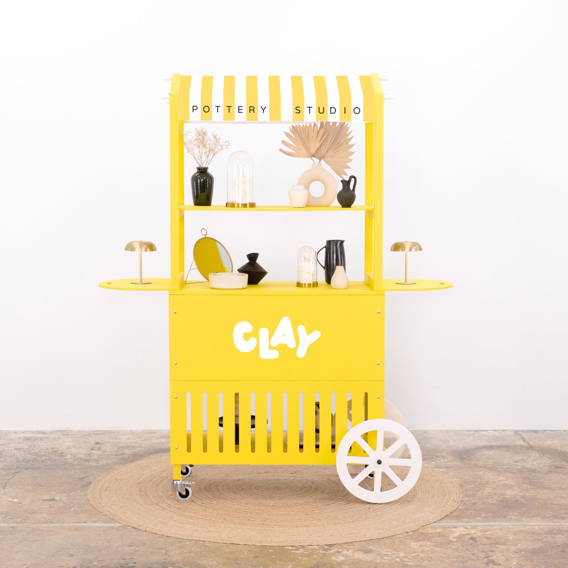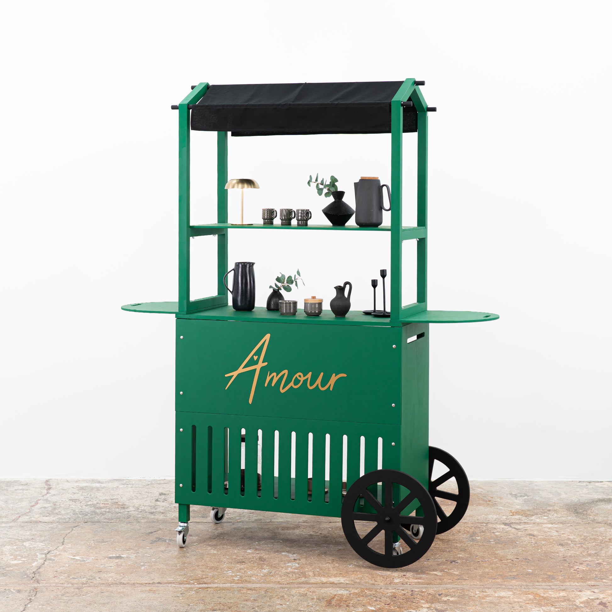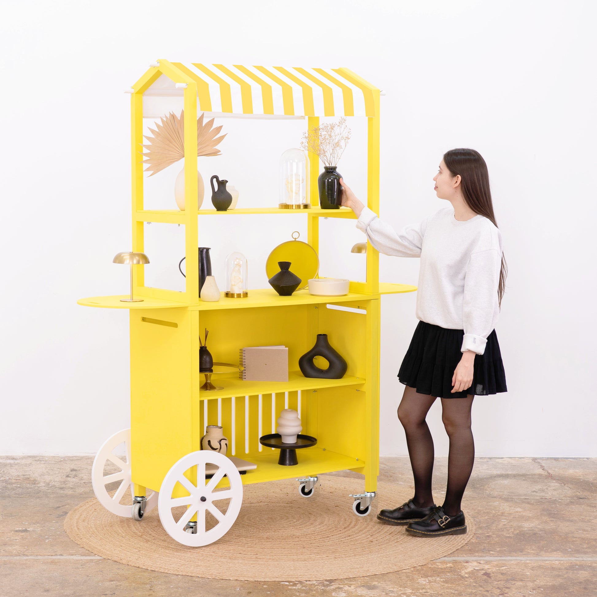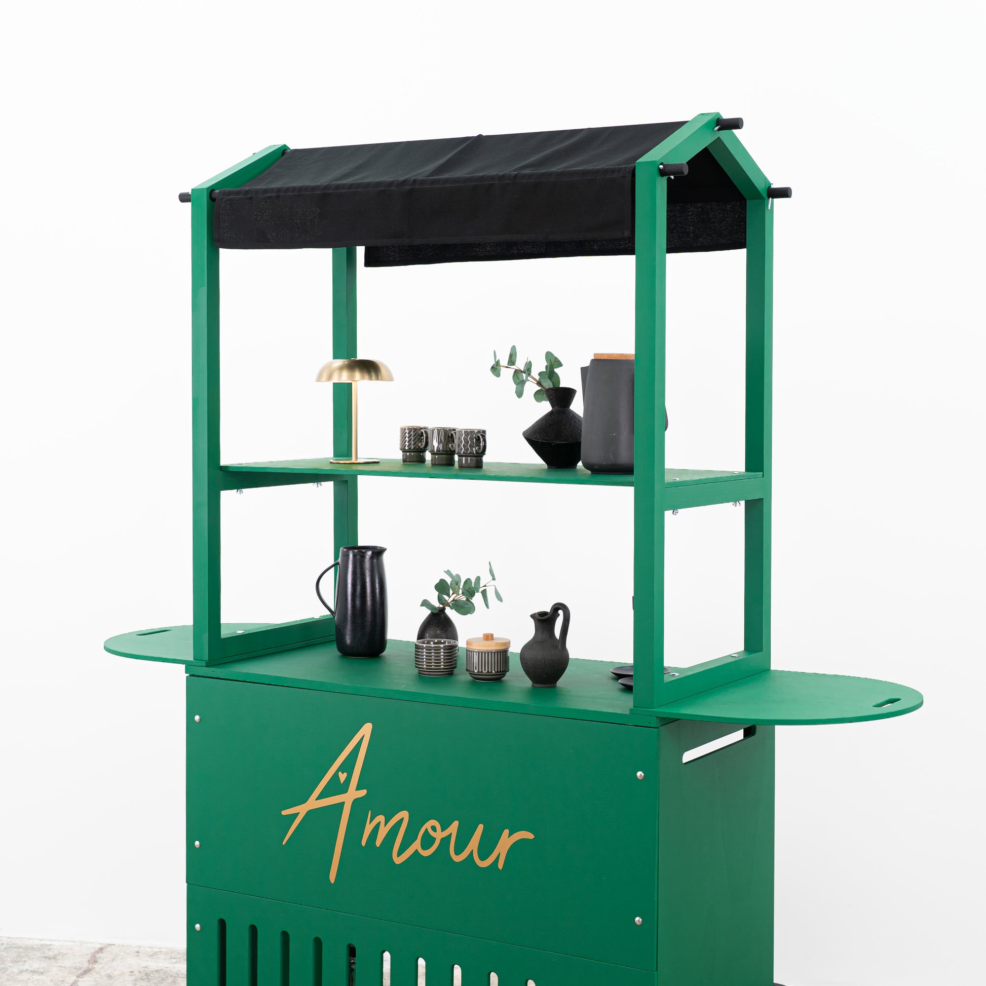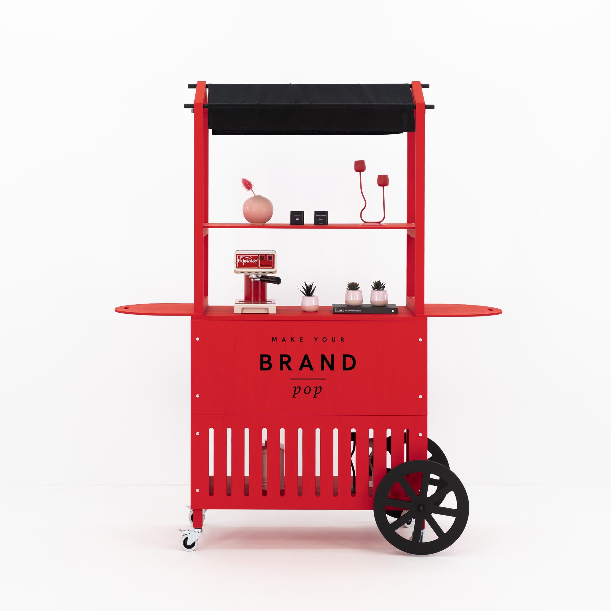 Crafted from durable plywood and solid spruce wood, the cart boasts a premium matte finish in any custom RAL or NCS color, allowing full alignment with your brand palette. Enhance visibility by printing your logo, campaign graphic, or custom design directly onto the front branding panel. Even the canopy can be fully personalized — choose a solid color, bold prints like stripes or dots, or have your logo and visual motifs printed across the surface for a truly on-brand expression that elevates your presence at any event. Thanks to its flat-pack structure, tool-free assembly (approx. 25 minutes), and compact footprint, this cart is built for frequent setup and teardown. It’s ideal for experiential marketing agencies, event rental companies, and corporate teams who need a portable yet professional solution for serving stations, info points, tasting kiosks, or multi-sensory retail activations.