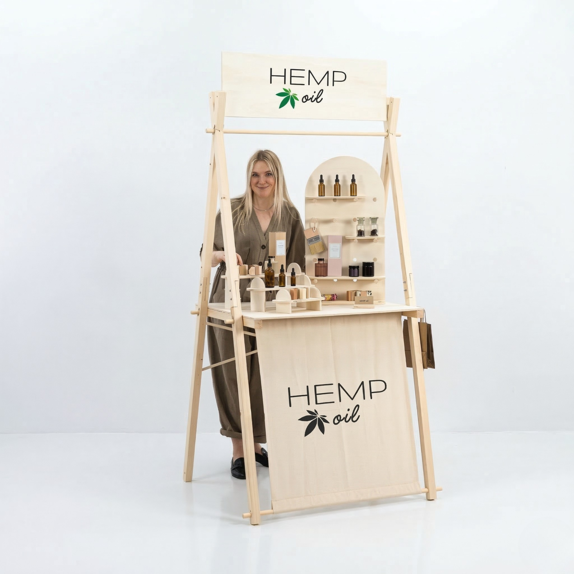This natural wood market stall is a versatile and sustainable solution for trade fairs, pop-up shops, and vendor booths. Designed with flexibility in mind, it’s available in two configurations to suit different branding needs: with a personalized top logo board or with a sun canopy.