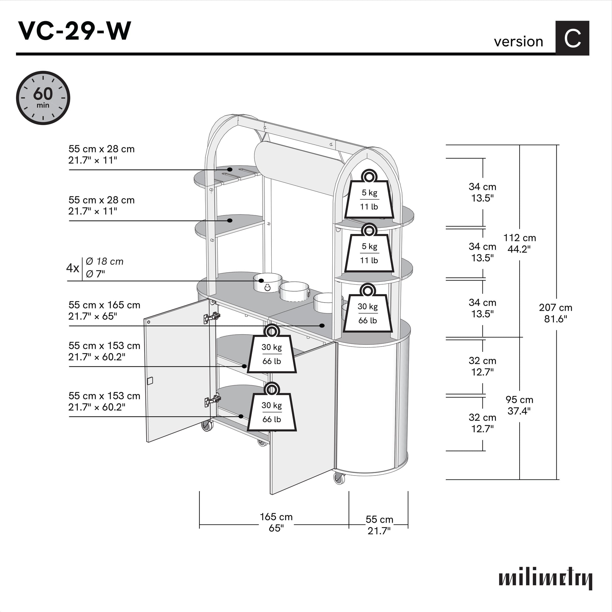 Les principales caractéristiques du meuble bas portes doubles verrouillables, vous permettant de stocker en toute sécurité bouteilles, fournitures, emballage, des objets personnels ou un stock de sauvegarde tout au long de la journée. Ceci stockage sécurisé garde la partie visible du chariot propre et élégante tout en garantissant que tout ce dont vous avez besoin pour le service est toujours à portée de main. Le personnalisable panneau supérieur vous permet de présenter votre logo ou le branding événementiel, renforçant la visibilité lors des activations. Le chariot peut être fini dans n'importe quelle RAL ou Couleur NCS, et ses roulettes assurent un mouvement fluide mobilité tout au long de votre événement ou espace commercial.