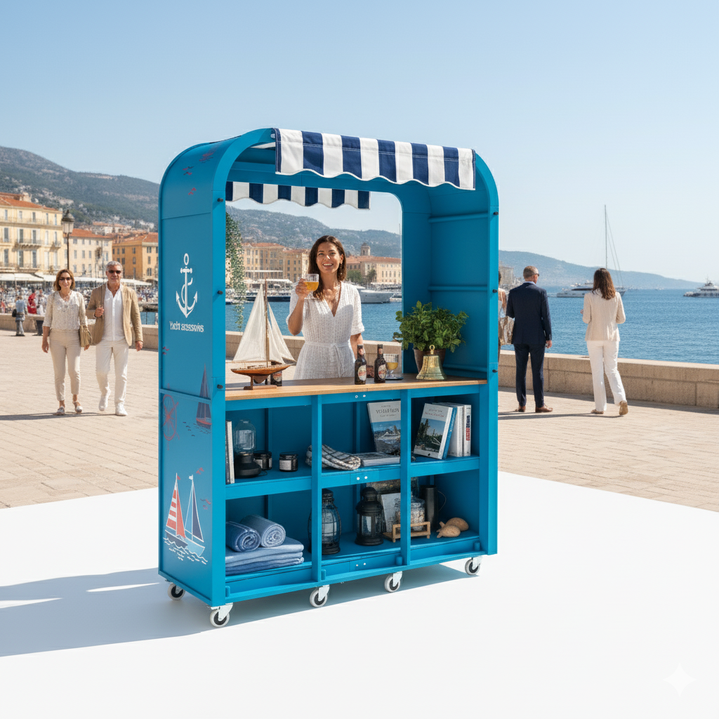 The Camper Style Display Cart is a professional event display cart designed for event agencies, experiential marketing activations, and retail pop-ups. With its camper-inspired design, it adds instant character and visibility to any setting, making it a standout choice for trade shows, corporate events, festivals, and branded experiences. Whether used as a mobile booth, bar cart, tasting station, or promotional counter, it offers the perfect balance of functionality and visual impact.