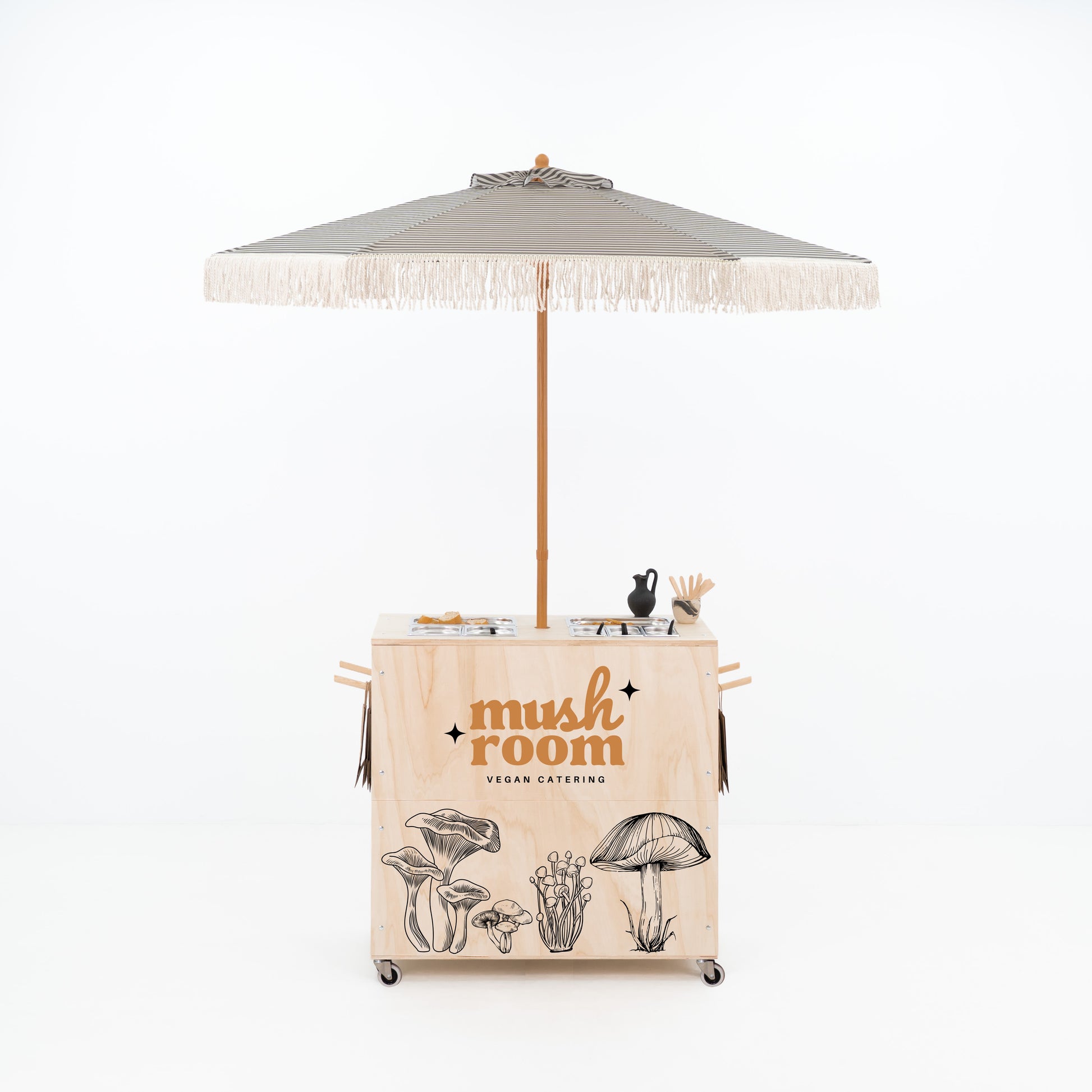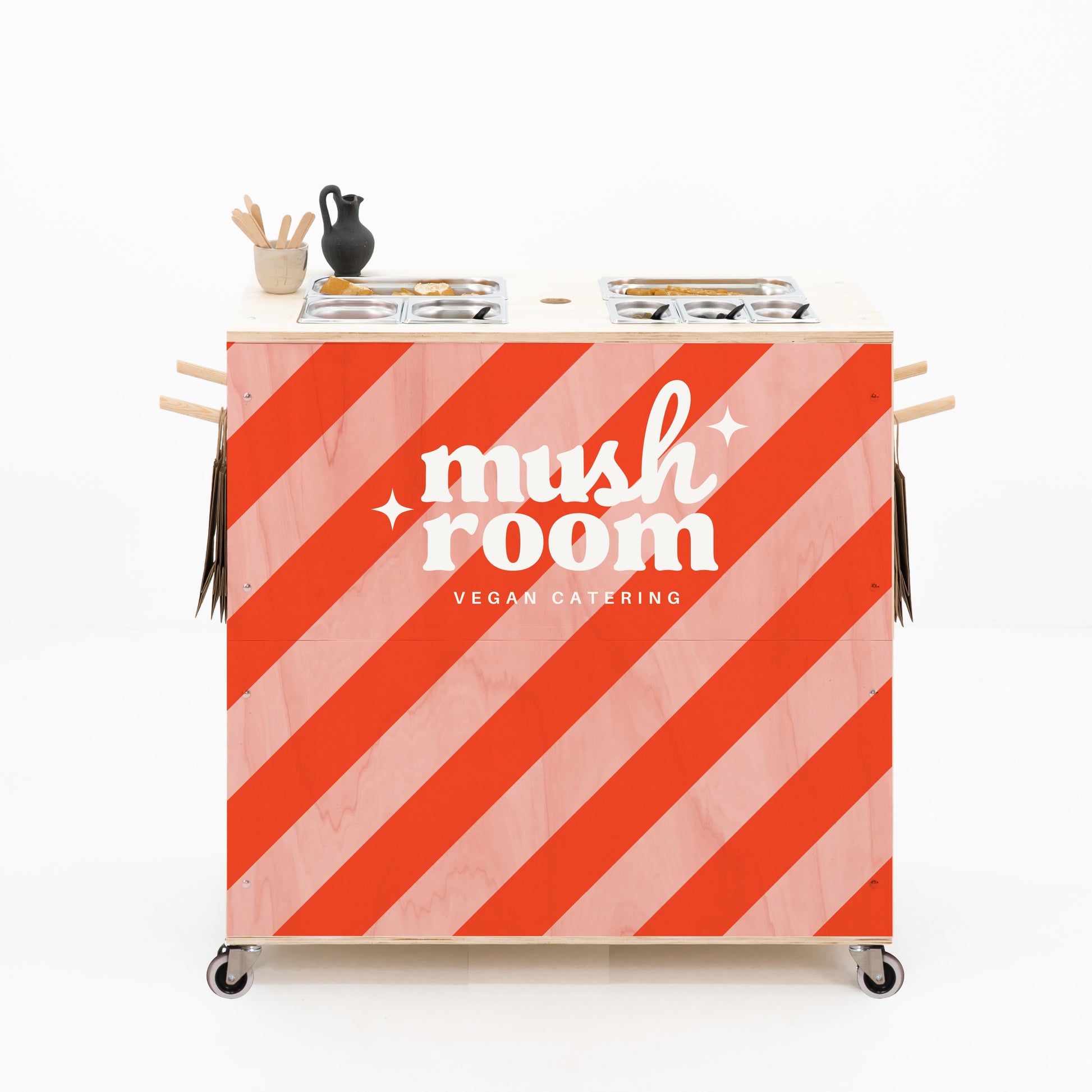 Le comptoir spacieux est équipé de ouvertures de coupe de précision pour Inserts gastronorm standard, idéal pour servir des plats frais, des plateaux froids ou des collations chaudes lors d'événements à fort trafic. Lorsqu'ils ne sont pas utilisés, les inserts peuvent être recouverts de couvercles en bois lisses, transformant la surface en un compteur polyvalent pour préparation de cocktails, configurations de barista, ou placage de dessert. Une découpe intégrée prend en charge un parapluie, offrant une teinte essentielle pour service de plein air et améliorer le expérience client. À l'intérieur, deux étagères pratiques offrent un stockage caché pour ustensiles, ingrédients Garder tout à portée de main et maintenir une présentation professionnelle propre. Merci à son design plat et assemblage sans outil, ce chariot de restauration est facile à transporter, à installer et à s'adapter aux environnements changeants. Options de marque personnalisées, y compris les décalcomanies de logo, les éléments graphiques de marque ou les tirages directs sur contreplaqué, permettent une intégration transparente avec votre identité de marque. Les impressions peuvent conserver le grain de bois naturel et le ton chaud pour un aspect organique ou être appliqué sur une surface amorcée pour une correspondance précise des couleurs. Une couverture de zone complète ou partielle est disponible, s'adaptant aux besoins visuels de toute activation.