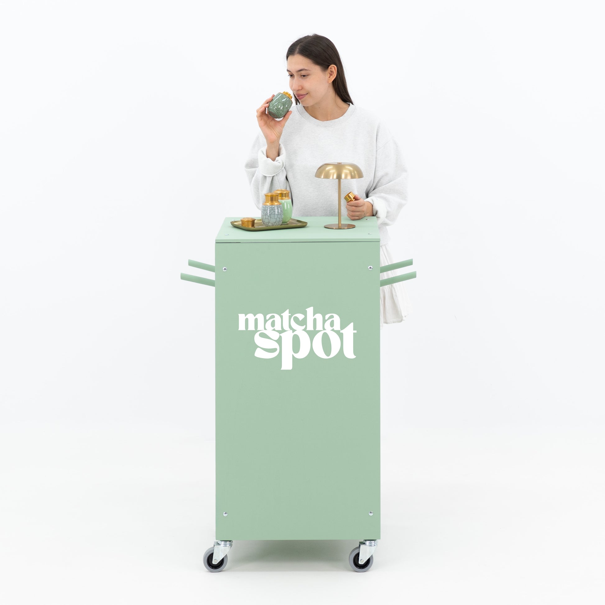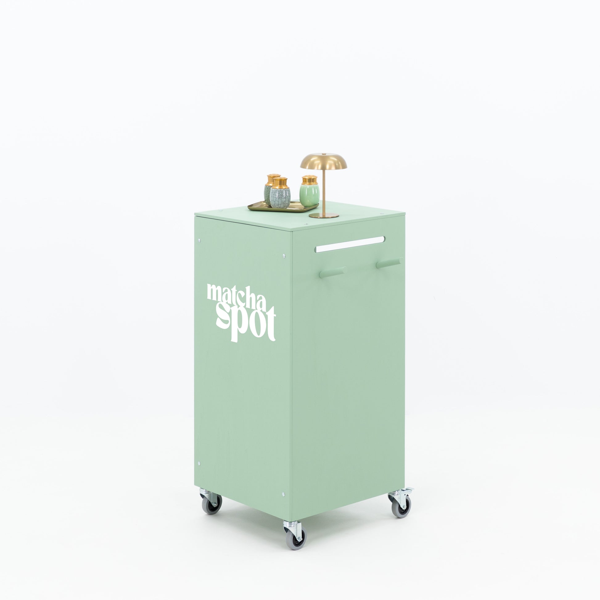 Comptoir portable sur roulettes avec personnalisation, idéal pour les salons et les magasins comme poste de caisse, poste de travail avec étagère de rangement intérieure, podium. Le podium est facile à monter et à démonter plusieurs fois et peut accueillir jusqu'à deux couvertures.
