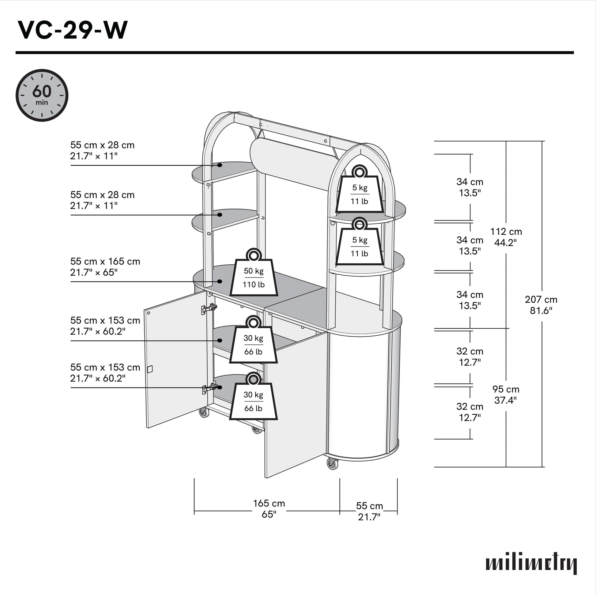 La partie inférieure du chariot comprend portes d'armoires verrouillables, offrant des services sécurisés et rangement discret pour les produits, les emballages, les objets personnels ou les fournitures de services. Cette fonctionnalité supplémentaire vous permet de conserver vos essentiels en toute sécurité tout en conservant une zone d'affichage propre, professionnelle et visuellement attrayante pendant les activations. Le chariot est équipé de étagères modulaires pouvant être personnalisées selon vos besoins, que vous ayez besoin de rangement supplémentaire, d'une zone d'affichage ou d'une surface fonctionnelle. Vous pouvez facilement personnalisez le panier avec le logo de votre marque ou des graphiques personnalisés, et choisissez n'importe quelle couleur de chariot dans la palette RAL ou NCS, en s'assurant qu'il s'intègre parfaitement au thème de votre événement ou de votre entreprise. Le chariot de présentation VC-29 est suffisamment polyvalent pour présenter et servir une grande variété de produits. Avec son roulettes, le panier propose mouvement fluide, permettant repositionnement facile lors d'événements, ce qui en fait un choix parfait pour tous ceux qui cherchent à créer un configuration de vente au détail ou de service mobile qui peut être facilement déplacé et personnalisé. De plus, le chariot de présentation VC-29 est pliable et compact, lui permettant d'être facilement stocké et transporté dans des étuis de transport.