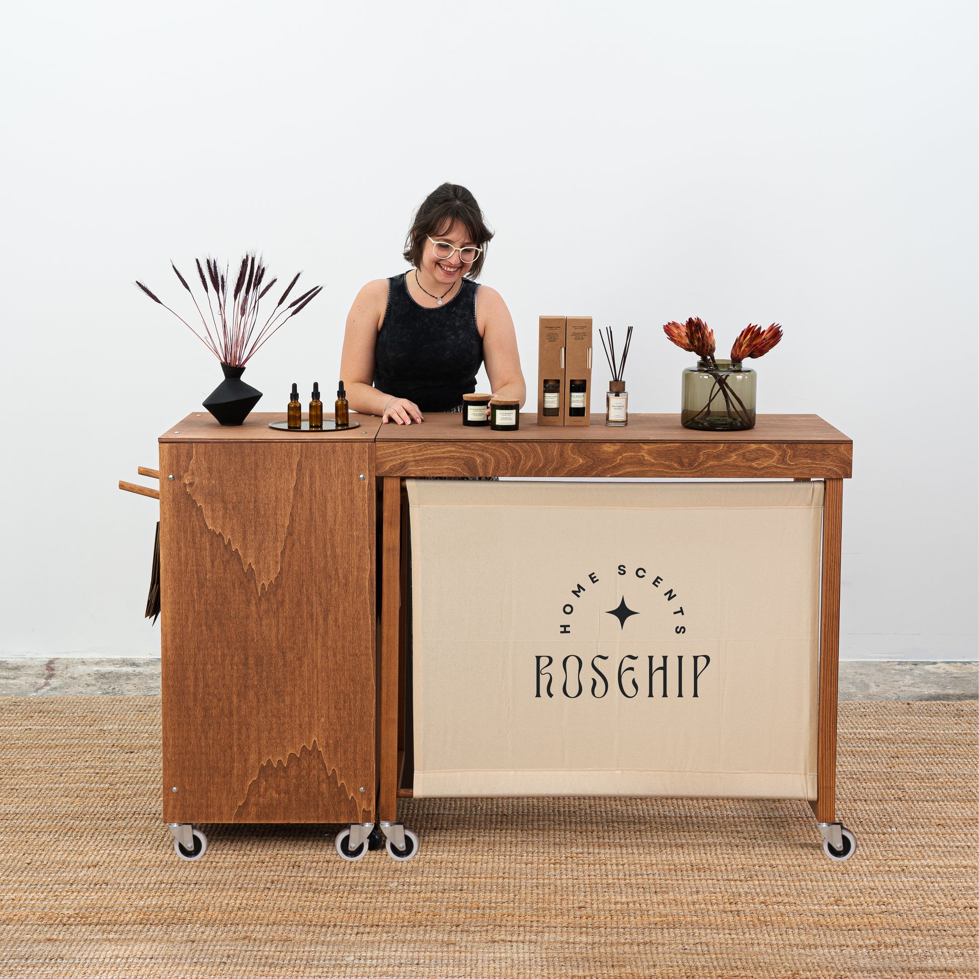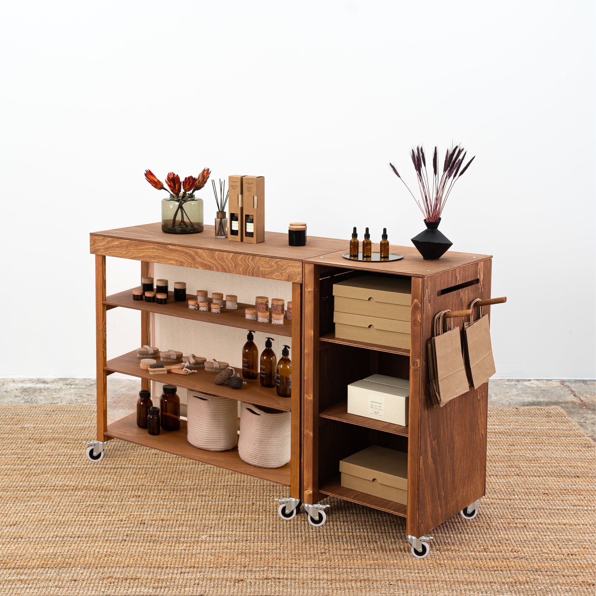 L'ensemble comprend un comptoir et une table portables qui peuvent être utilisés séparément ou ensemble. Cela vous permet d'aménager un plan de travail plus grand pour exposer des produits ou de créer un poste de dégustation ou un poste d'emballage de cadeaux.