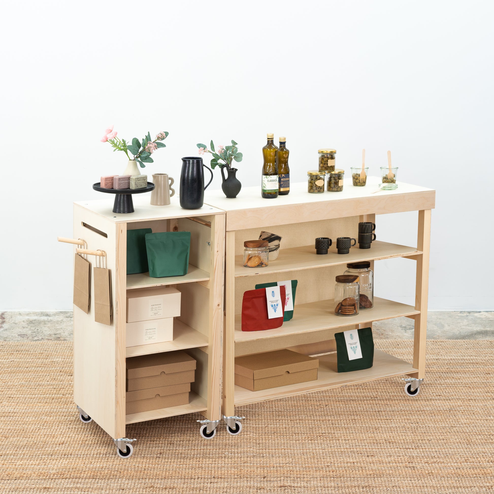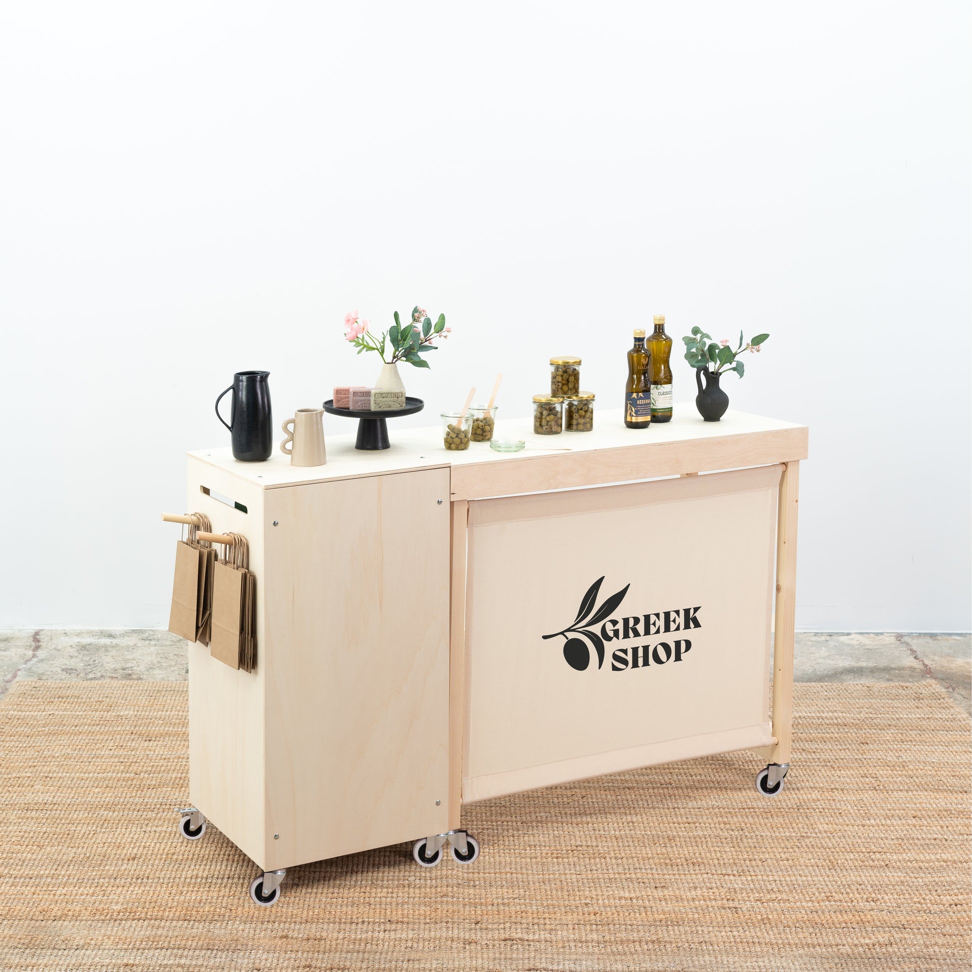 L'ensemble comprend un comptoir et une table portables qui peuvent être utilisés séparément ou ensemble. Cela vous permet d'aménager un plan de travail plus grand pour exposer des produits ou de créer un poste de dégustation ou un poste d'emballage de cadeaux.