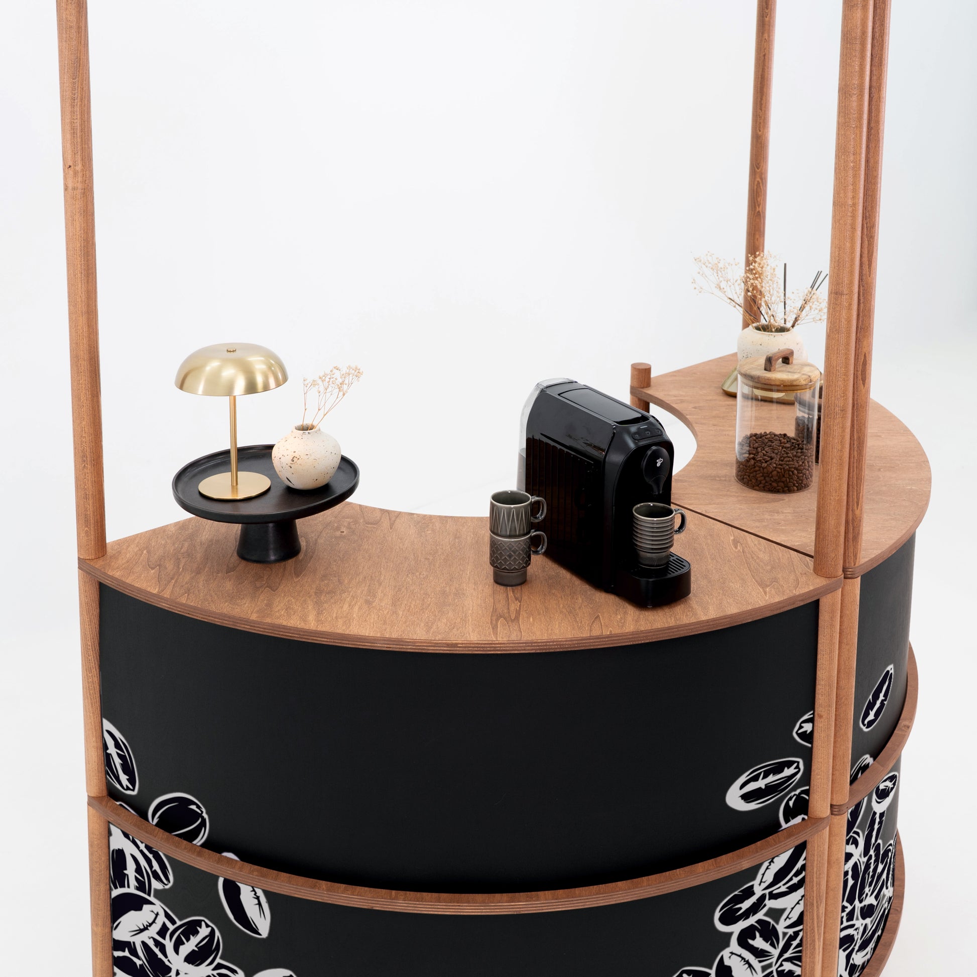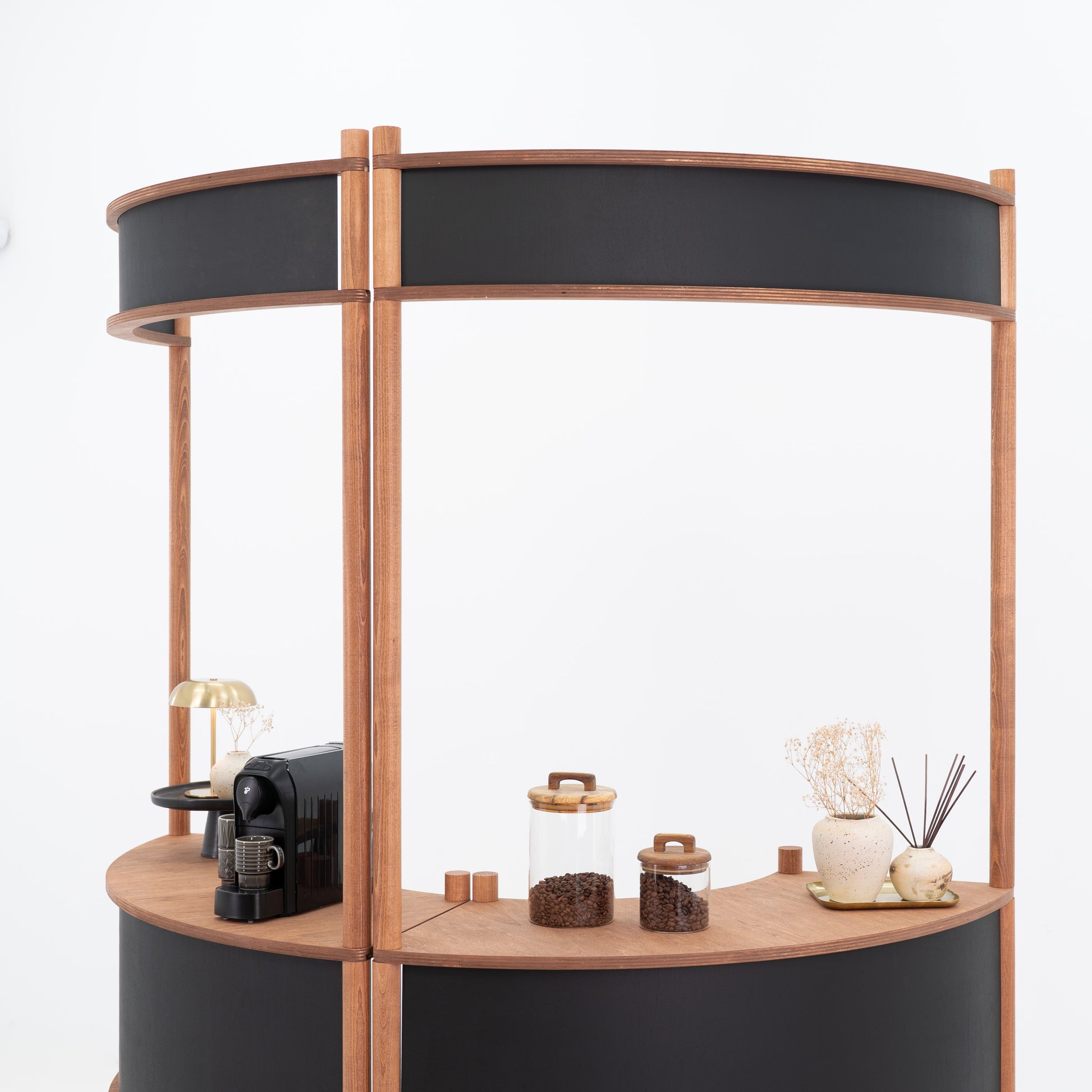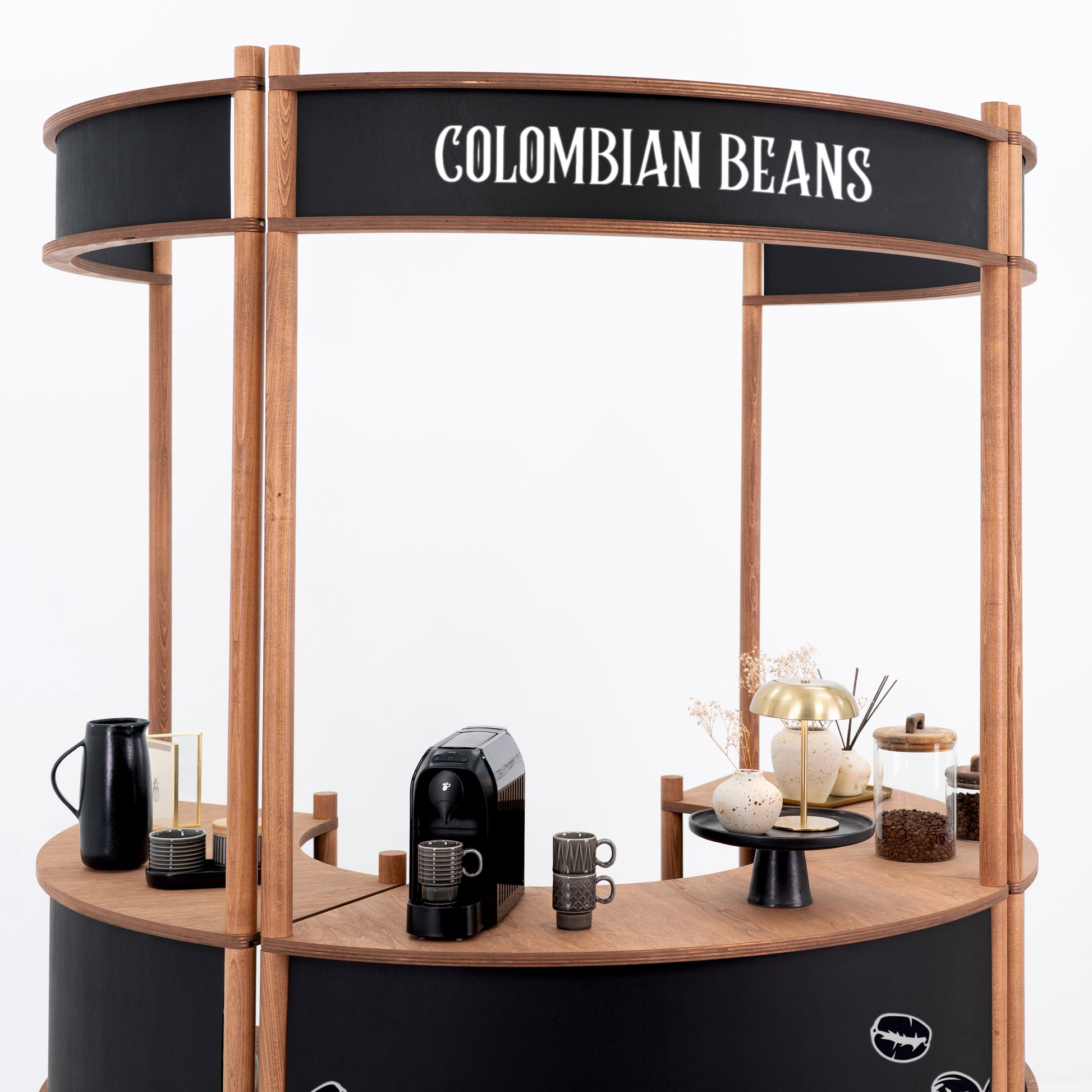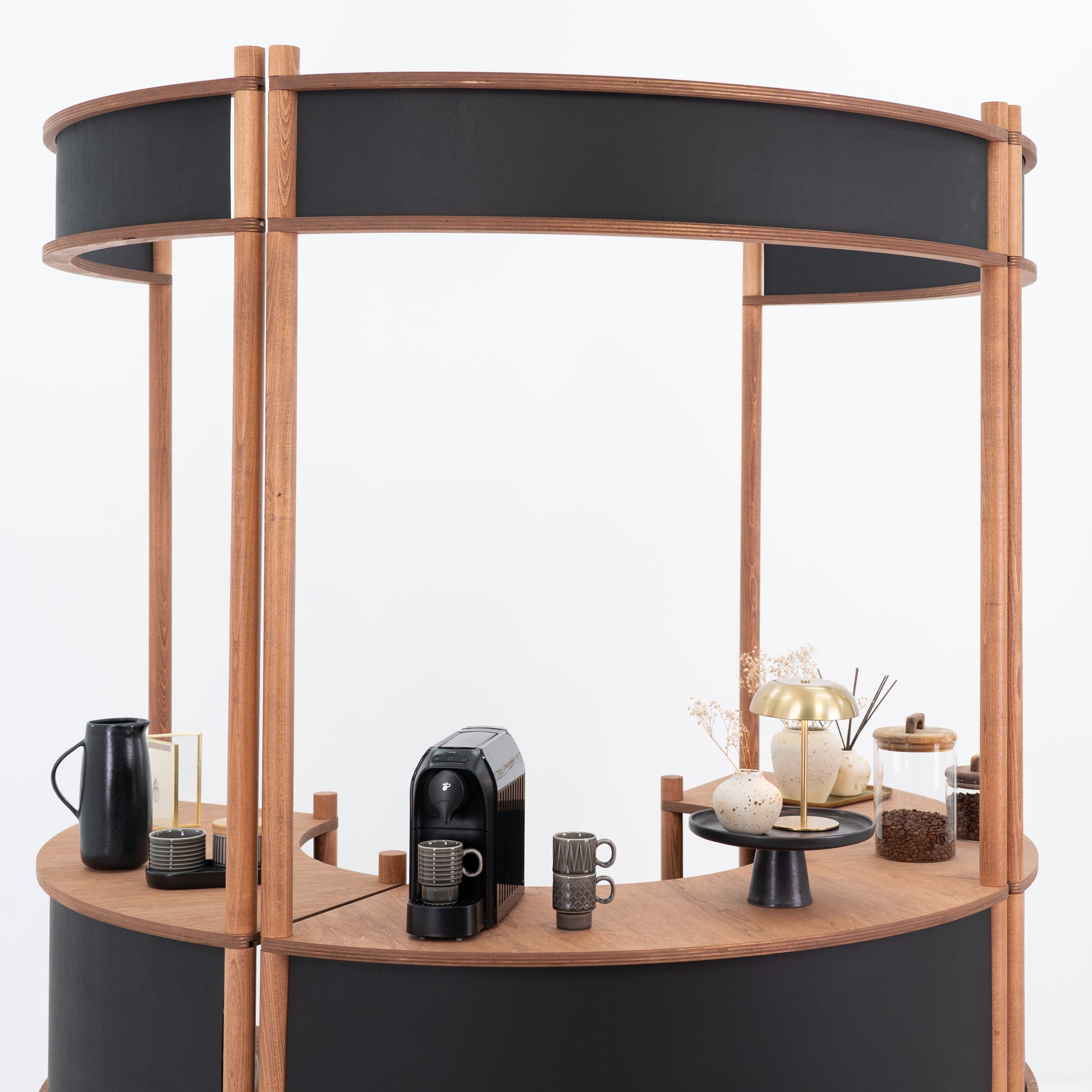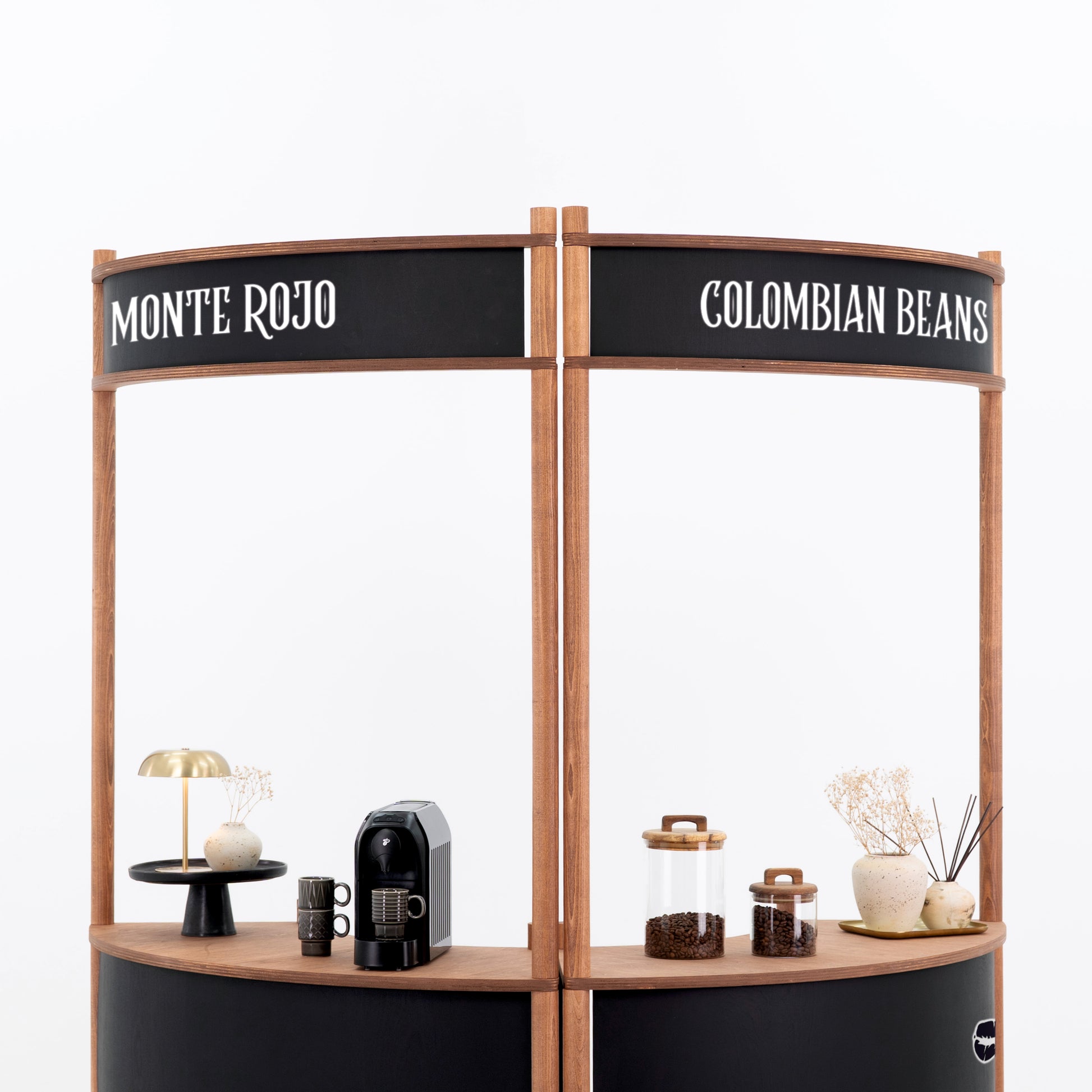Disponible en configuration demi-cercle ou trois-quarts de cercle. La structure, le plan de travail et les étagères intérieures sont proposés en coloris coffee, apportant à l’ensemble un caractère chaleureux, premium et orienté design, parfaitement adapté aux univers cosmétique, lifestyle, food & beverage, hospitality et retail haut de gamme. Tous les panneaux courbés en contreplaqué peuvent être réalisés dans n’importe quelle couleur RAL ou NCS, afin d’aligner parfaitement la station avec votre palette de campagne, votre identité de marque ou votre scénographie événementielle. Pour un storytelling visuel encore plus fort, ces panneaux peuvent également être personnalisés avec logos, typographie, stickers, illustrations ou impressions grand format, transformant l’installation en un point focal de marque à fort impact, visible depuis plusieurs angles. Grâce à son montage vissé sans outils, la structure reste rapide à installer, pratique pour un usage répété et facile à transporter d’un lieu à l’autre.