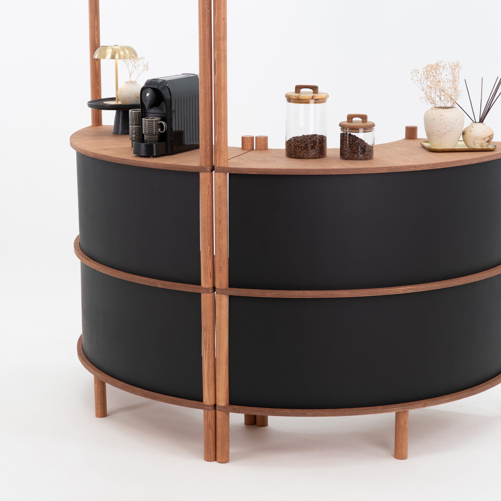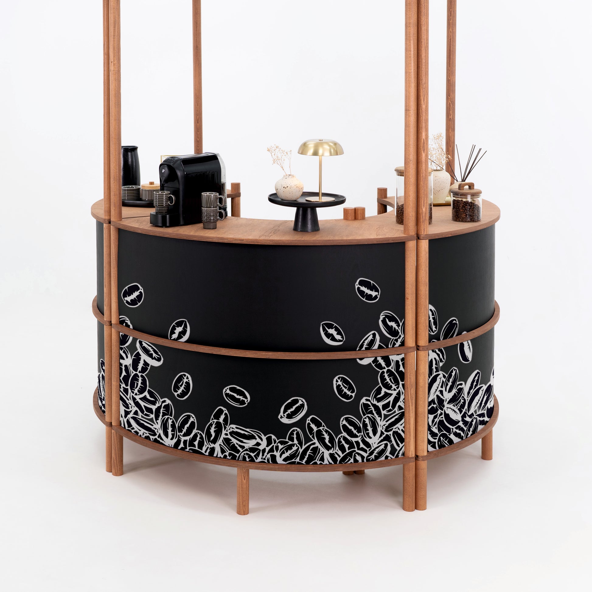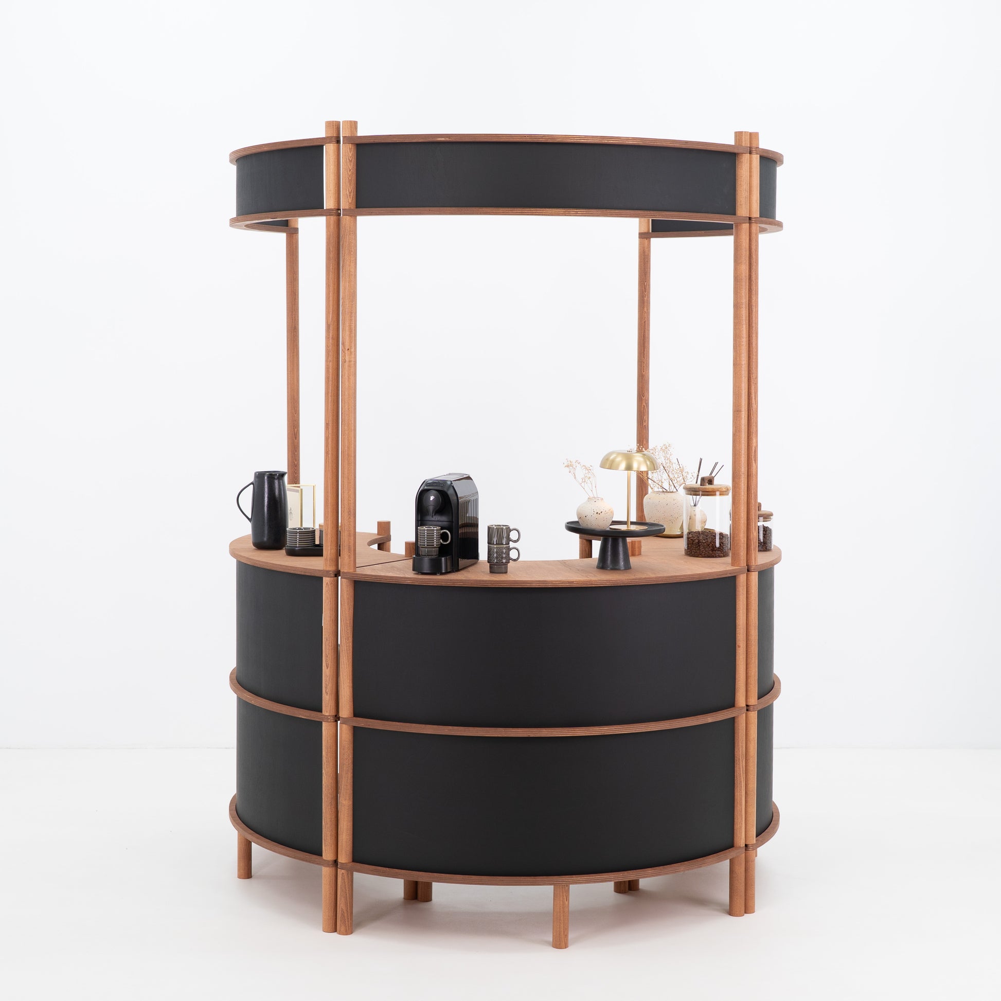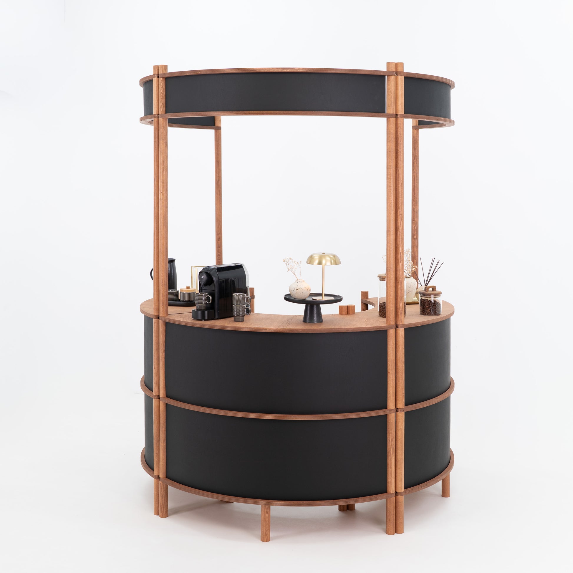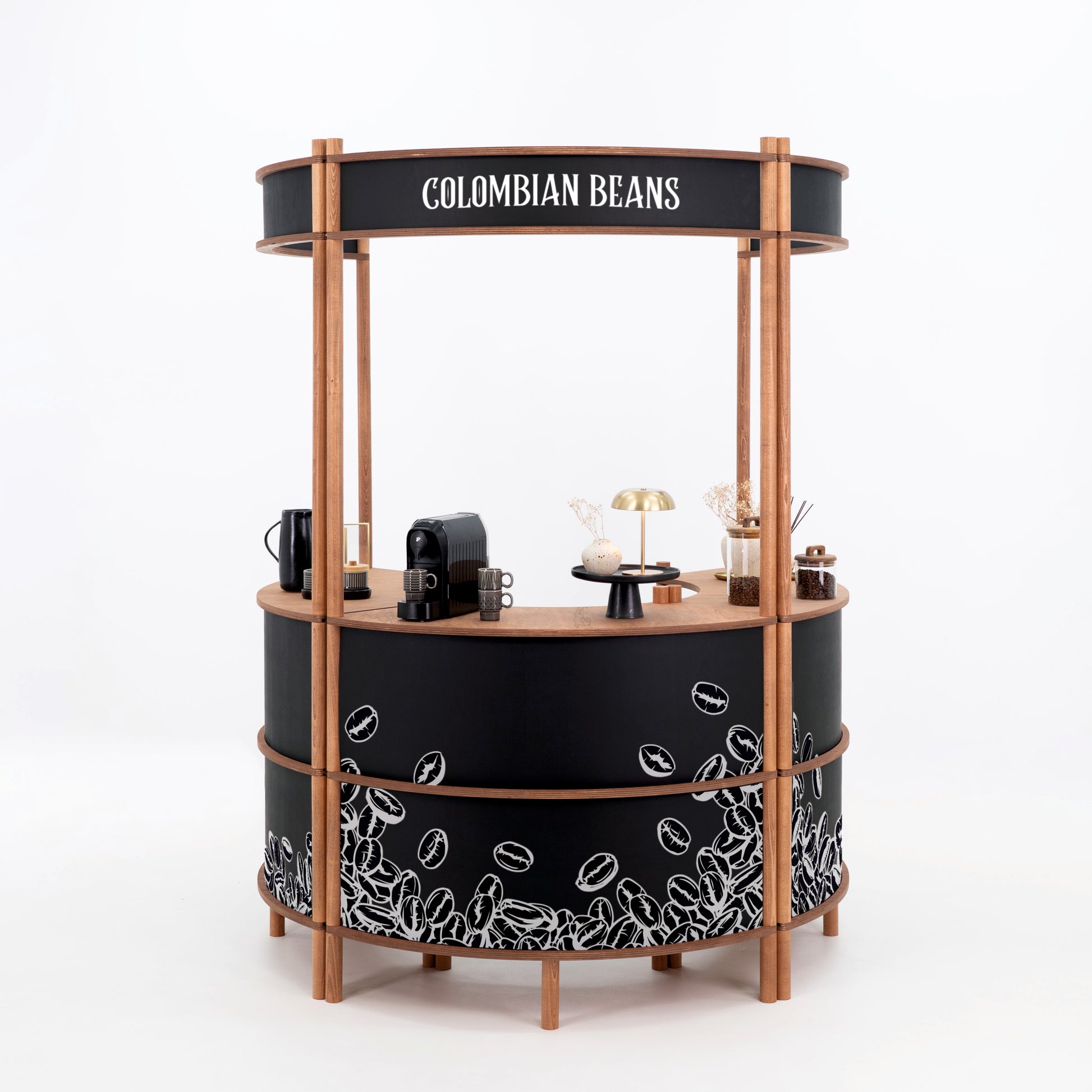 Disponible en configuration demi-cercle ou trois-quarts de cercle. La structure, le plan de travail et les étagères intérieures sont proposés en coloris coffee, apportant à l’ensemble un caractère chaleureux, premium et orienté design, parfaitement adapté aux univers cosmétique, lifestyle, food & beverage, hospitality et retail haut de gamme. Tous les panneaux courbés en contreplaqué peuvent être réalisés dans n’importe quelle couleur RAL ou NCS, afin d’aligner parfaitement la station avec votre palette de campagne, votre identité de marque ou votre scénographie événementielle. Pour un storytelling visuel encore plus fort, ces panneaux peuvent également être personnalisés avec logos, typographie, stickers, illustrations ou impressions grand format, transformant l’installation en un point focal de marque à fort impact, visible depuis plusieurs angles. Grâce à son montage vissé sans outils, la structure reste rapide à installer, pratique pour un usage répété et facile à transporter d’un lieu à l’autre.
