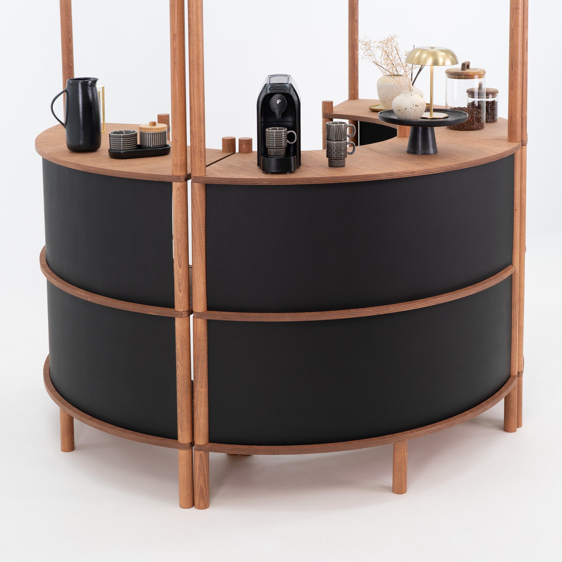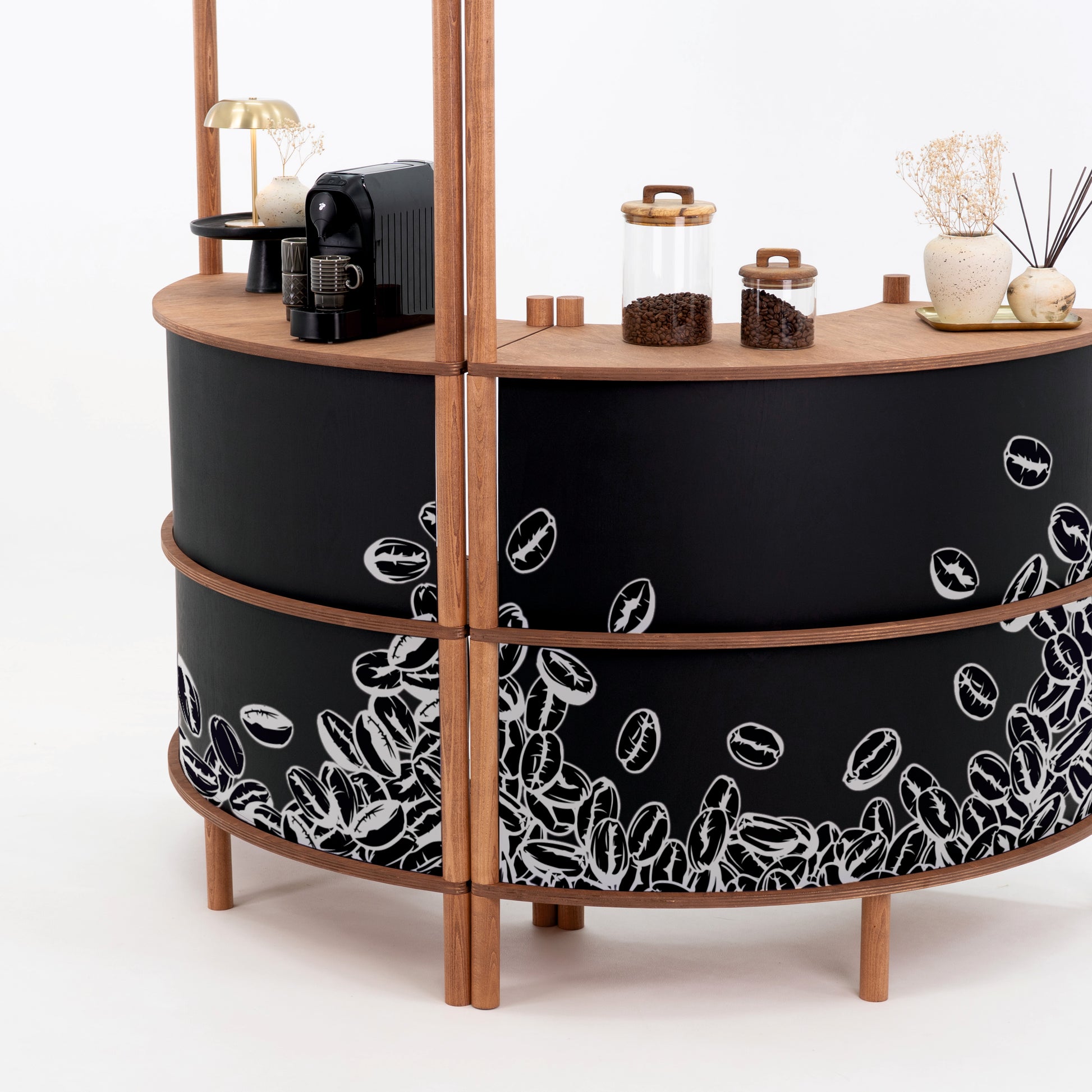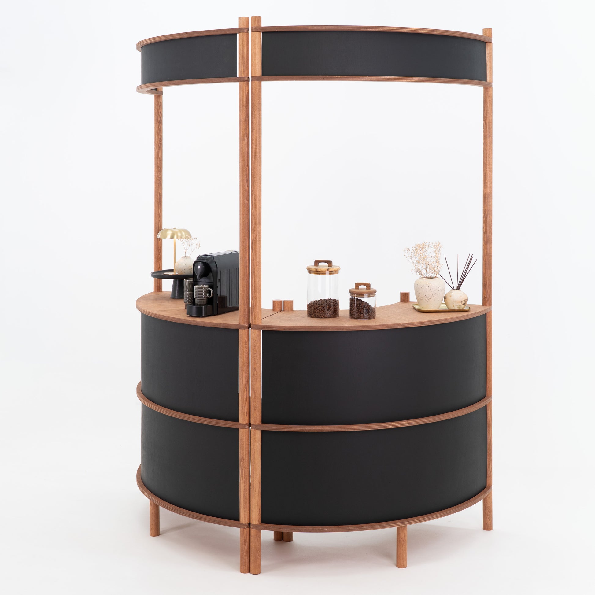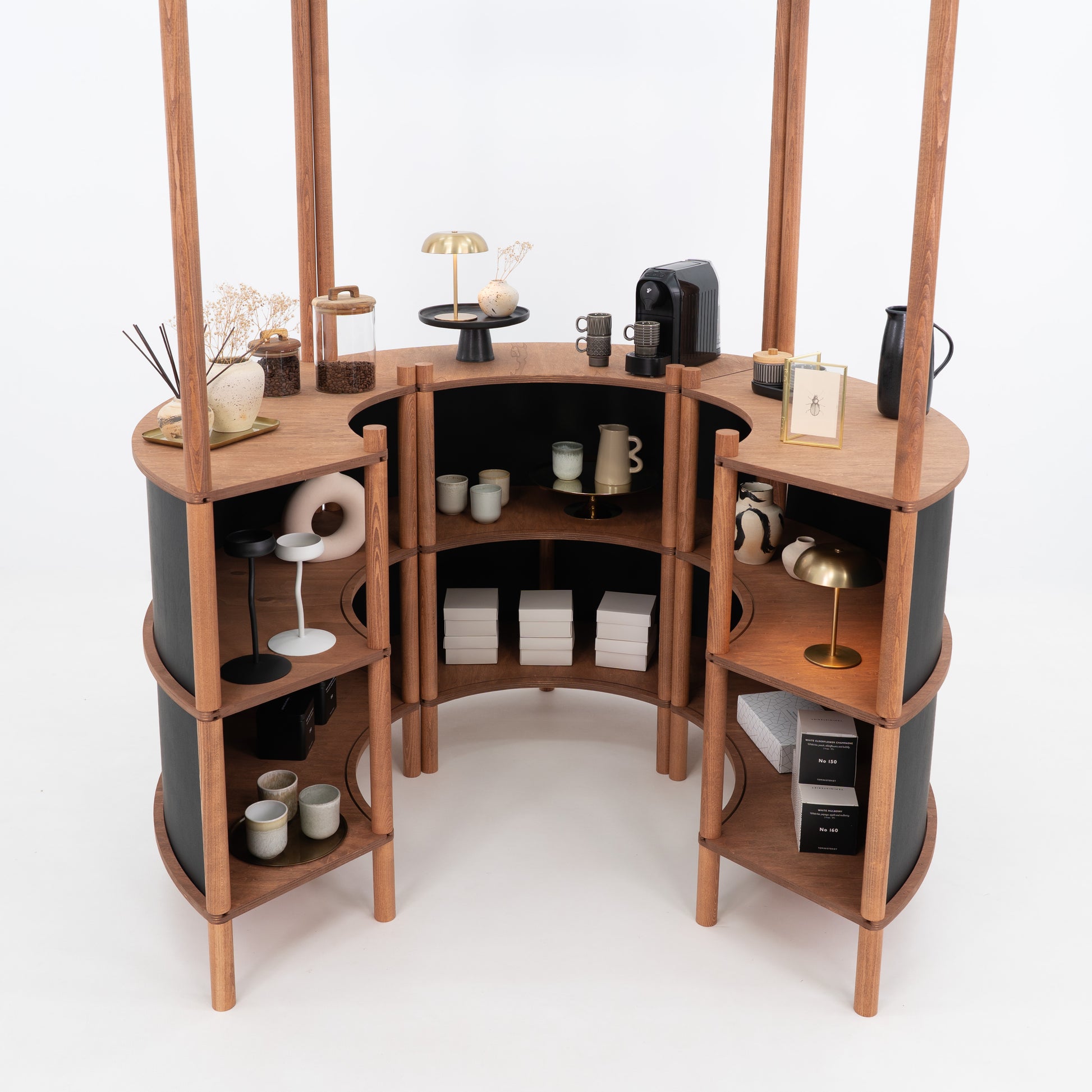Disponible en configuration demi-cercle ou trois-quarts de cercle. La structure, le plan de travail et les étagères intérieures sont proposés en coloris coffee, apportant à l’ensemble un caractère chaleureux, premium et orienté design, parfaitement adapté aux univers cosmétique, lifestyle, food & beverage, hospitality et retail haut de gamme. Tous les panneaux courbés en contreplaqué peuvent être réalisés dans n’importe quelle couleur RAL ou NCS, afin d’aligner parfaitement la station avec votre palette de campagne, votre identité de marque ou votre scénographie événementielle. Pour un storytelling visuel encore plus fort, ces panneaux peuvent également être personnalisés avec logos, typographie, stickers, illustrations ou impressions grand format, transformant l’installation en un point focal de marque à fort impact, visible depuis plusieurs angles. Grâce à son montage vissé sans outils, la structure reste rapide à installer, pratique pour un usage répété et facile à transporter d’un lieu à l’autre.