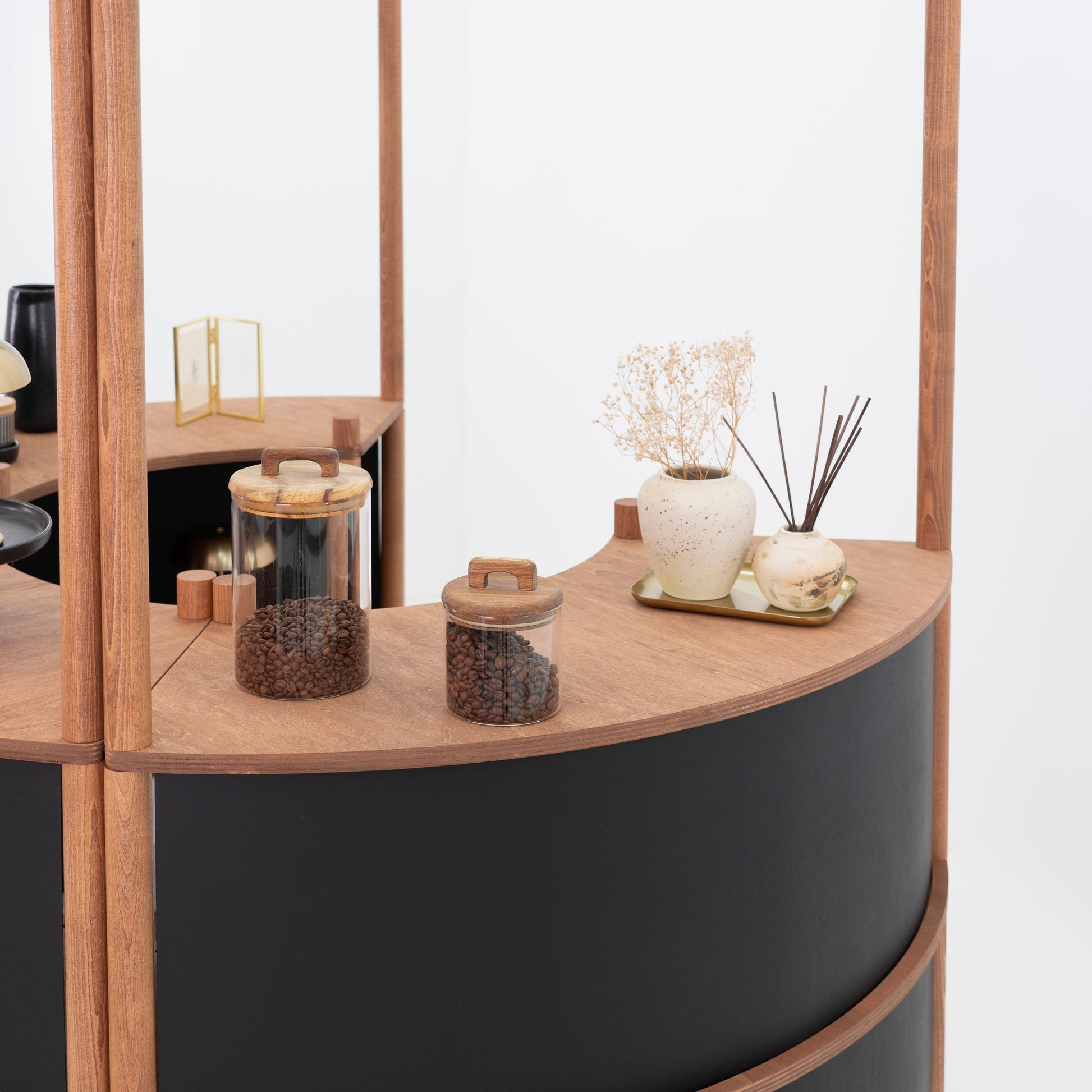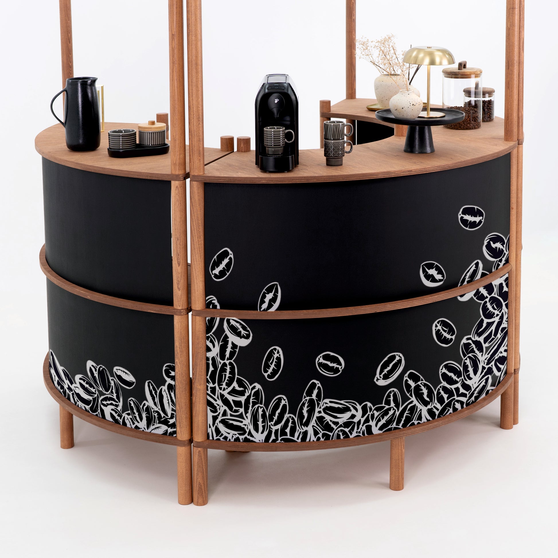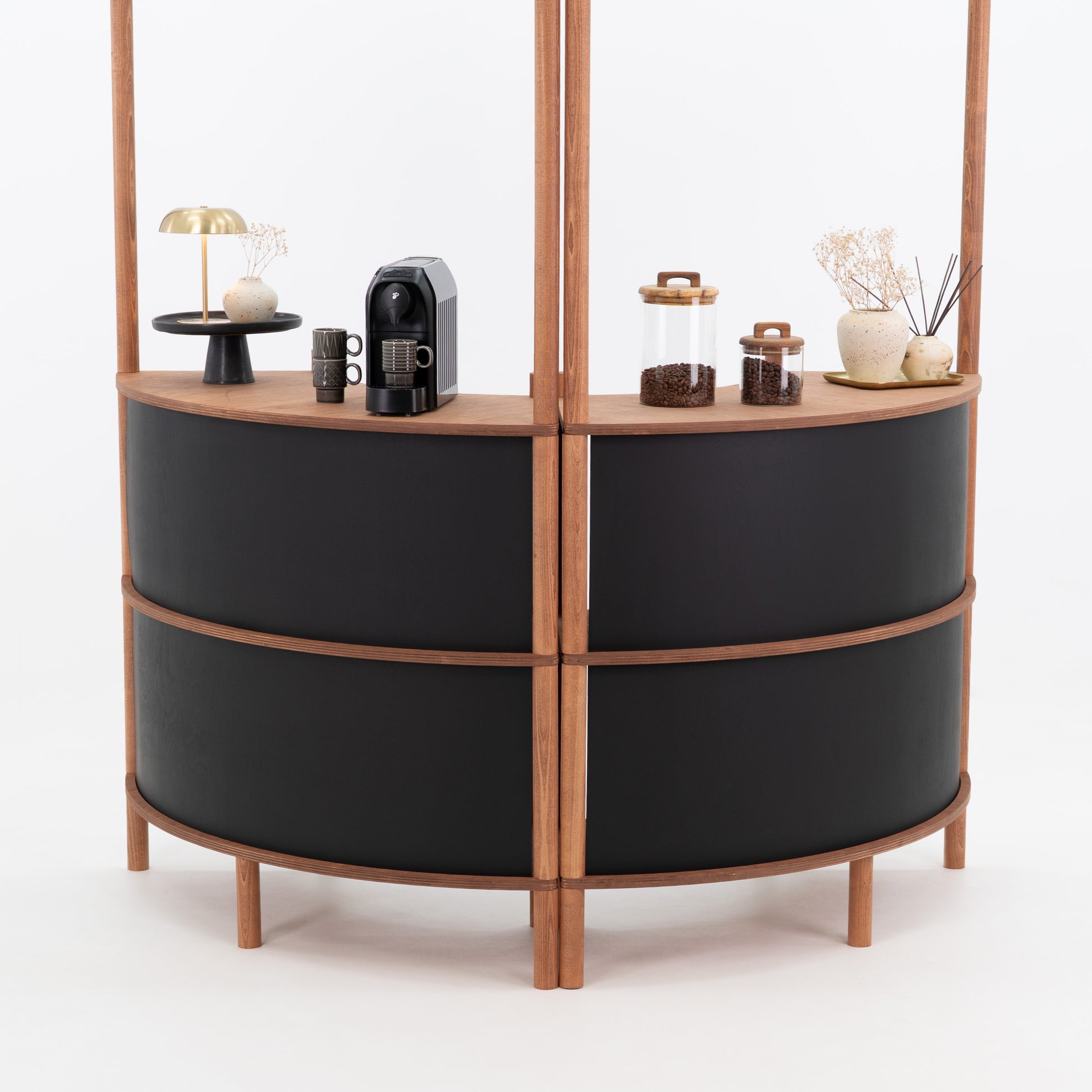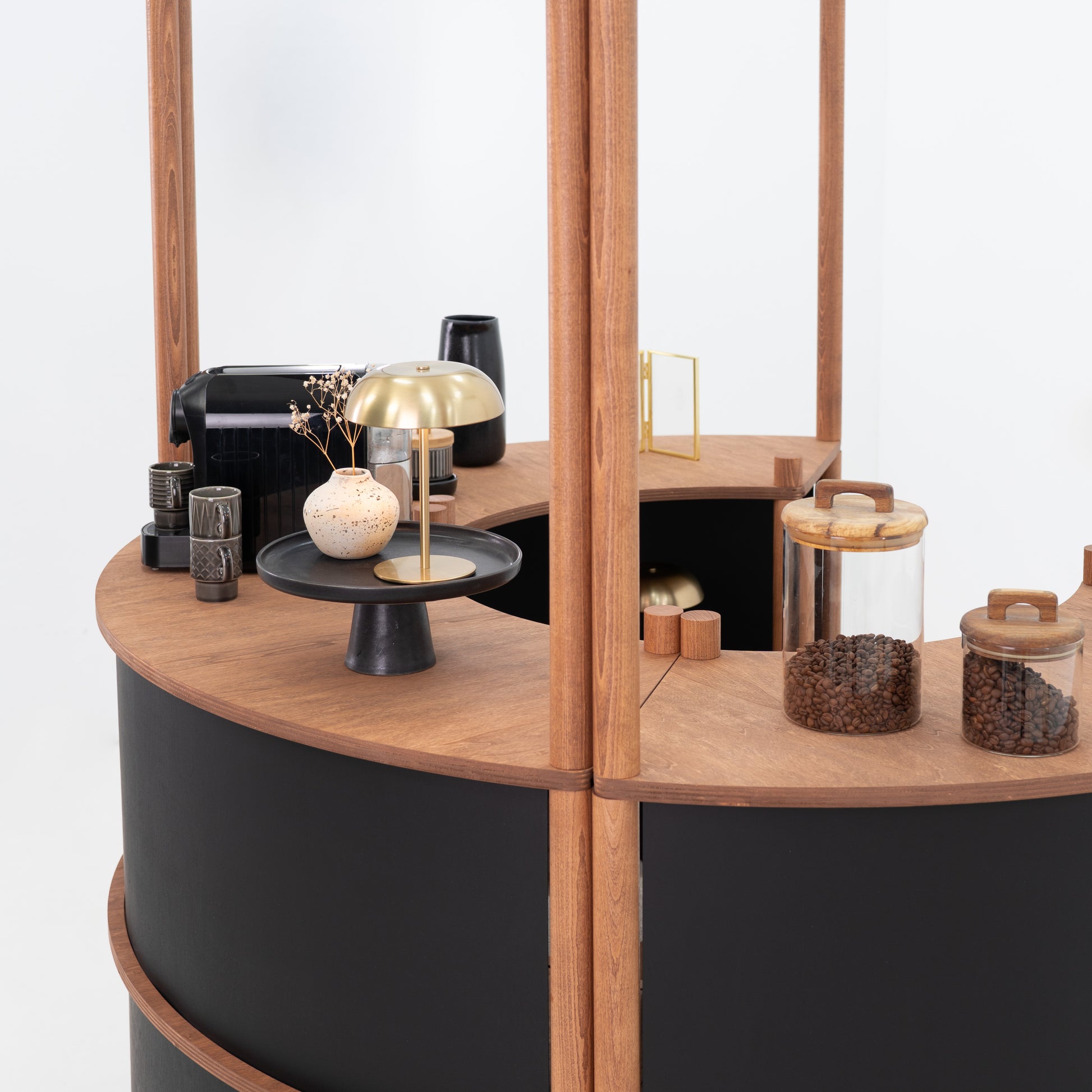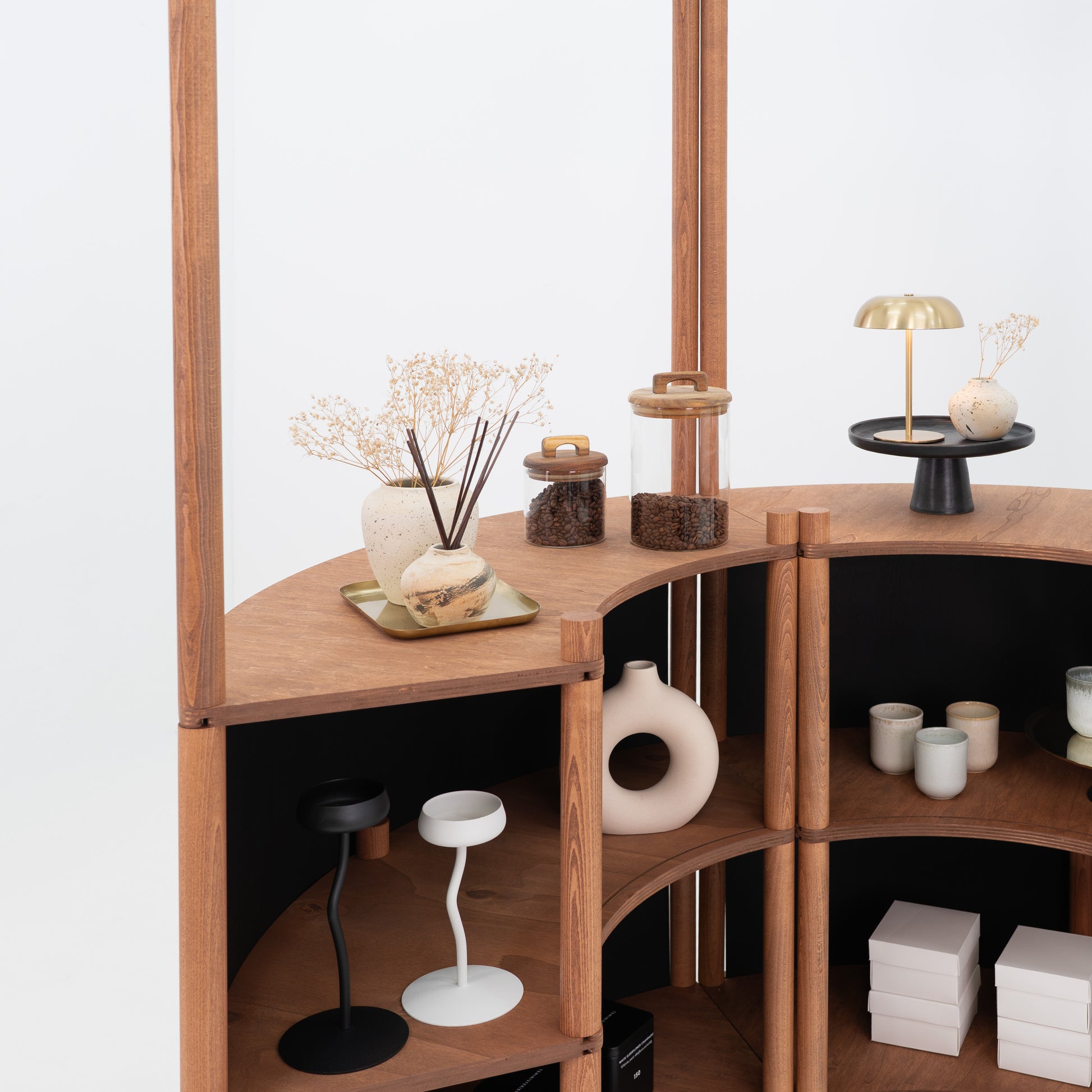 Disponible en configuration demi-cercle ou trois-quarts de cercle. La structure, le plan de travail et les étagères intérieures sont proposés en coloris coffee, apportant à l’ensemble un caractère chaleureux, premium et orienté design, parfaitement adapté aux univers cosmétique, lifestyle, food & beverage, hospitality et retail haut de gamme. Tous les panneaux courbés en contreplaqué peuvent être réalisés dans n’importe quelle couleur RAL ou NCS, afin d’aligner parfaitement la station avec votre palette de campagne, votre identité de marque ou votre scénographie événementielle. Pour un storytelling visuel encore plus fort, ces panneaux peuvent également être personnalisés avec logos, typographie, stickers, illustrations ou impressions grand format, transformant l’installation en un point focal de marque à fort impact, visible depuis plusieurs angles. Grâce à son montage vissé sans outils, la structure reste rapide à installer, pratique pour un usage répété et facile à transporter d’un lieu à l’autre.