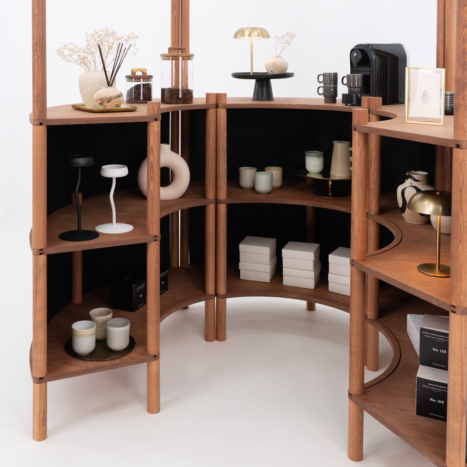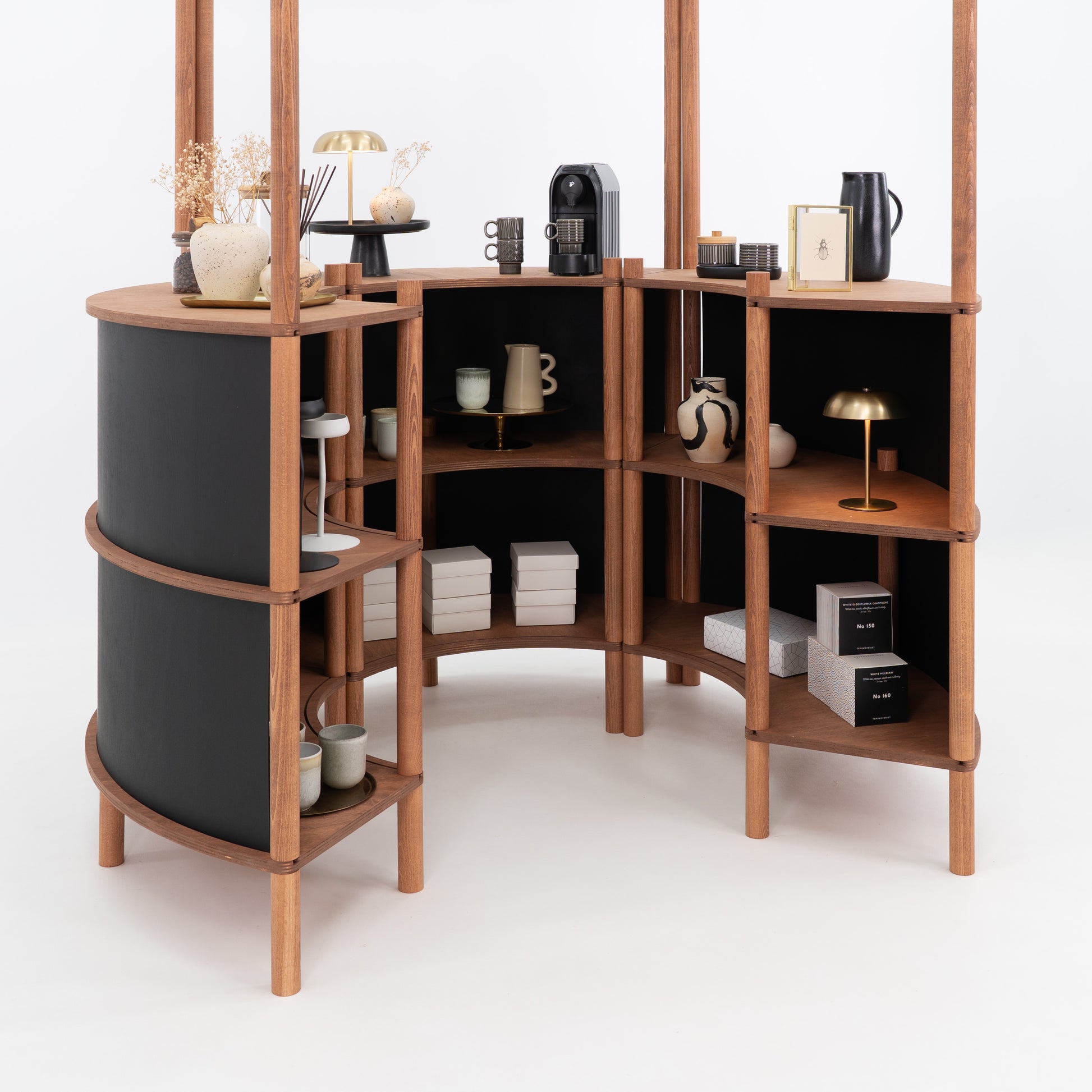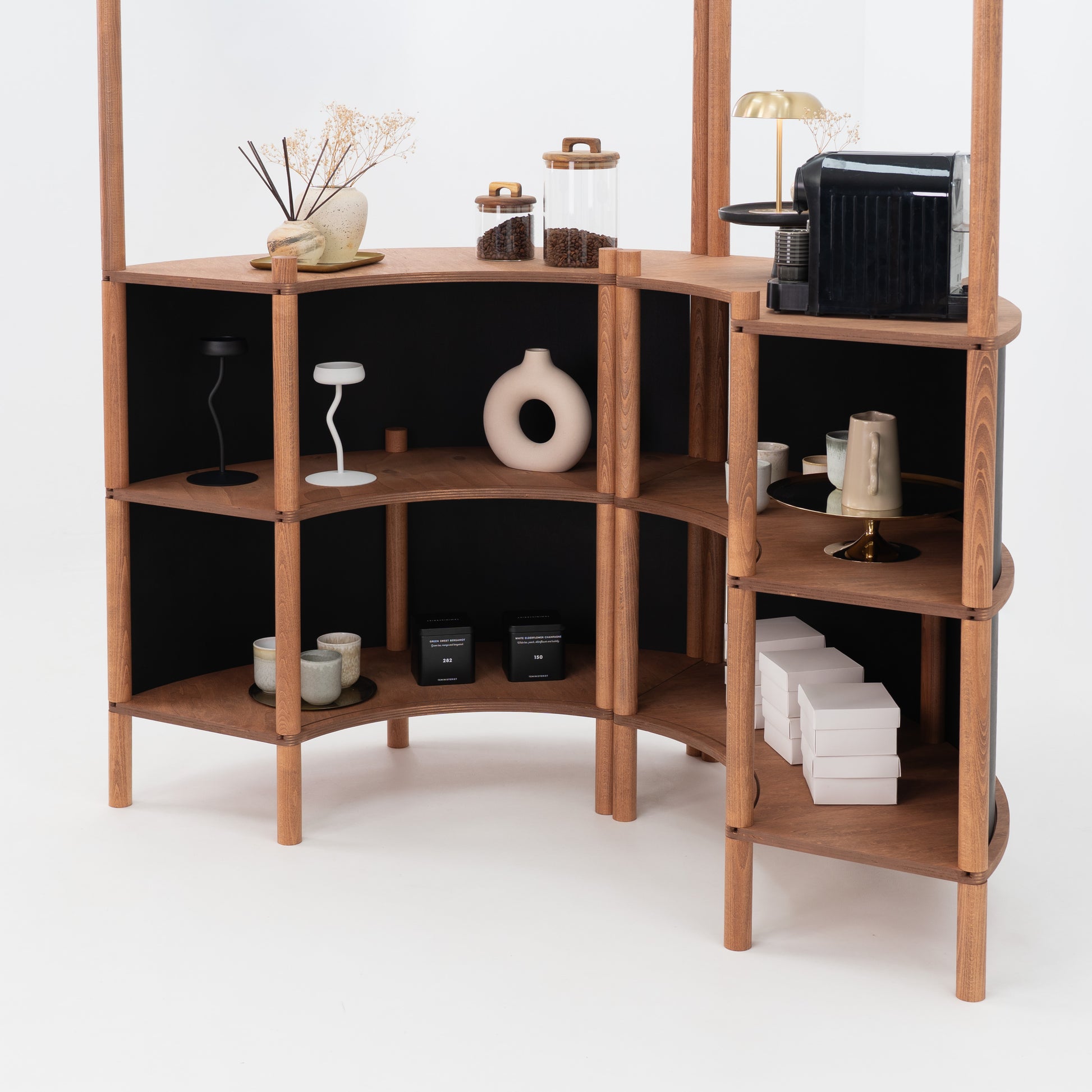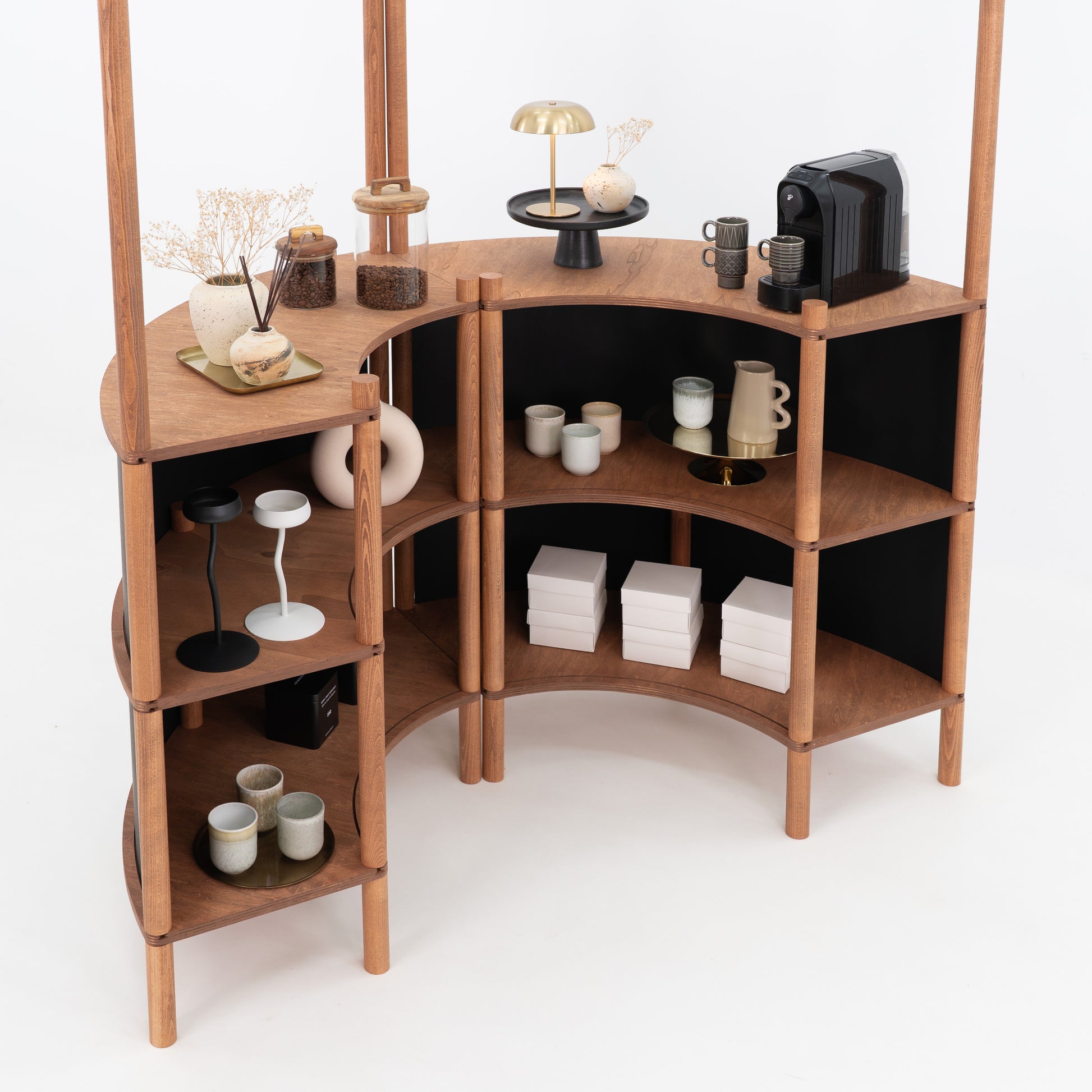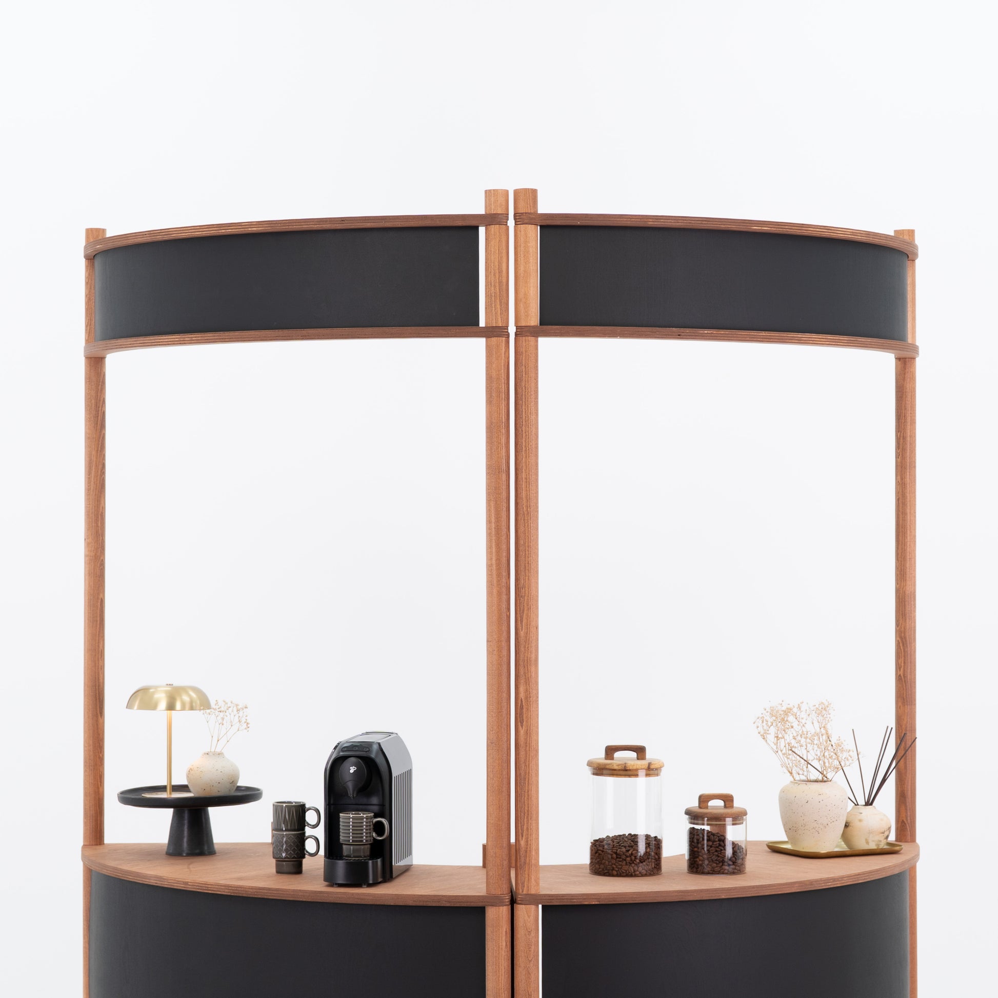 Disponible en configuration demi-cercle ou trois-quarts de cercle. La structure, le plan de travail et les étagères intérieures sont proposés en coloris coffee, apportant à l’ensemble un caractère chaleureux, premium et orienté design, parfaitement adapté aux univers cosmétique, lifestyle, food & beverage, hospitality et retail haut de gamme. Tous les panneaux courbés en contreplaqué peuvent être réalisés dans n’importe quelle couleur RAL ou NCS, afin d’aligner parfaitement la station avec votre palette de campagne, votre identité de marque ou votre scénographie événementielle. Pour un storytelling visuel encore plus fort, ces panneaux peuvent également être personnalisés avec logos, typographie, stickers, illustrations ou impressions grand format, transformant l’installation en un point focal de marque à fort impact, visible depuis plusieurs angles. Grâce à son montage vissé sans outils, la structure reste rapide à installer, pratique pour un usage répété et facile à transporter d’un lieu à l’autre.