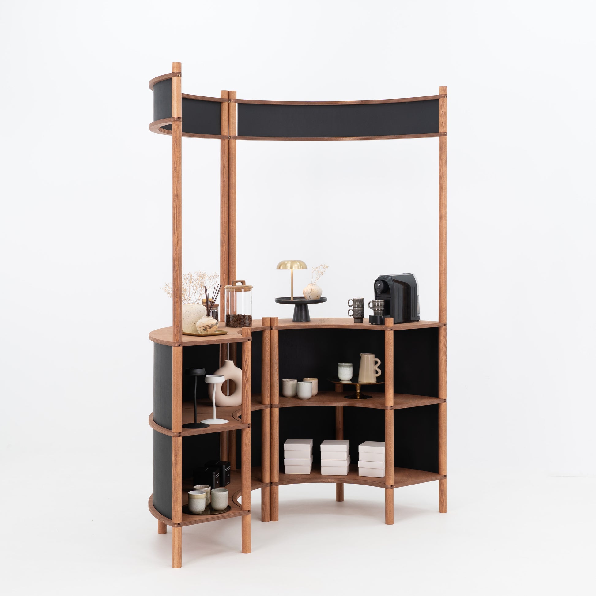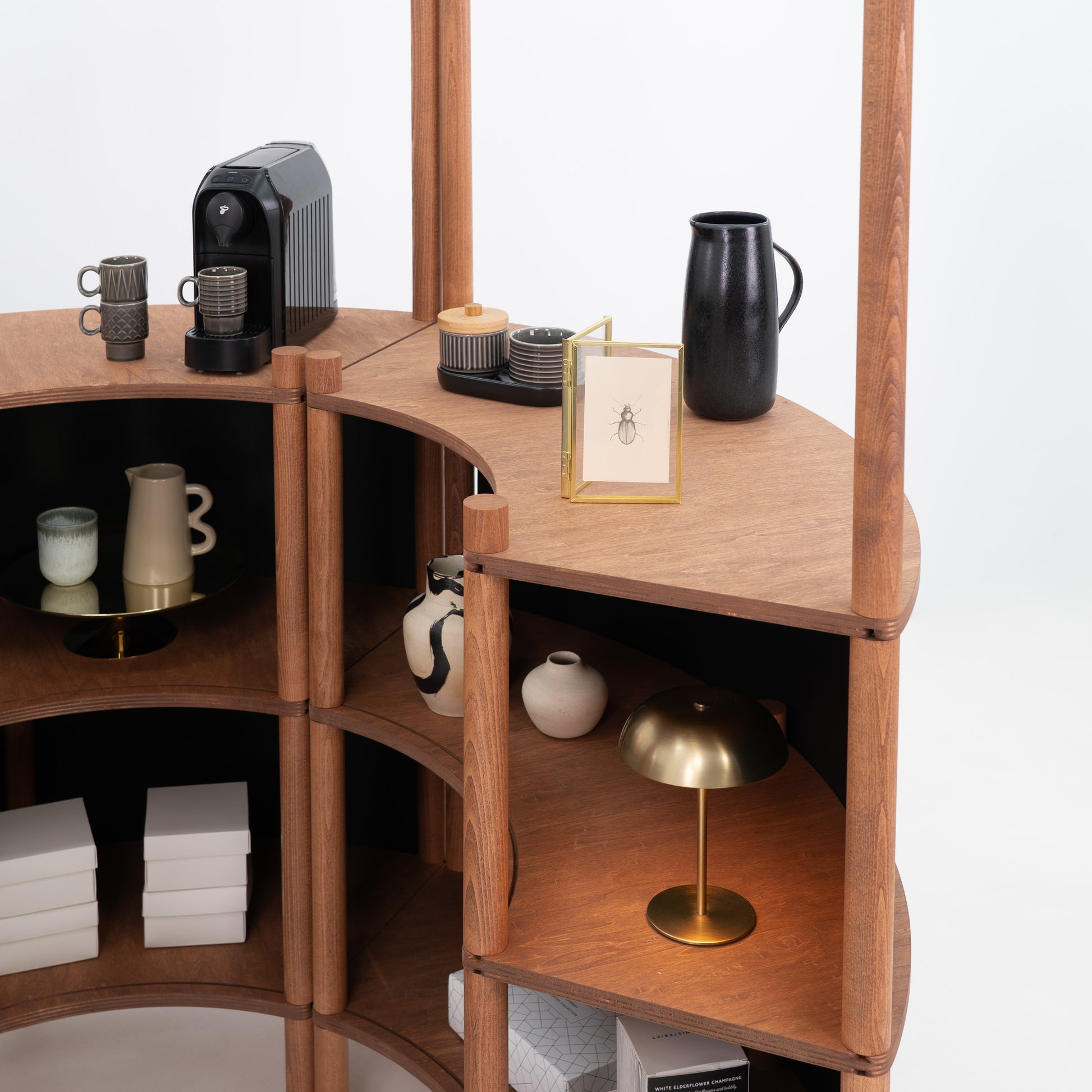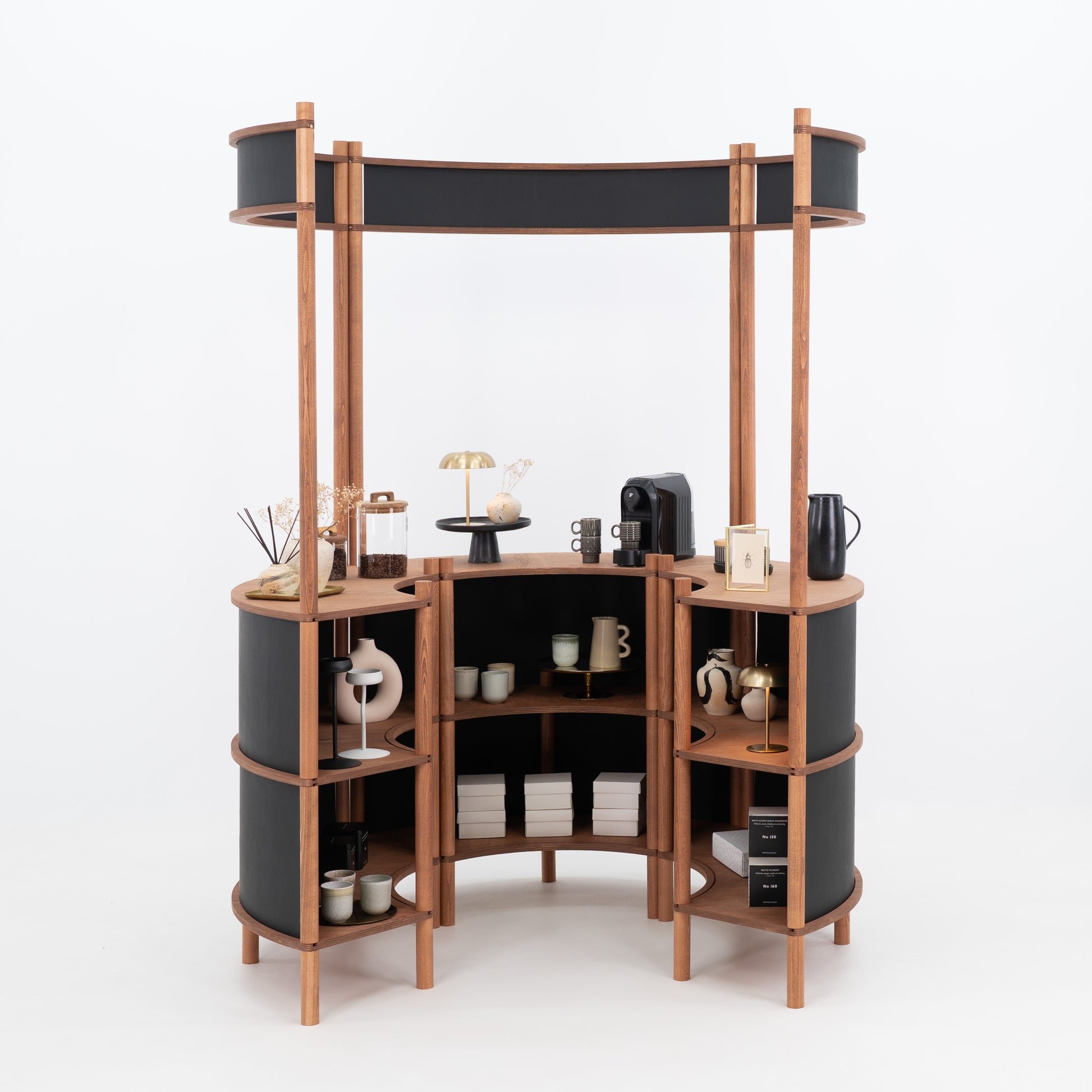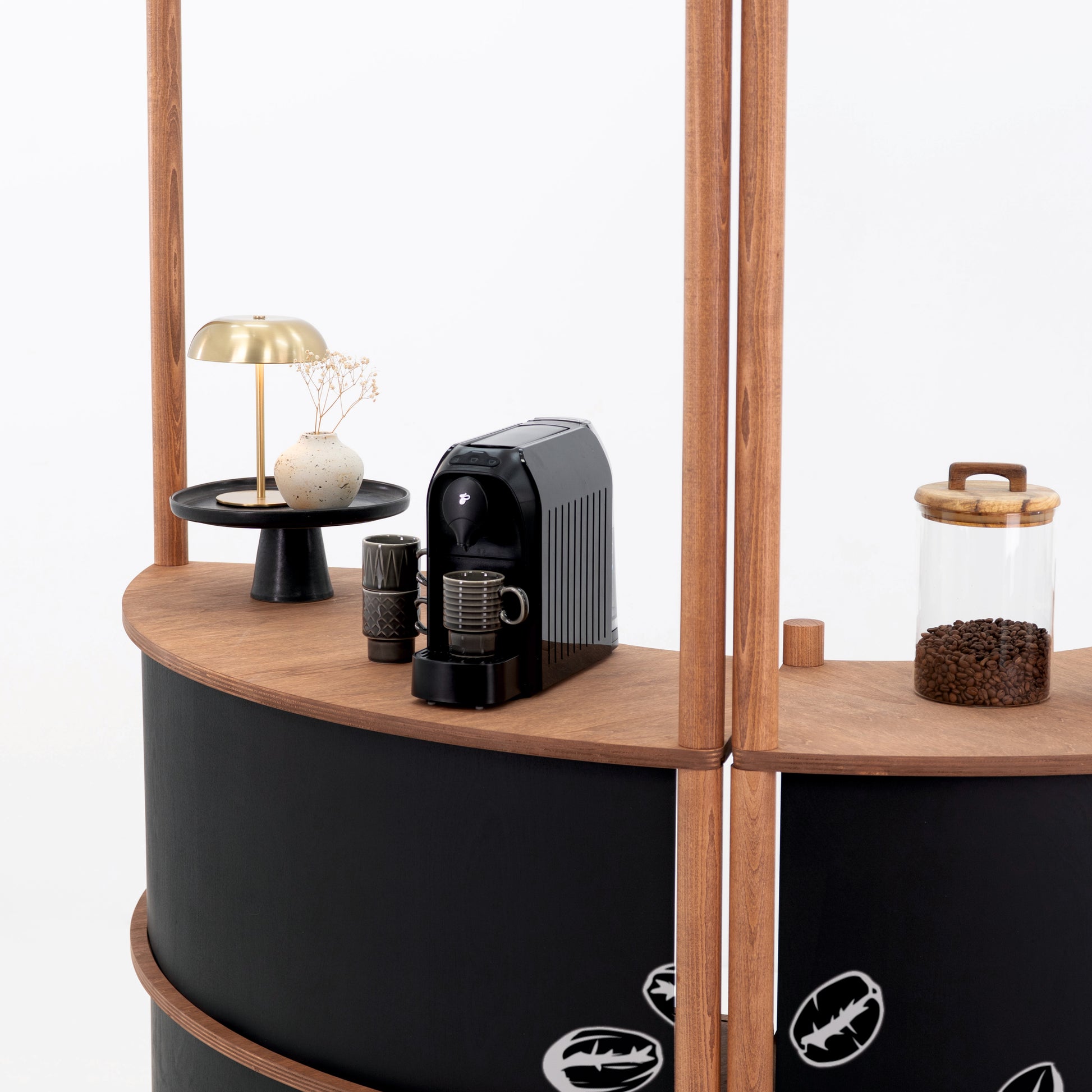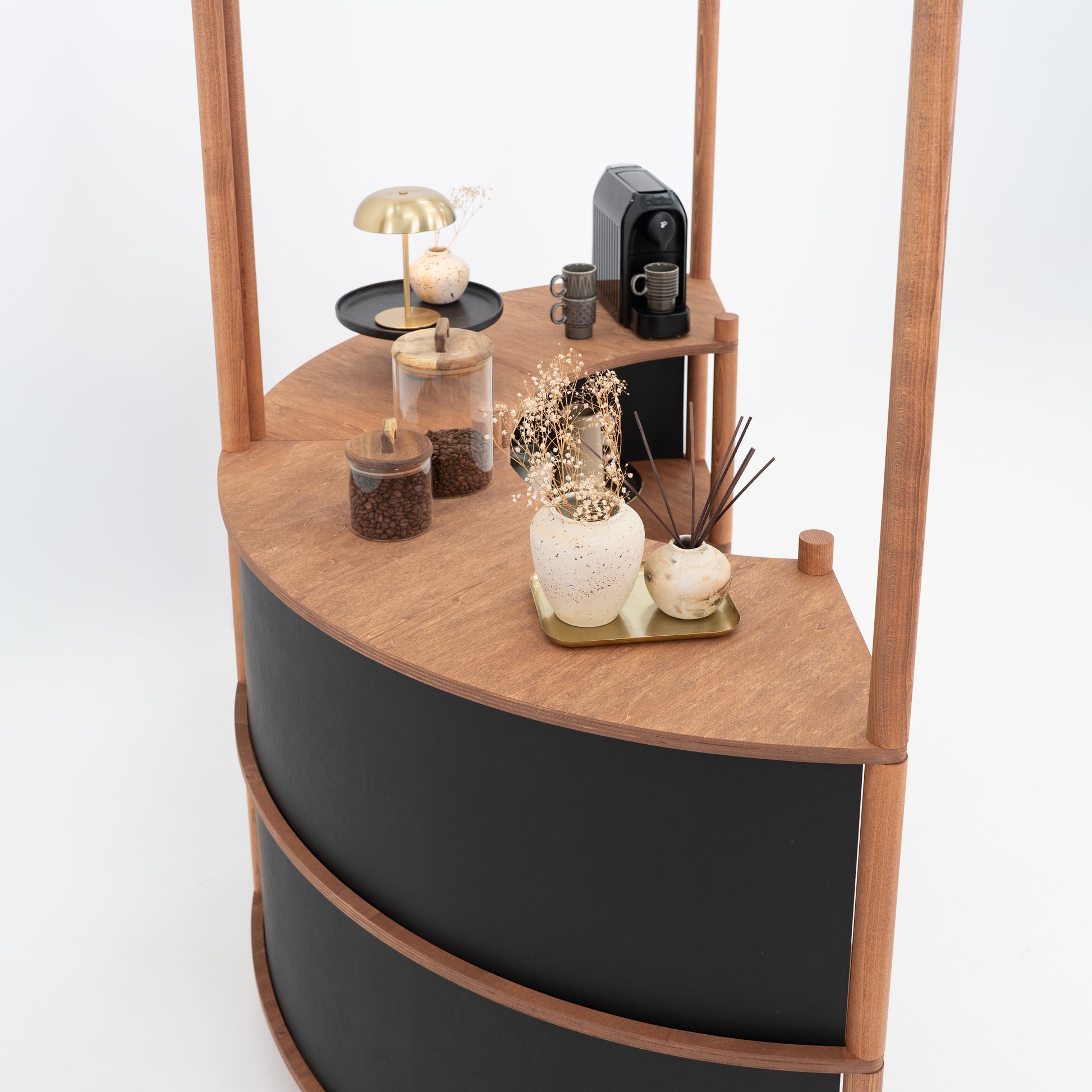 Disponible en configuration demi-cercle ou trois-quarts de cercle. La structure, le plan de travail et les étagères intérieures sont proposés en coloris coffee, apportant à l’ensemble un caractère chaleureux, premium et orienté design, parfaitement adapté aux univers cosmétique, lifestyle, food & beverage, hospitality et retail haut de gamme. Tous les panneaux courbés en contreplaqué peuvent être réalisés dans n’importe quelle couleur RAL ou NCS, afin d’aligner parfaitement la station avec votre palette de campagne, votre identité de marque ou votre scénographie événementielle. Pour un storytelling visuel encore plus fort, ces panneaux peuvent également être personnalisés avec logos, typographie, stickers, illustrations ou impressions grand format, transformant l’installation en un point focal de marque à fort impact, visible depuis plusieurs angles. Grâce à son montage vissé sans outils, la structure reste rapide à installer, pratique pour un usage répété et facile à transporter d’un lieu à l’autre.