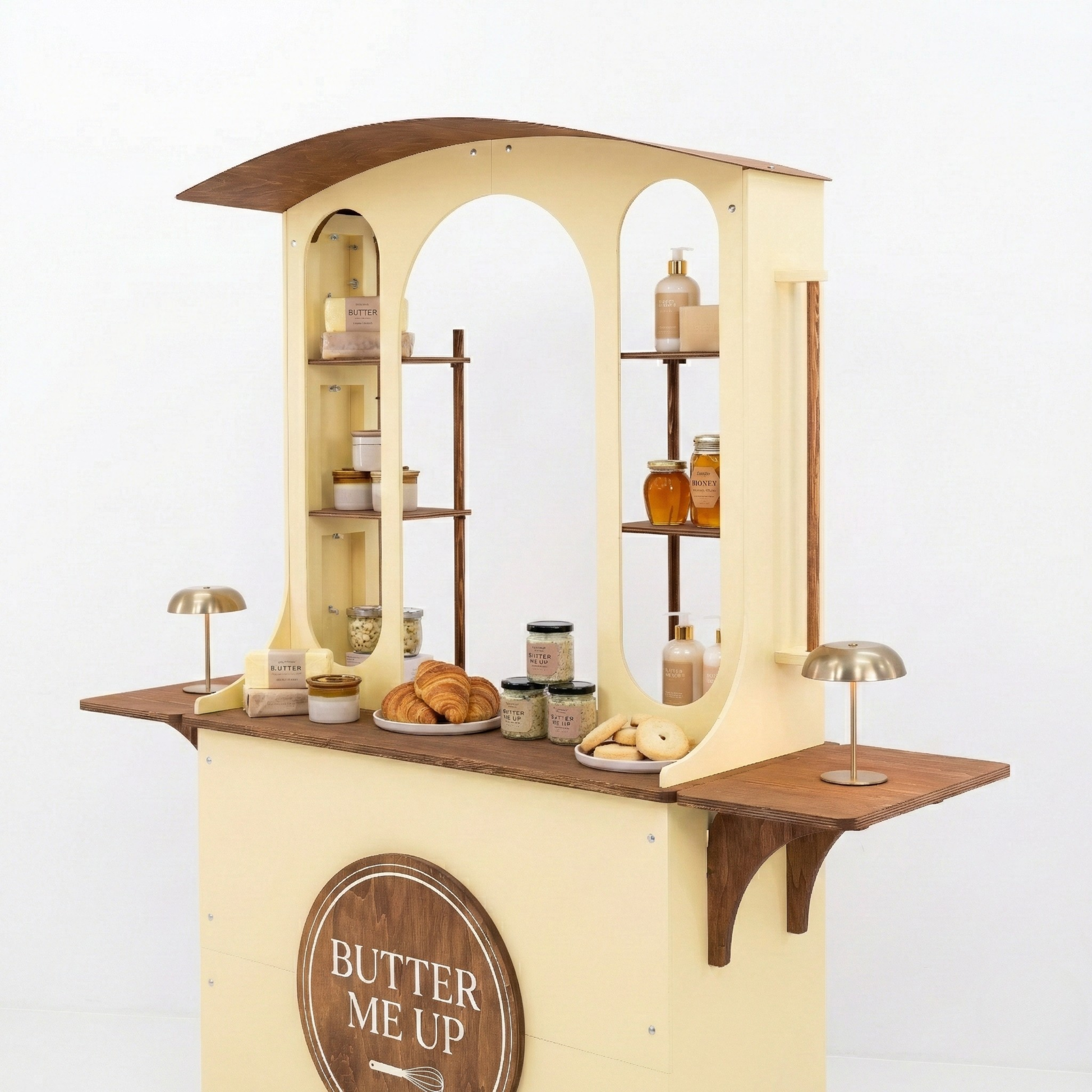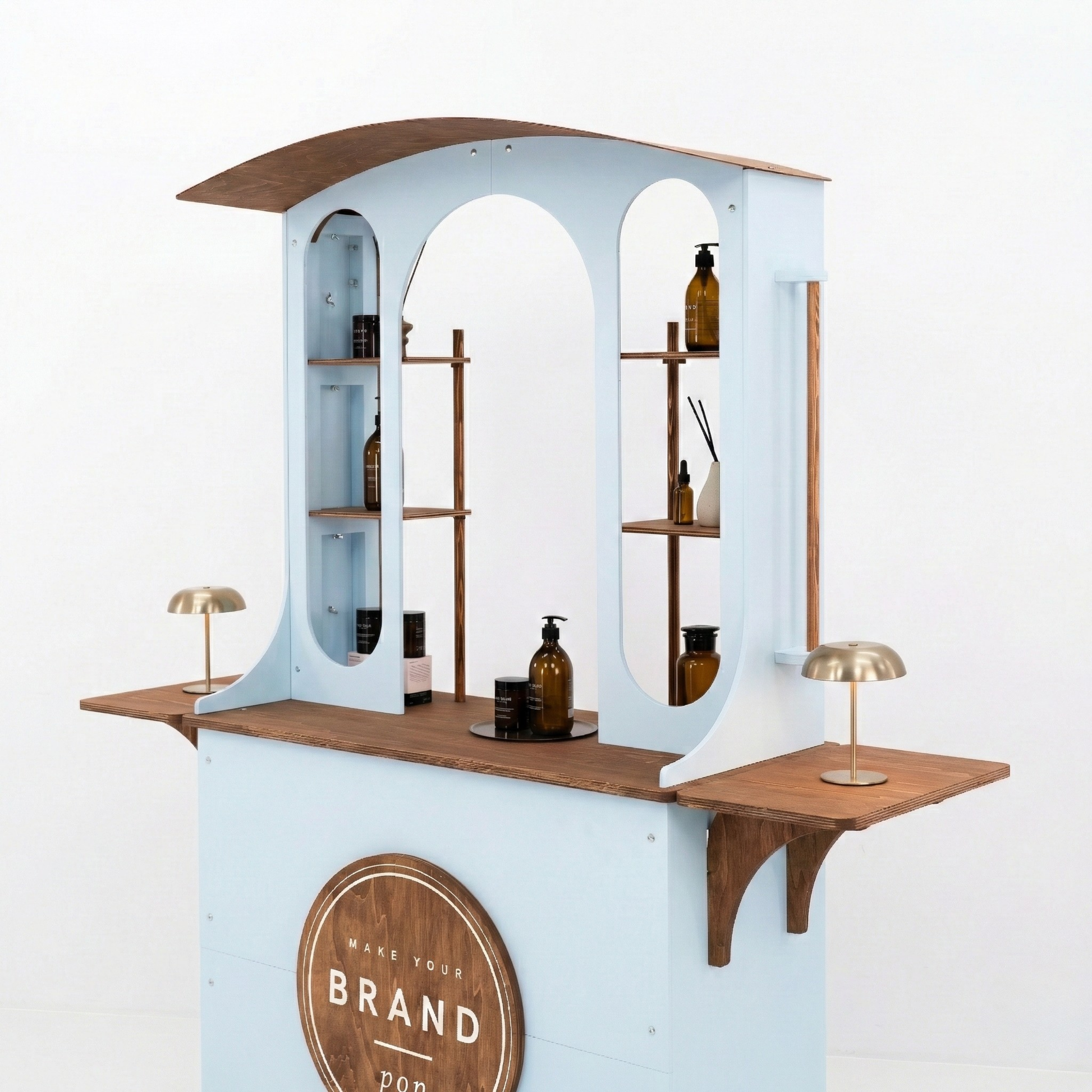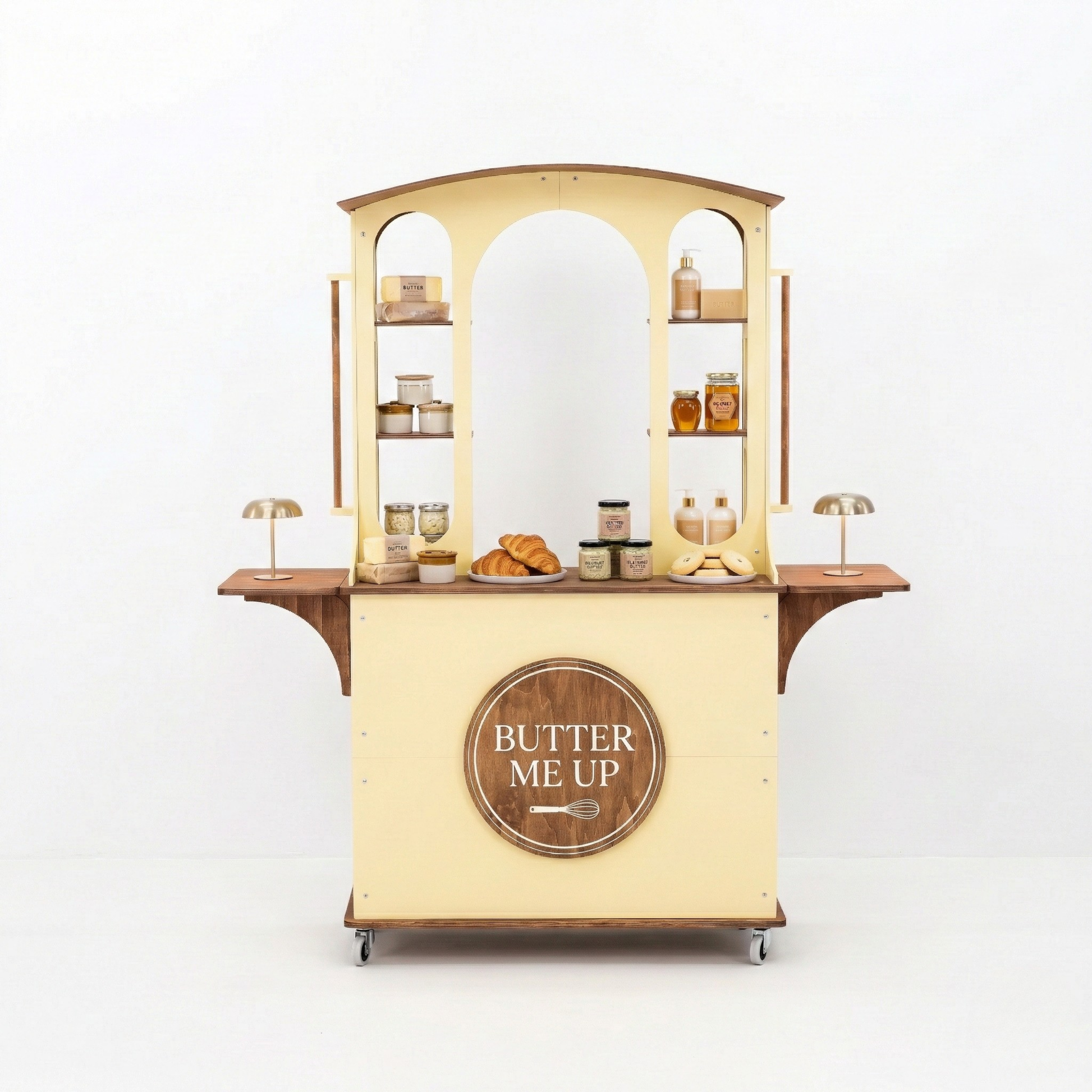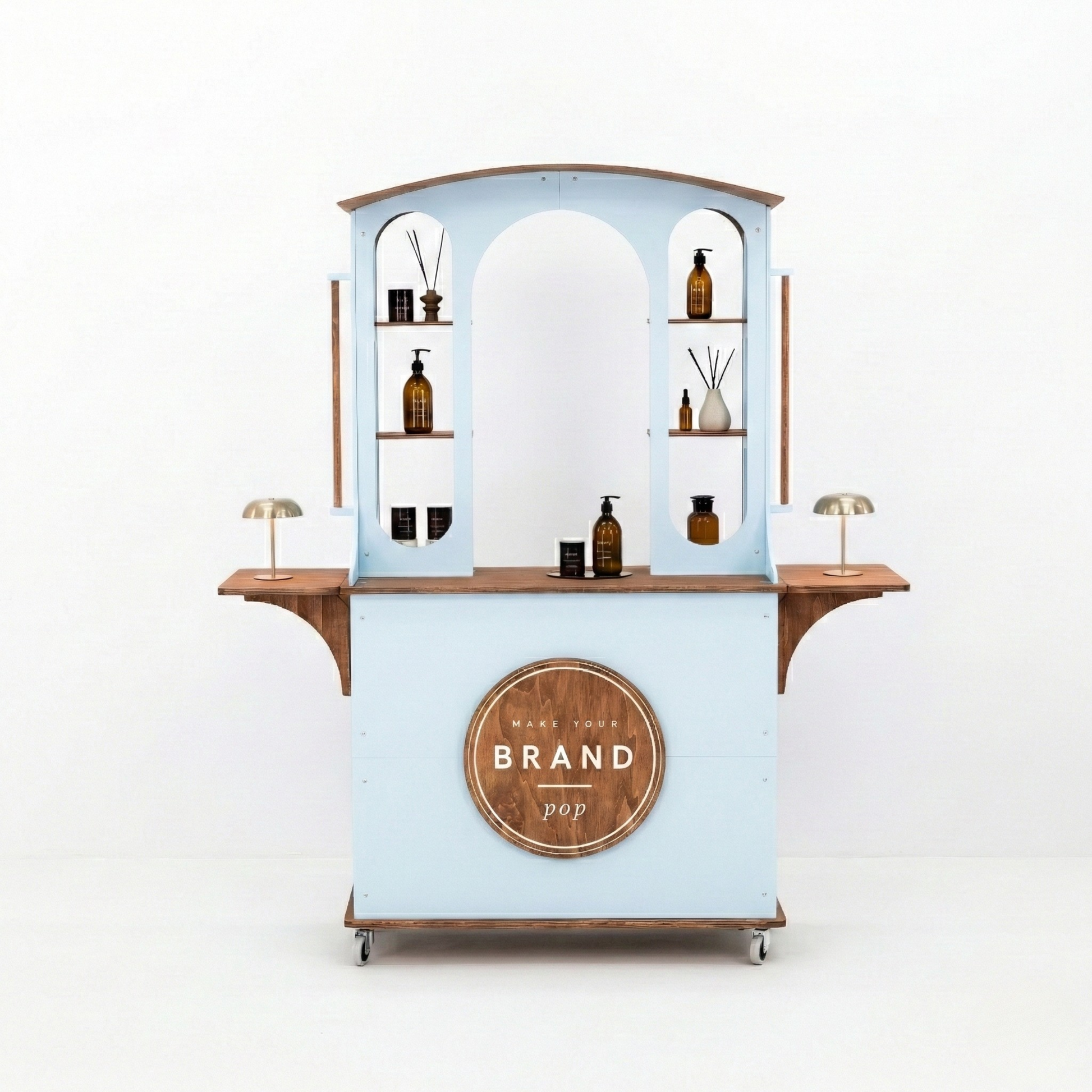 Le Wagon Bar est un présentoir mobile flexible conçu pour les événements marketing, parfait pour promouvoir divers produits, des boissons aux cosmétiques.
