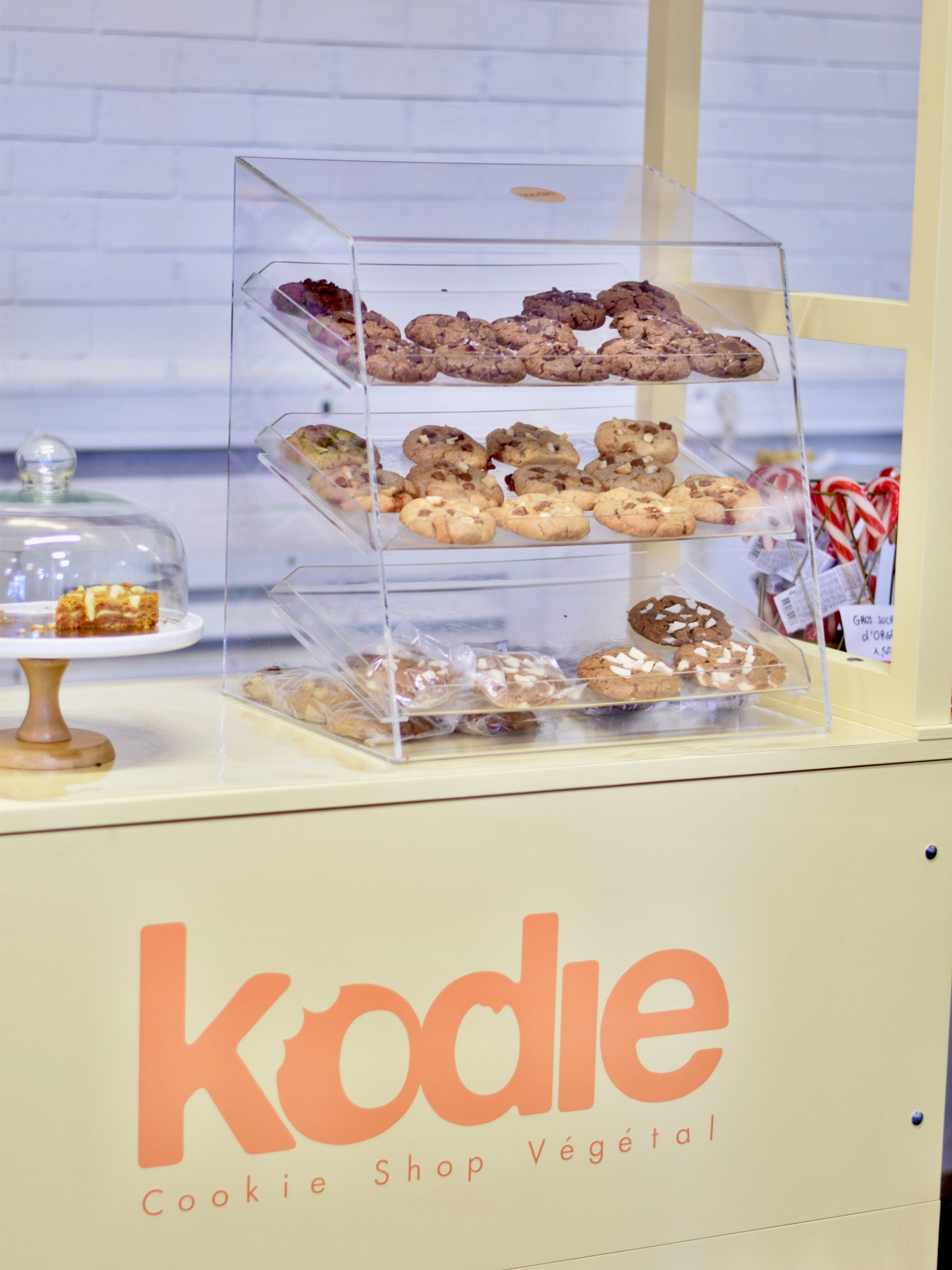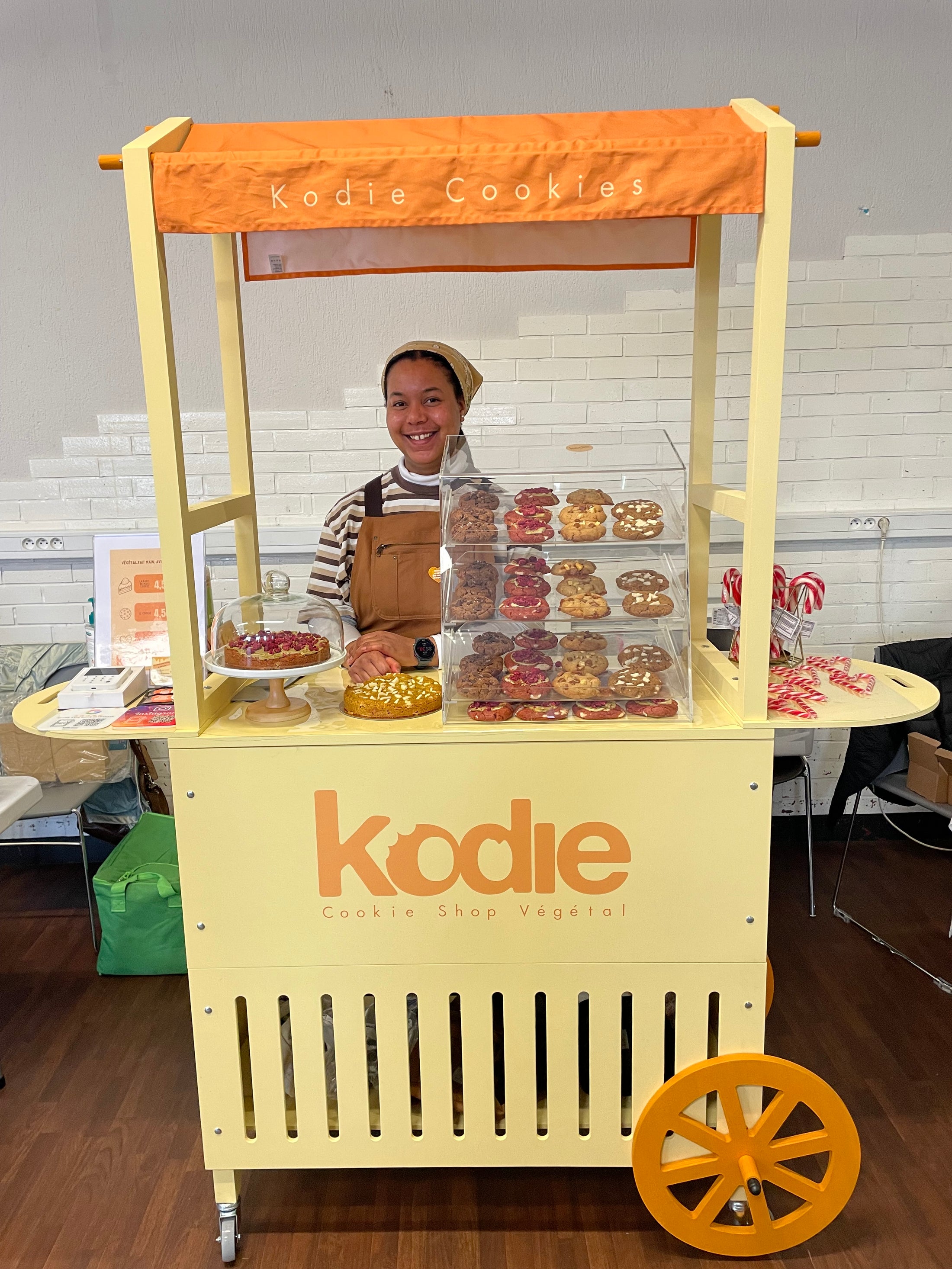 Custom event cart created for Kodle Cookies, a vegan cookie brand founded in 2024 in France. The cart is used as a mobile display for handmade, small-batch cookies during pop-ups and events, supporting regular in-person sales alongside nationwide shipping.