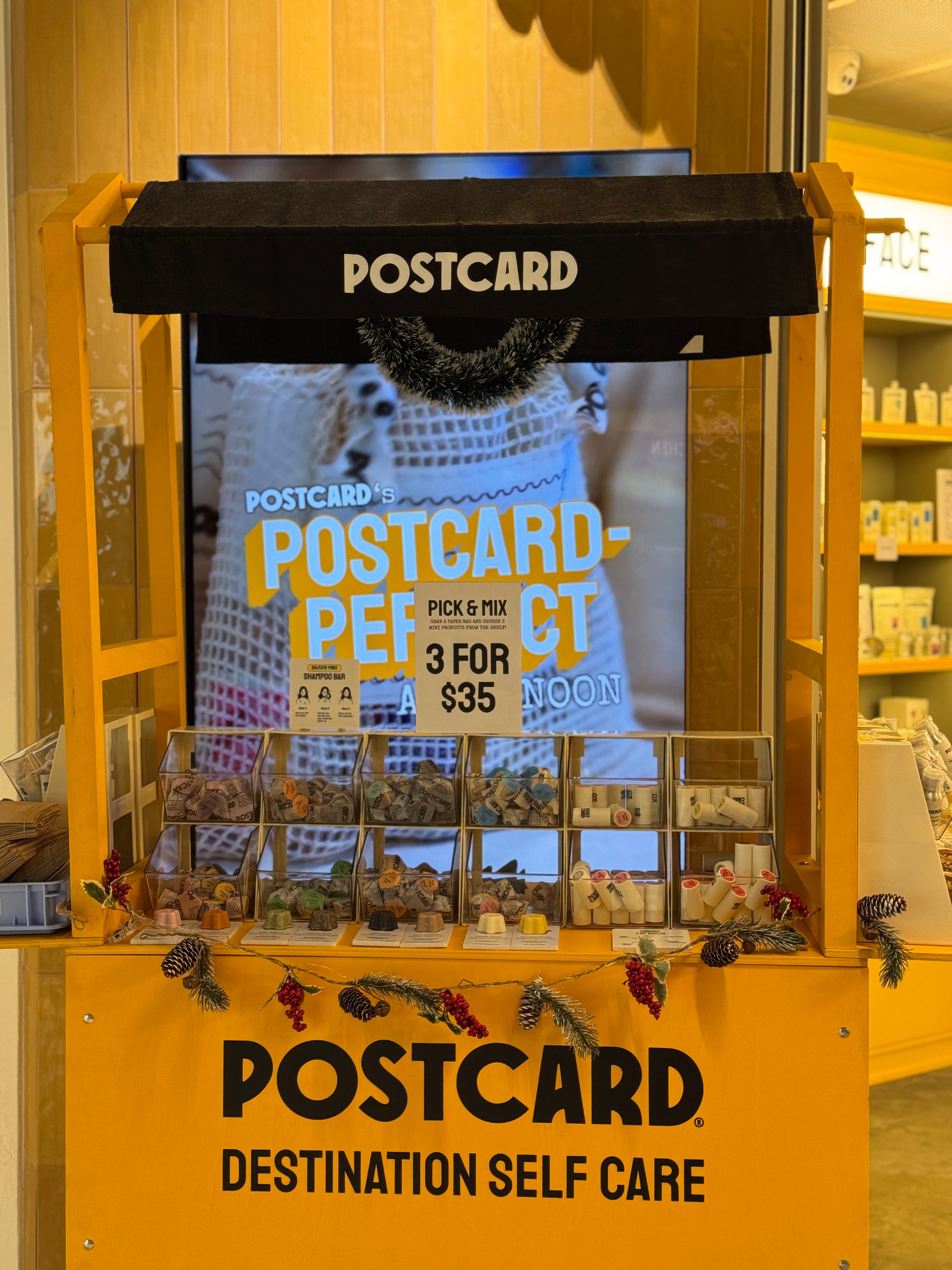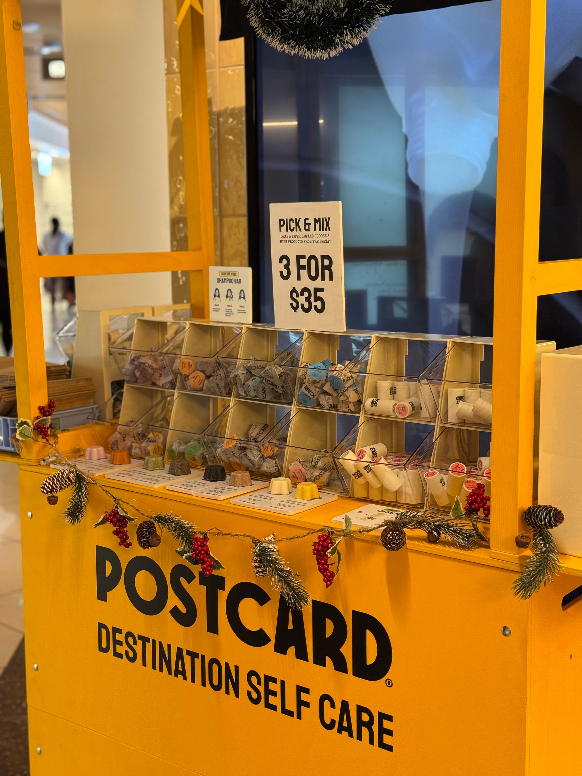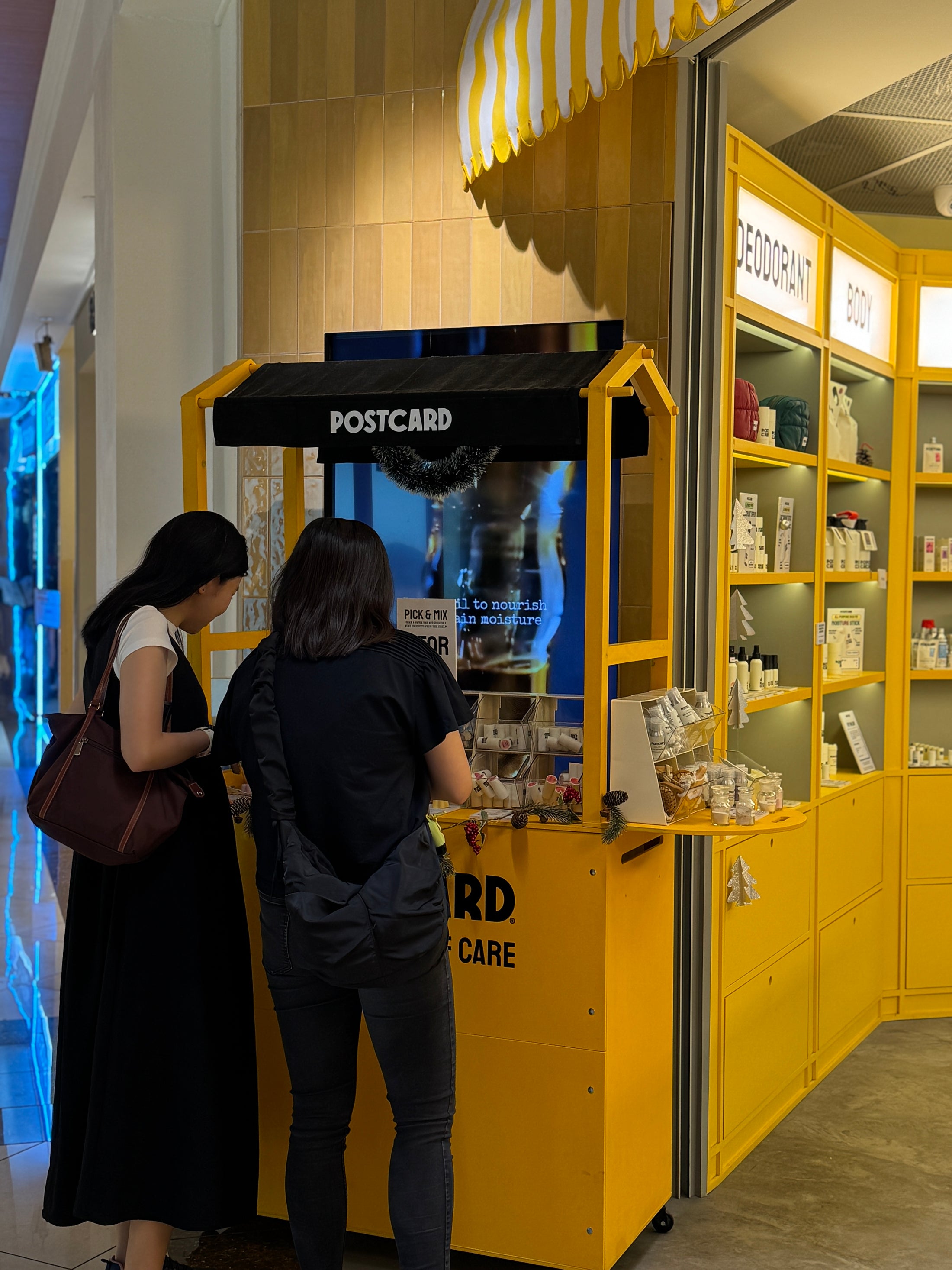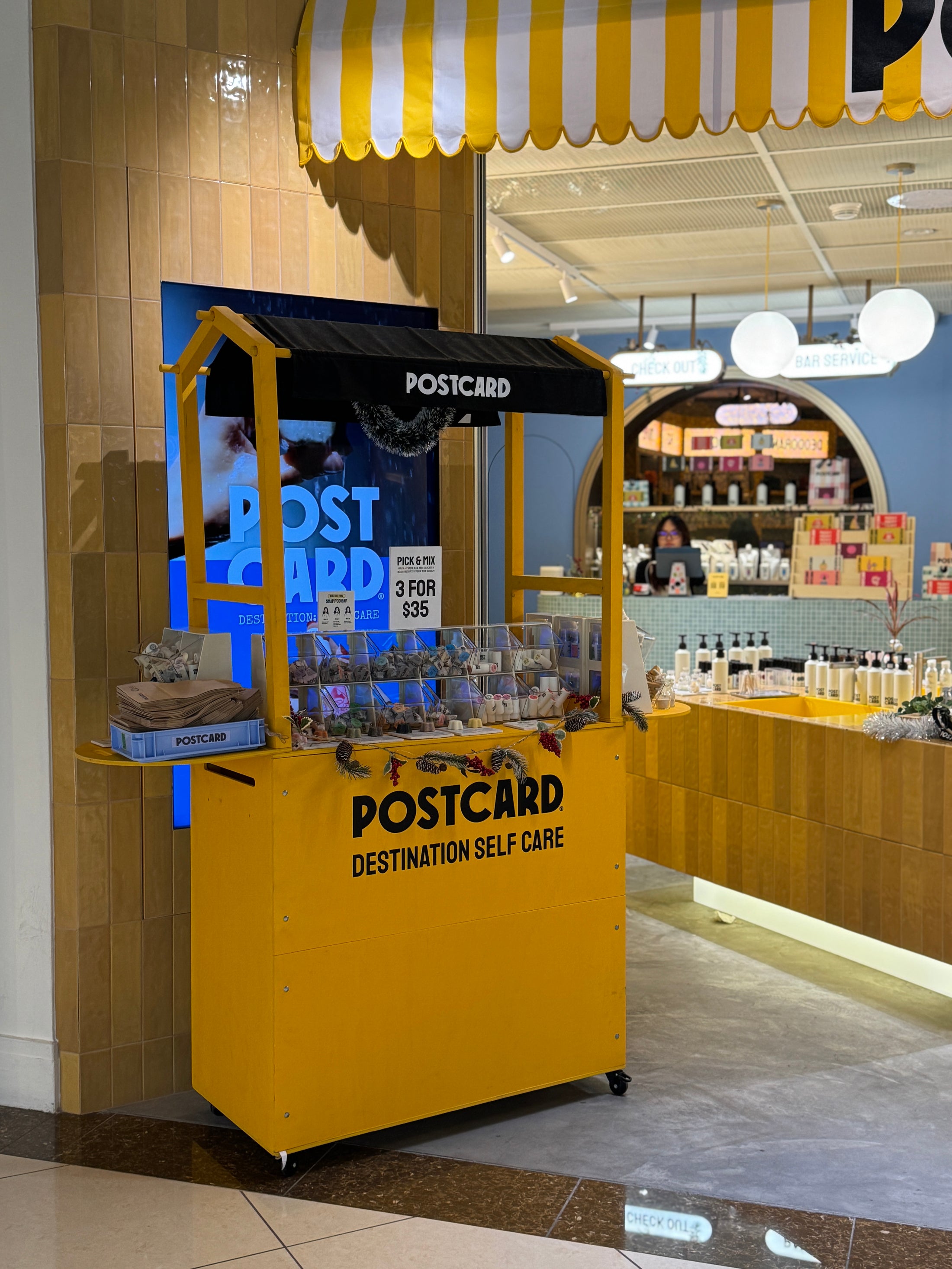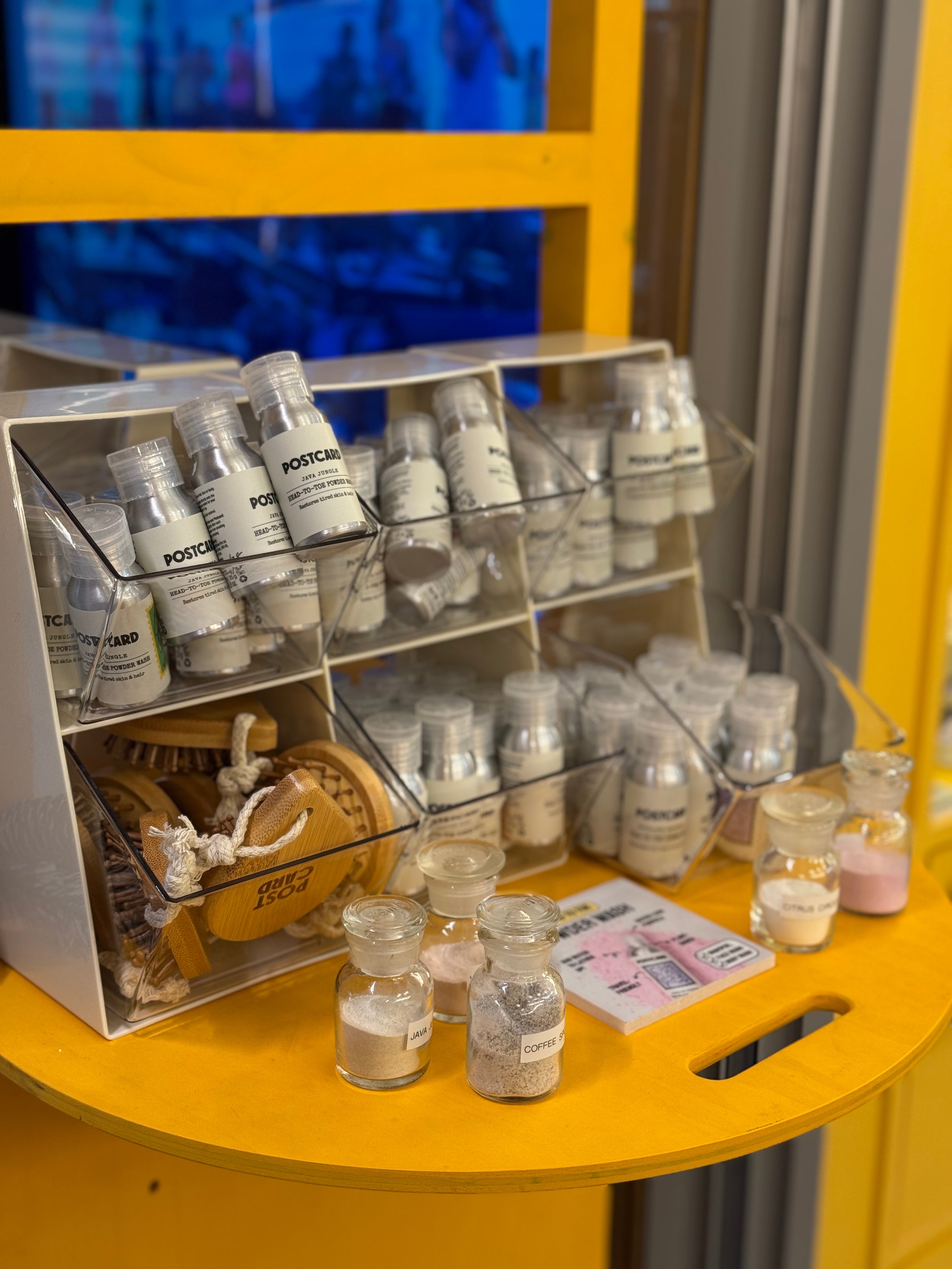 Custom mobile retail cart created for Postcard as an in-store activation. Finished in a bold yellow color to ensure high visibility, the cart was designed for easy folding, mobility, and quick setup. Used as a pop-up sales and display point inside a retail space, combining product presentation with compact storage and full branding.