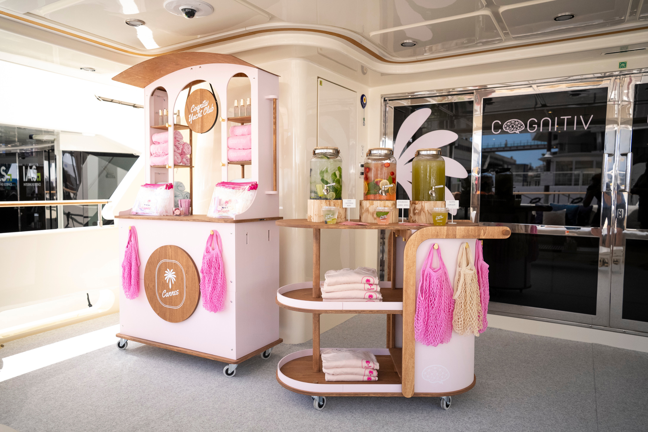 A coordinated set of two custom-designed mobile carts created for a summer brand activation. Developed as part of an experiential marketing setup, the carts supported both product presentation and customer interaction, while also serving as a dedicated display for branded merchandise including towels, tote bags, cosmetic pouches, and caps. Designed to enable smooth event flow, encourage engagement, and deliver a cohesive, premium brand experience within a temporary activation space.