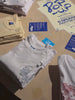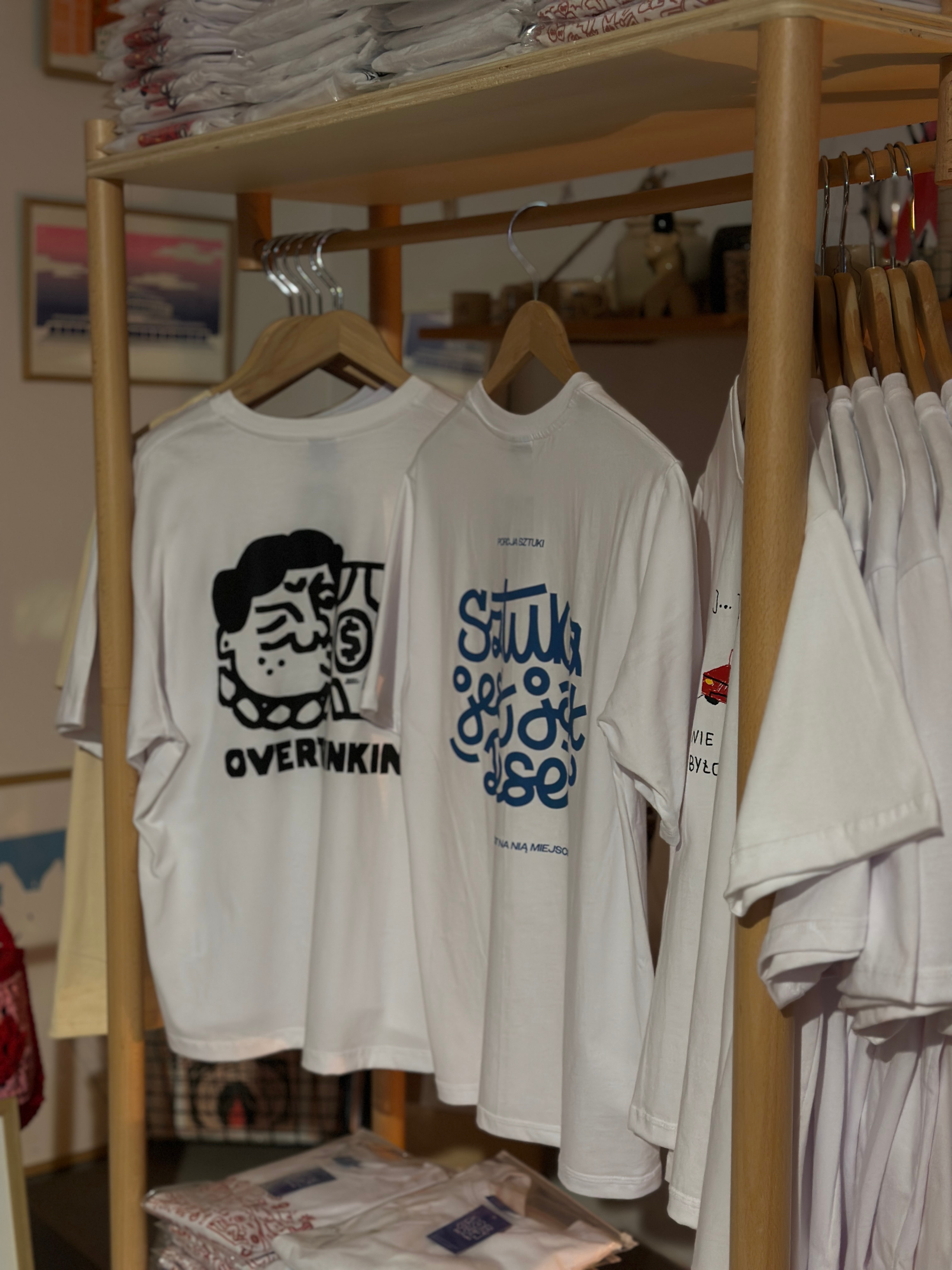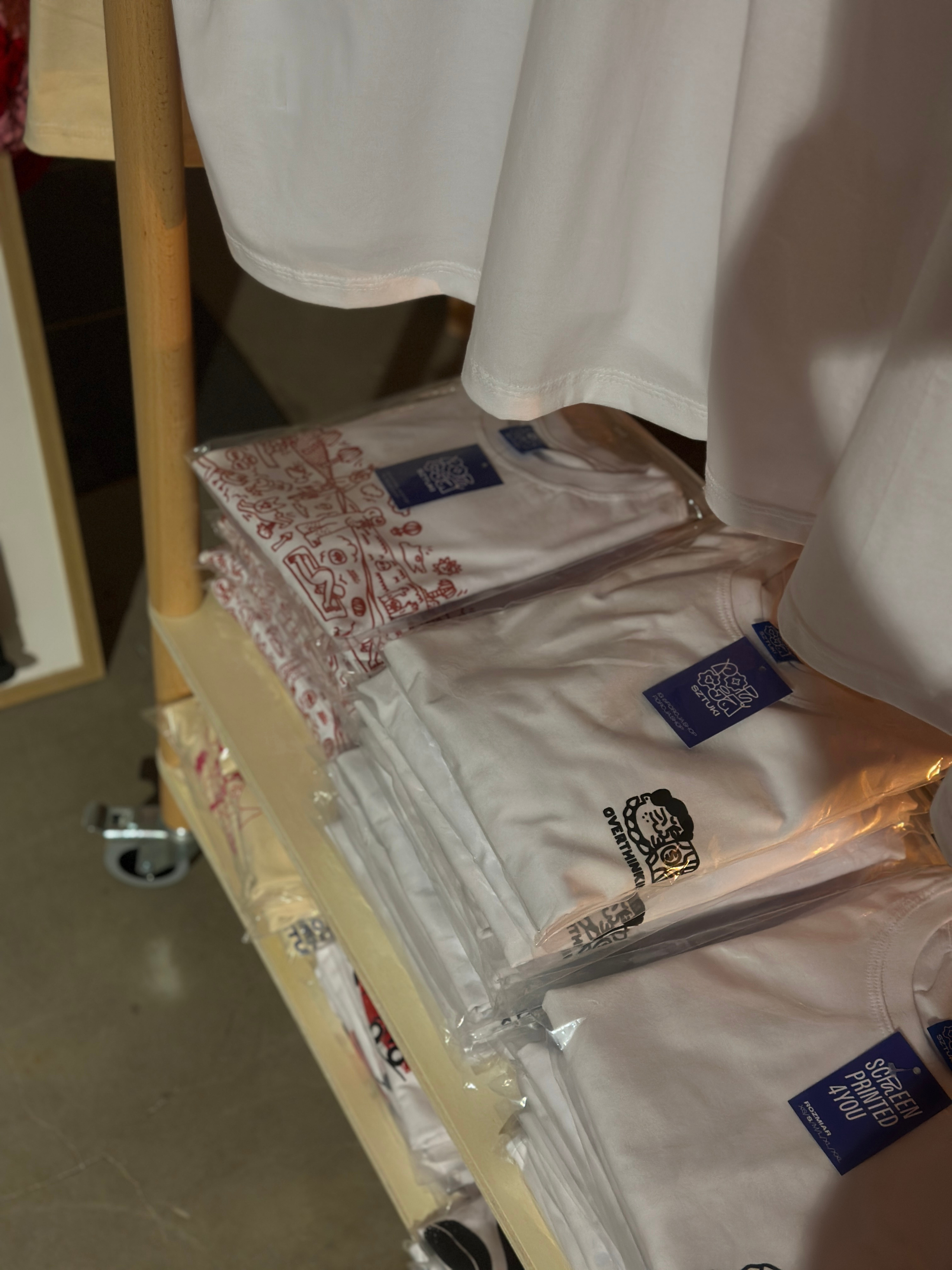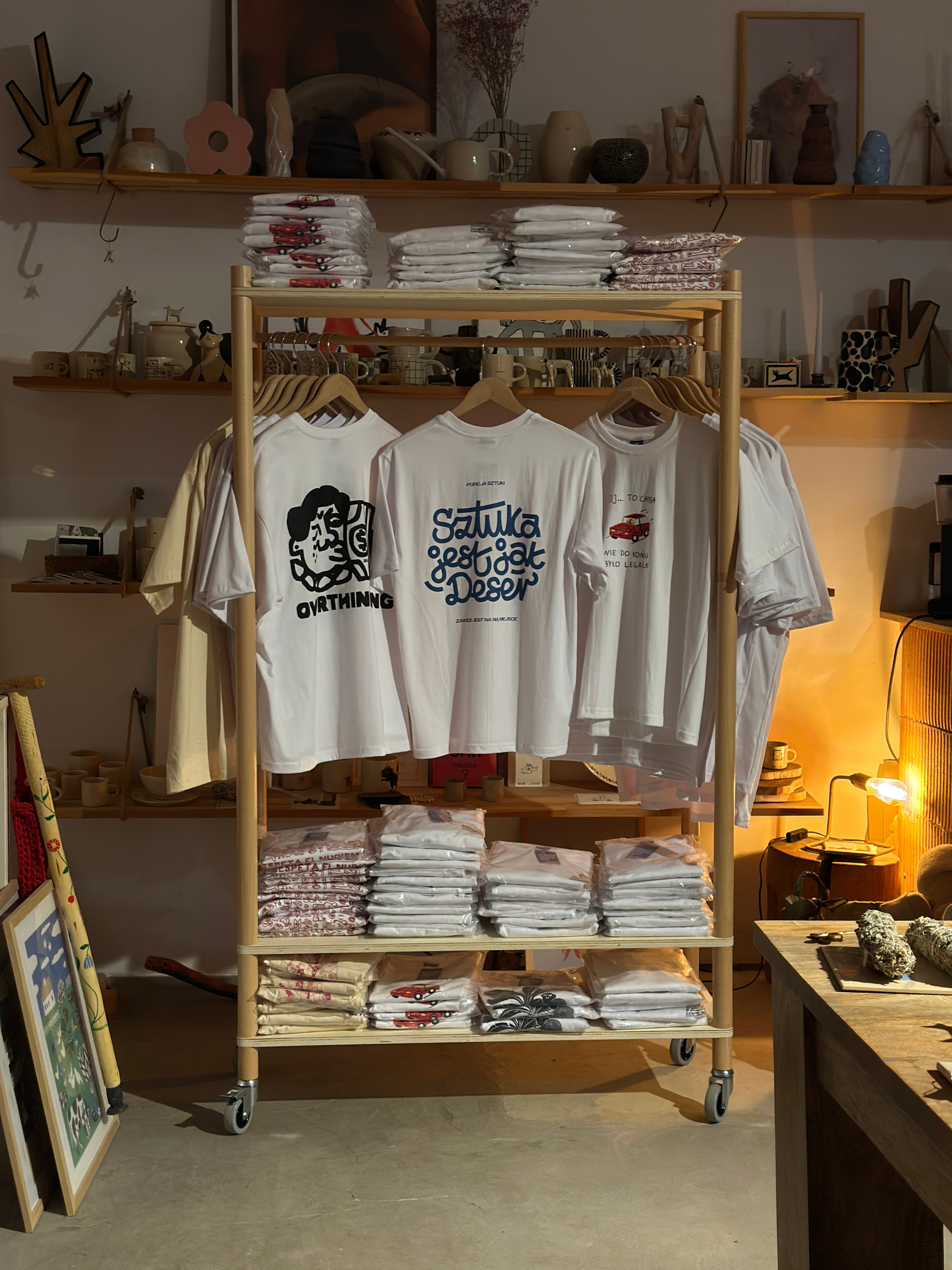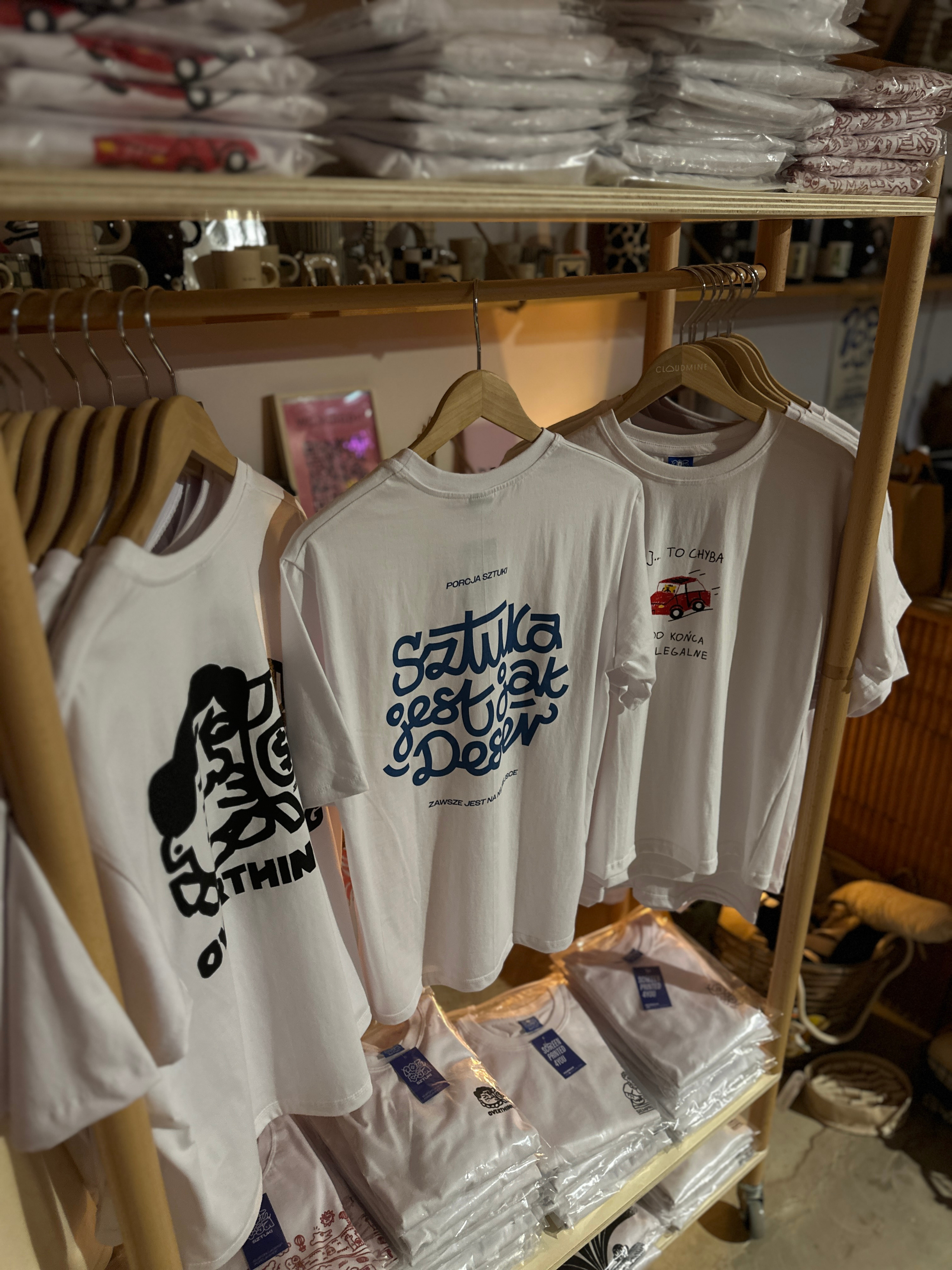 A mobile clothing rack on wheels from Milimetry used to display artist-designed T-shirts during the Porcja Sztuki pop-up event in Warsaw. The lightweight structure enabled an elegant product presentation and easy reconfiguration of the space.