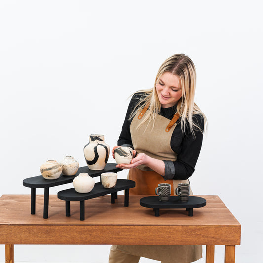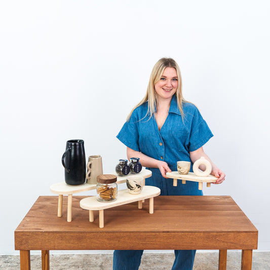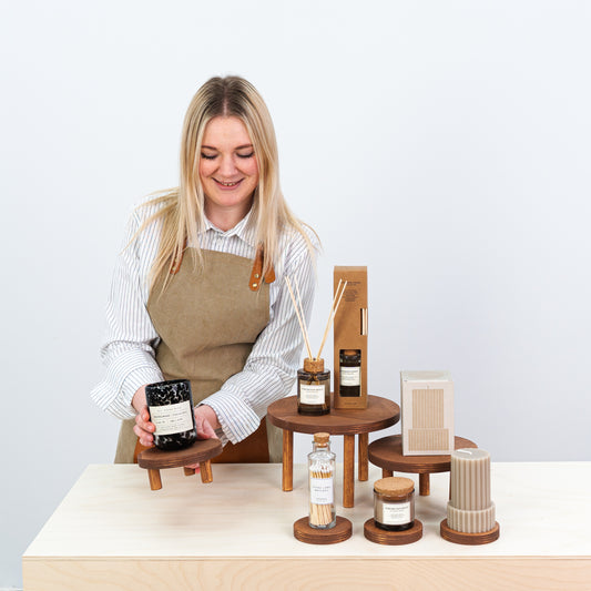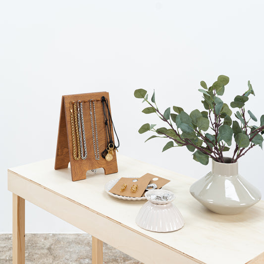 Prezentuj swoje produkty na naszych drewnianych ekspozytorach stołowych, idealnych do biżuterii, ceramiki, świec, kosmetyków i drobnych akcesoriów. W kolekcji znajdziesz drewniane podstawki, stojaki na naszyjniki, tace ekspozycyjne oraz pegboardy stołowe, zaprojektowane tak, aby wzmocnić merchandising wizualny na targach rękodzieła, w sklepach, pop-upach i na targach branżowych. Te przenośne, modułowe rozwiązania pomagają tworzyć atrakcyjne i uporządkowane prezentacje, które przyciągają uwagę klientów i budują wizerunek marki. Nasze ekspozytory stołowe zostały starannie zaprojektowane, aby łączyć naturalną estetykę z praktyczną funkcjonalnością, czyniąc je niezbędnym narzędziem w skutecznej sprzedaży detalicznej.