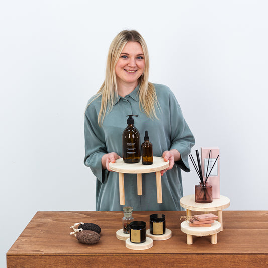 Estetyczne, drewniane ekspozytory stołowe do prezentacji produktów w sklepach, na pop-upach i eventach.