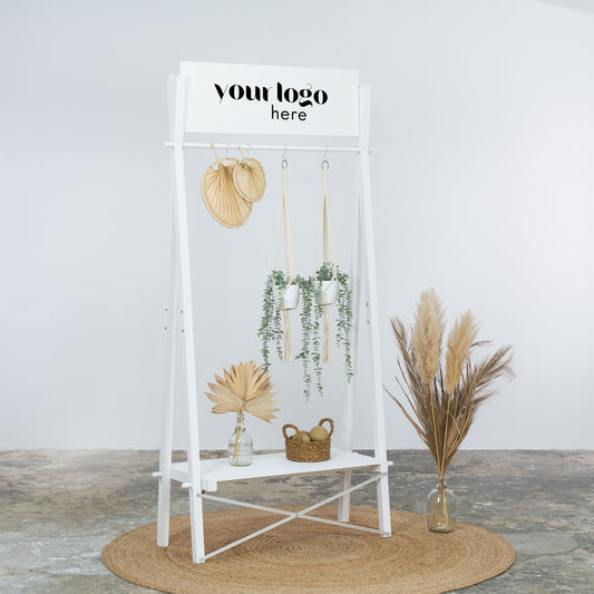 przenośna przymierzalnia, stojak A-frame, stojak z półkami, czarny stojak na ubrania, stojak z pegboardem i półkami, stojak w kolorze kawowym, stojak w kolorze naturalnym, biały stojak na ubrania