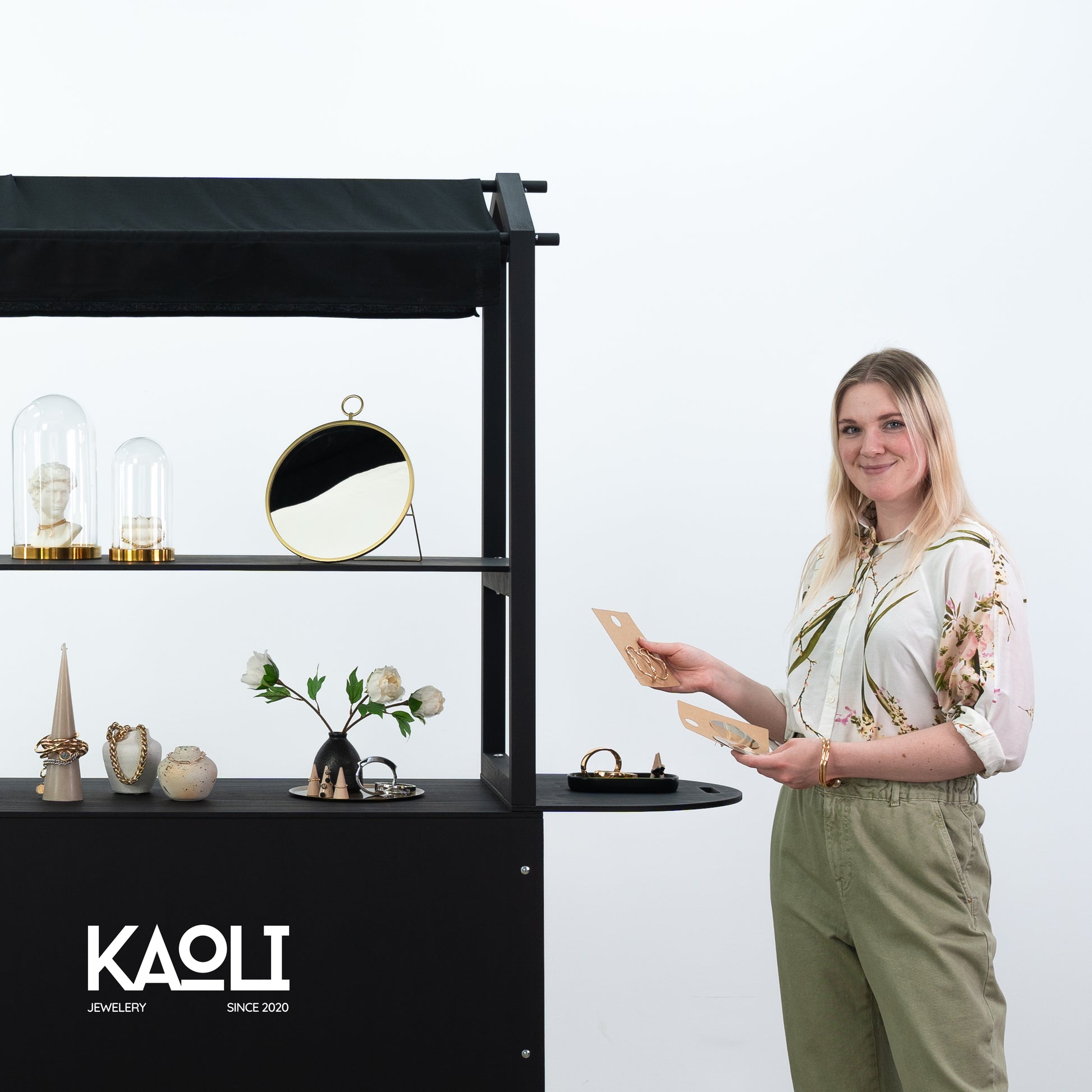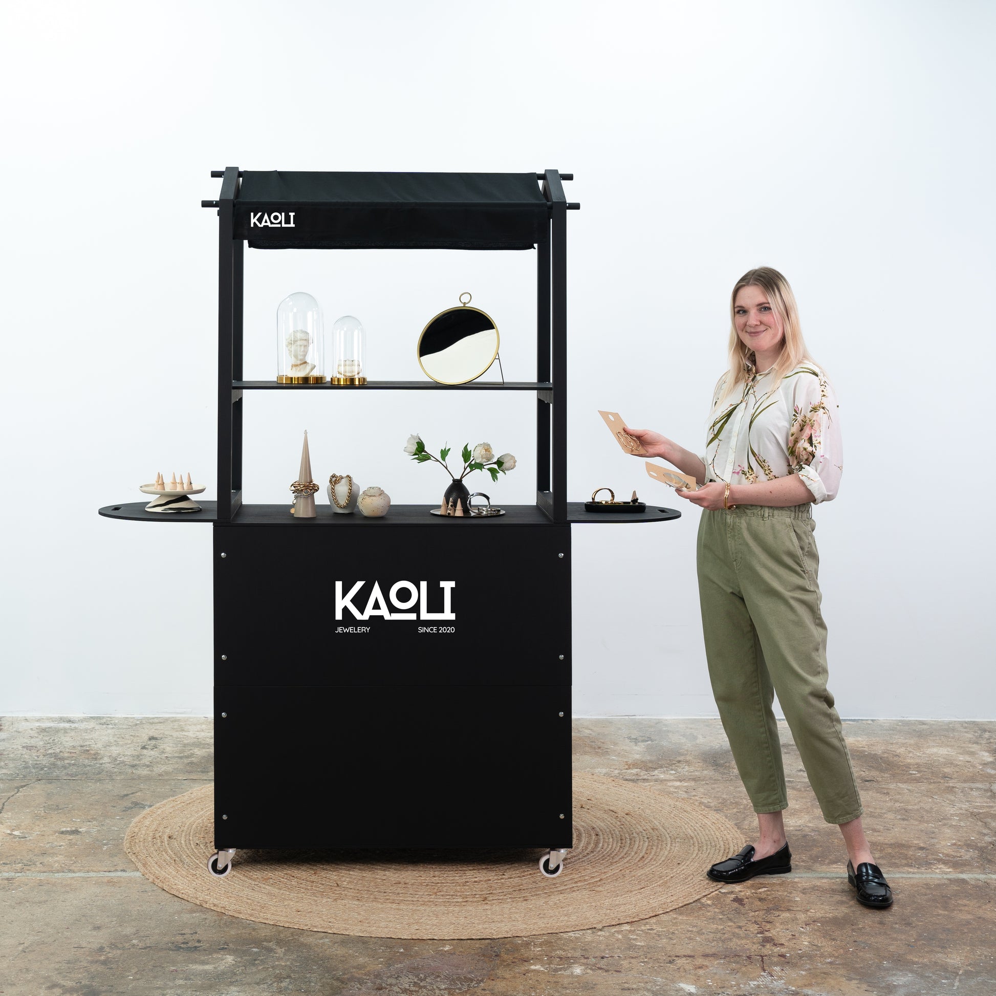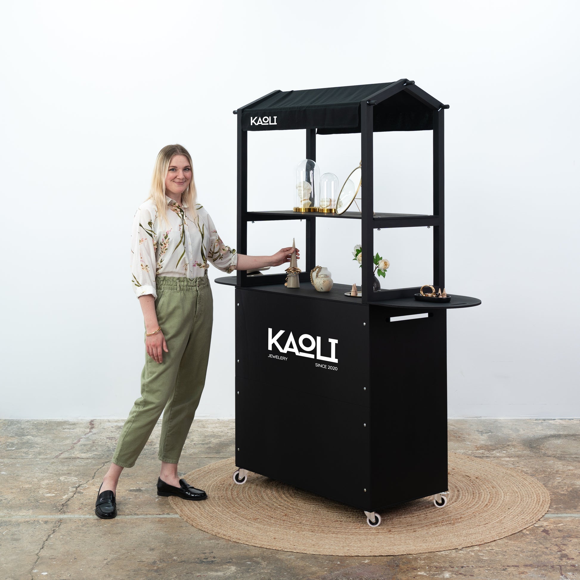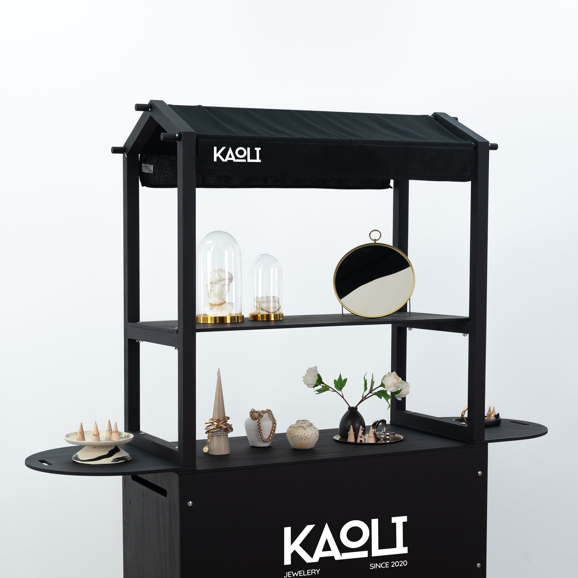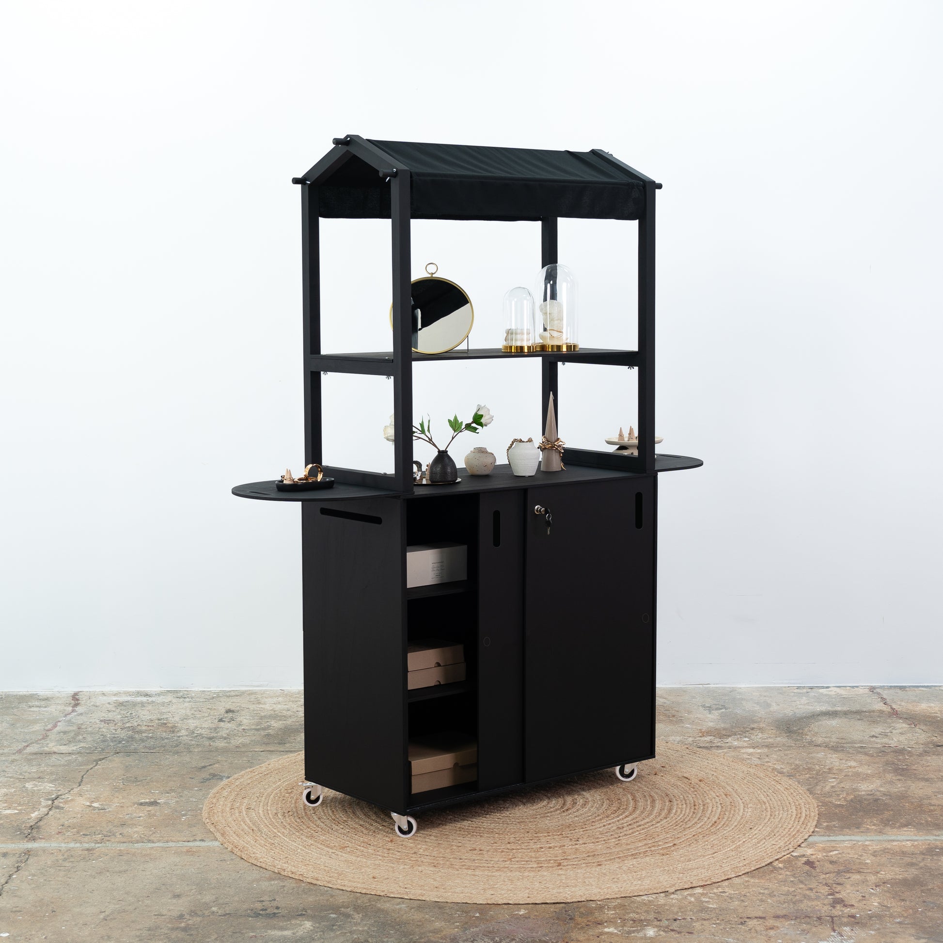 Ten elegancki czarny wózek wystawienniczy to modułowe, mobilne stoisko, stworzone z myślą o efektownych prezentacjach marki podczas targów branżowych, pop-up shopów i marketów. Wykonany z trwałej sklejki i drewna, pokryty matowym czarnym lakierem, łączy nowoczesny design z pełną funkcjonalnością.