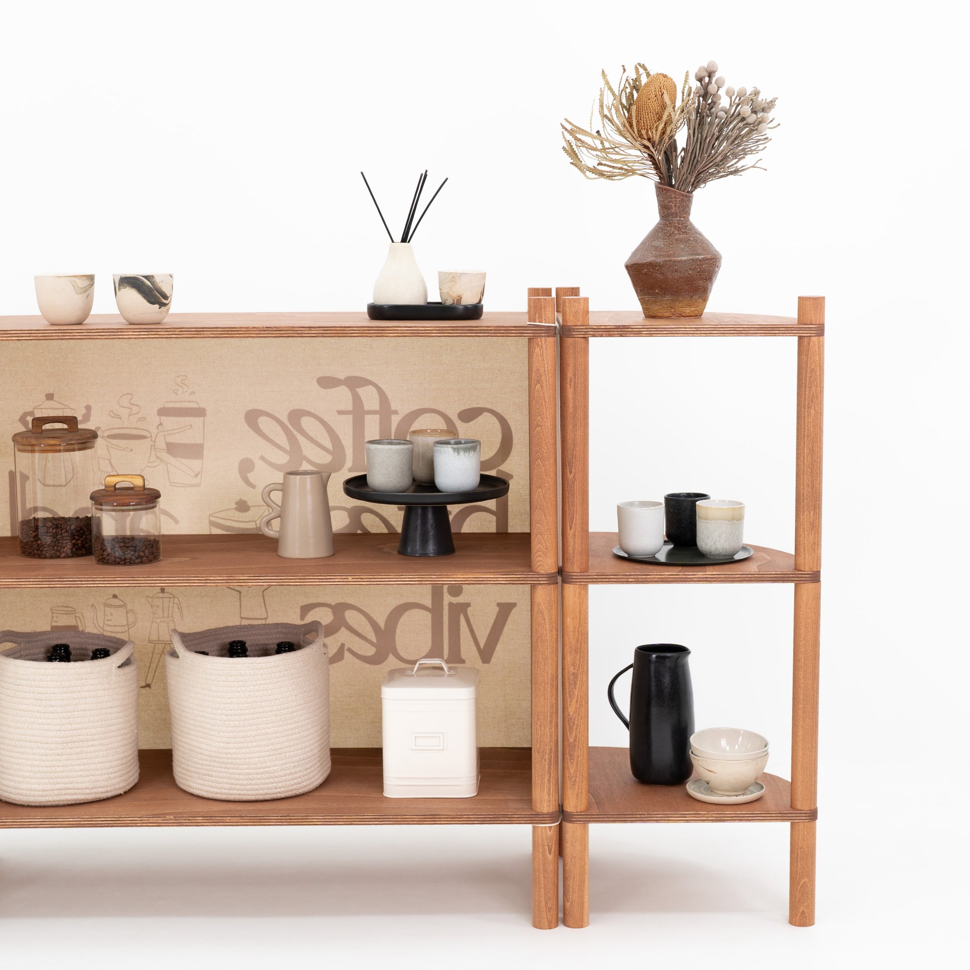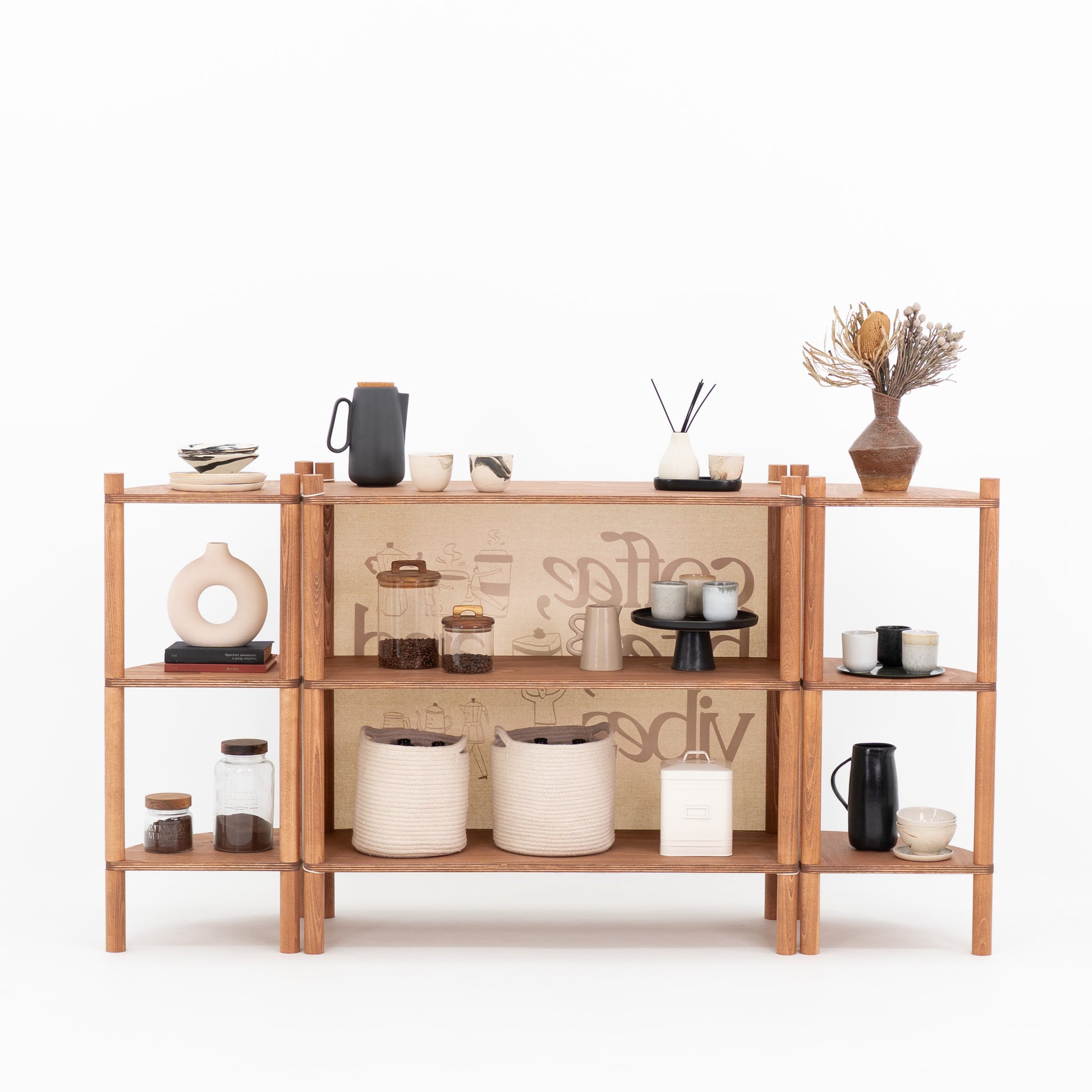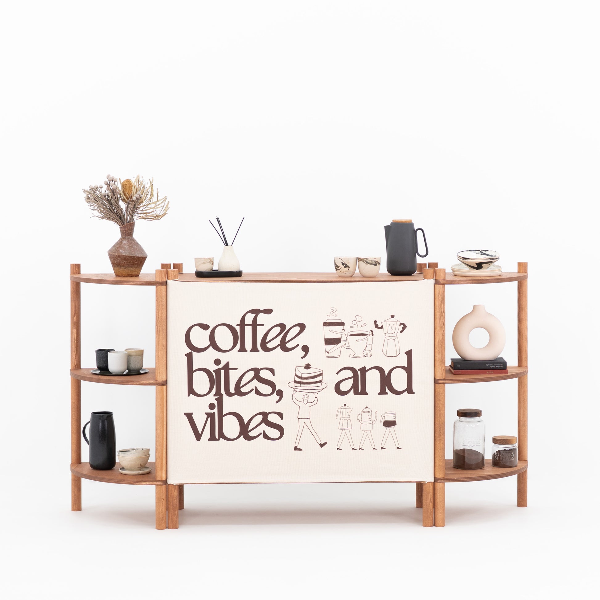 Stwórz modułowe stoisko z zestawem TOKYO, składającym się z lady oraz dwóch dopasowanych narożnych regałów ekspozycyjnych. Zaprojektowany z myślą o układach liniowych, strefach degustacyjnych, coffee station, pop-up shopach i aktywacjach marek, ten spójny set łączy wygodny przepływ obsługi z mocnym efektem wizualnym ekspozycji.