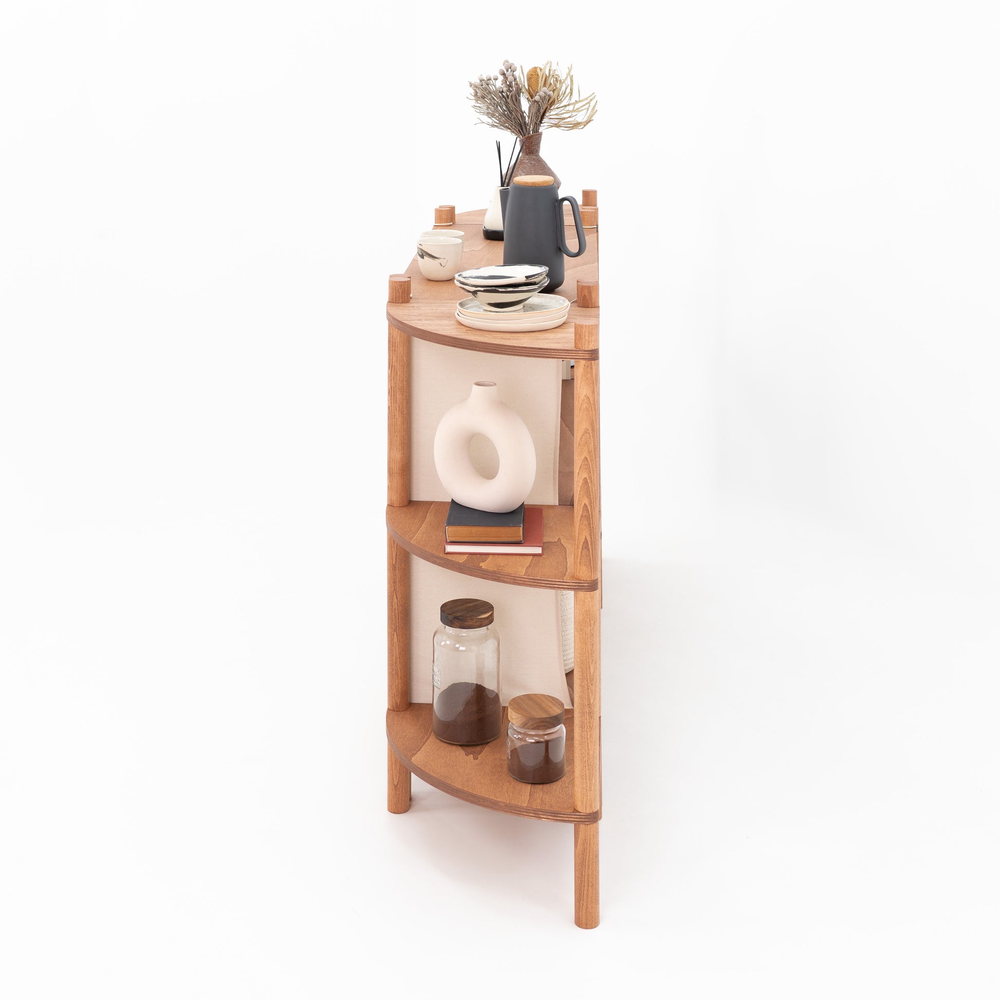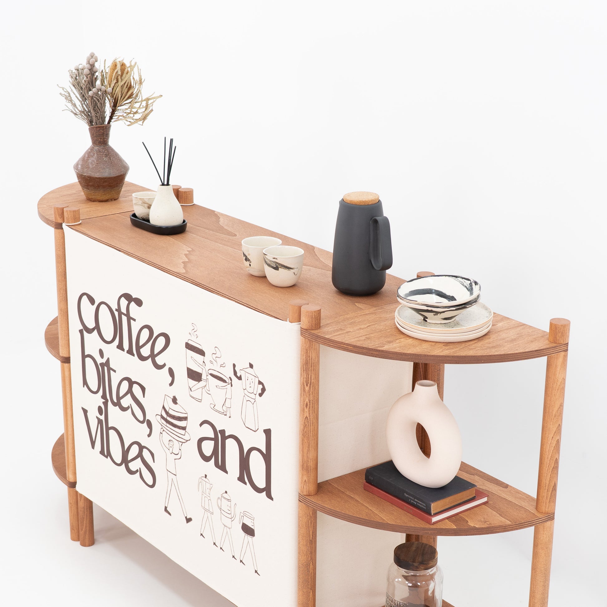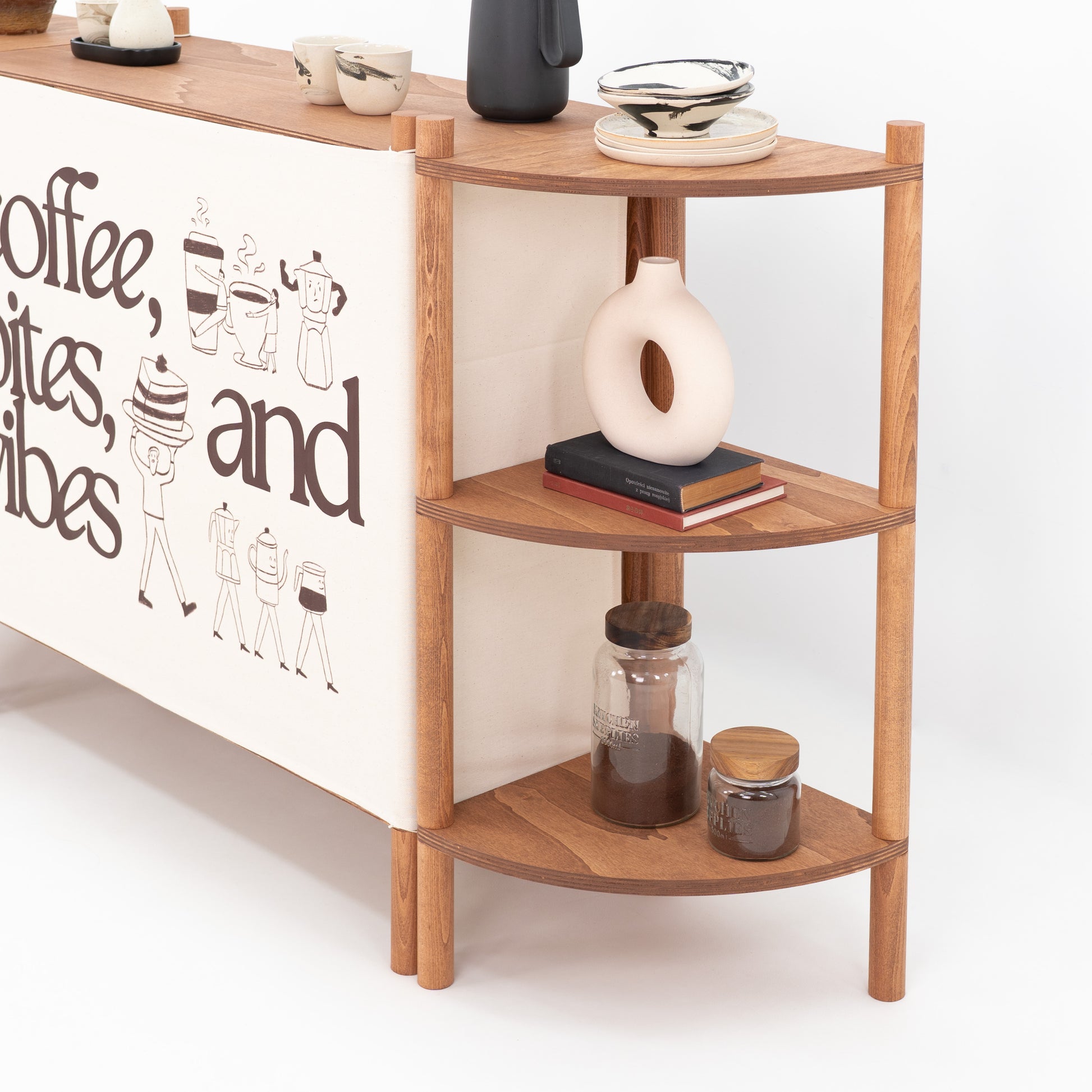 Centralna lada zapewnia praktyczną przestrzeń roboczą do obsługi klientów, konsultacji, ekspozycji produktów lub branded samplingu, podczas gdy dwa boczne regały narożne tworzą ramę całego setupu, dodając miejsce na produkty, dekoracje, opakowania. Efektem jest spójne stoisko, które jest jednocześnie funkcjonalne i dopracowane wizualnie. Wykonany z lekkiego drewna bukowego z frontowymi panelami materiałowymi, każdy element wykorzystuje intuicyjny montaż przez skręcanie bez użycia narzędzi, dzięki czemu cały zestaw jest łatwy w transporcie, instalacji i szybkiej rekonfiguracji w zmieniających się przestrzeniach retail oraz eventowych. Frontowe panele materiałowe mogą być w pełni personalizowane poprzez logo, branding, nadruki full print, pasy lub indywidualny jednolity kolor, co pozwala idealnie dopasować całość do identyfikacji wizualnej marki. Zaprojektowany do wielokrotnego montażu i demontażu, zestaw TOKYO to modułowe, wielorazowe rozwiązanie dla marek, agencji i zespołów eventowych, które szukają czystego, architektonicznego systemu ekspozycyjnego z mocnym efektem merchandisingowym.