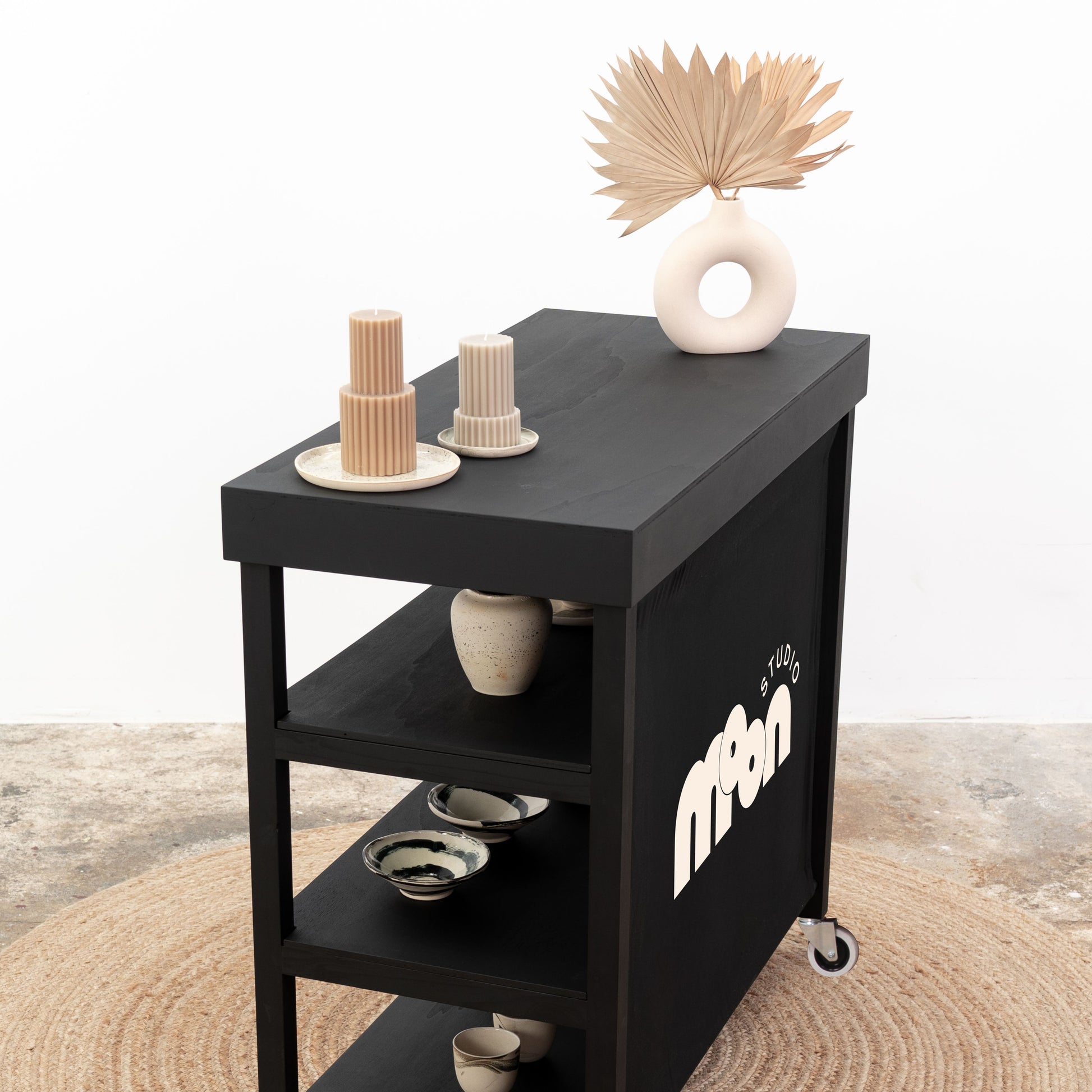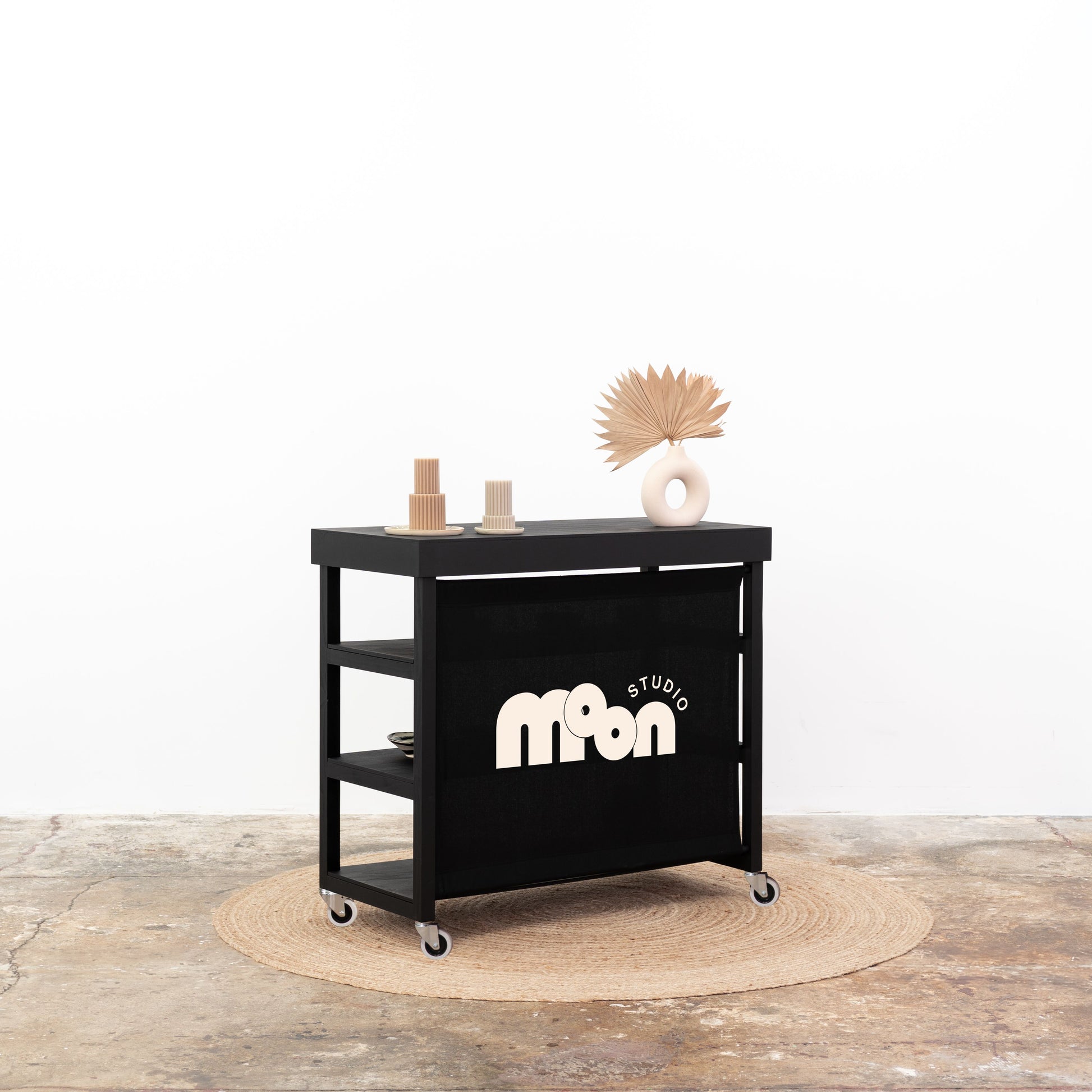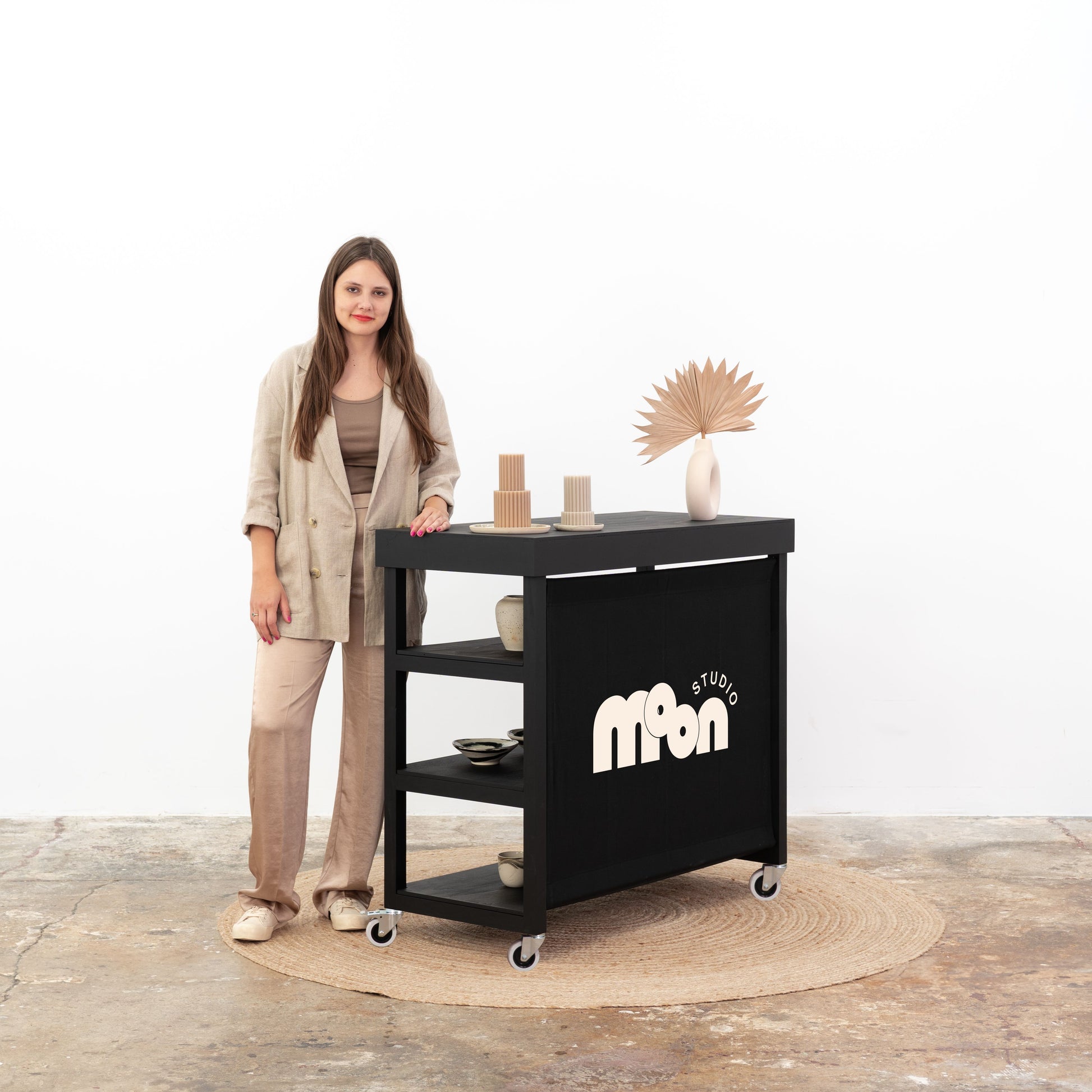 Wykonana z solidnej sklejki i osadzona na wysokiej jakości kółkach transportowych, zapewnia łatwe przemieszczanie i szybkie zmiany ustawienia. Jest lekka, a zarazem stabilna, stworzona z myślą o wielokrotnym montażu i demontażu. To praktyczne rozwiązanie dla profesjonalistów eventowych, agencji kreatywnych i sprzedawców mobilnych, którzy potrzebują funkcjonalnej i estetycznej lady wystawienniczej do różnych aranżacji i dynamicznych przestrzeni sprzedażowych.