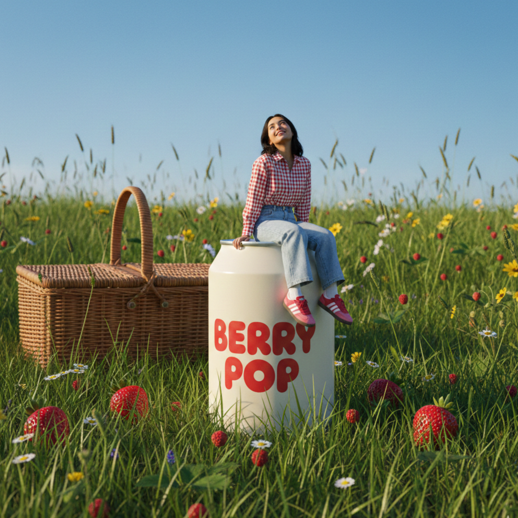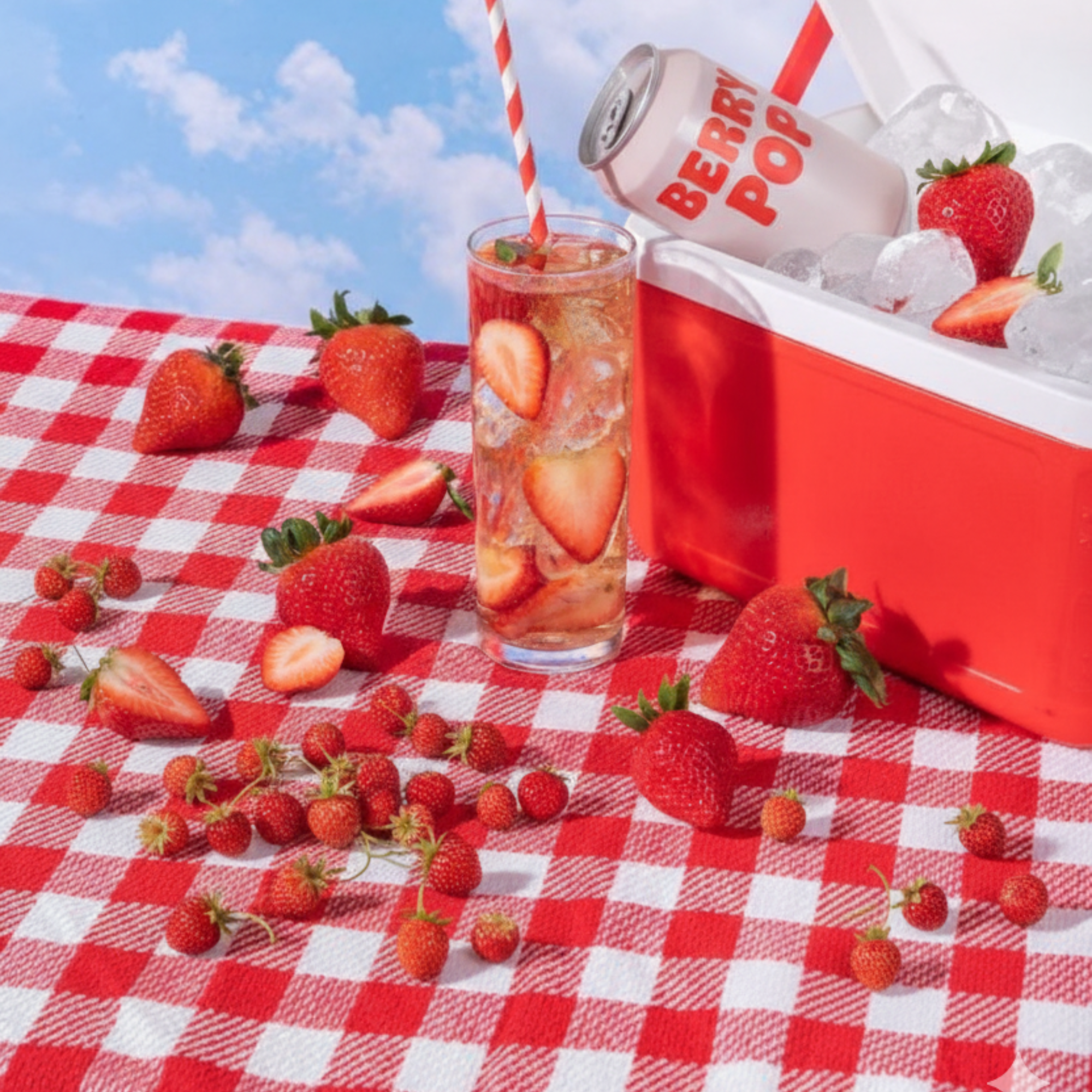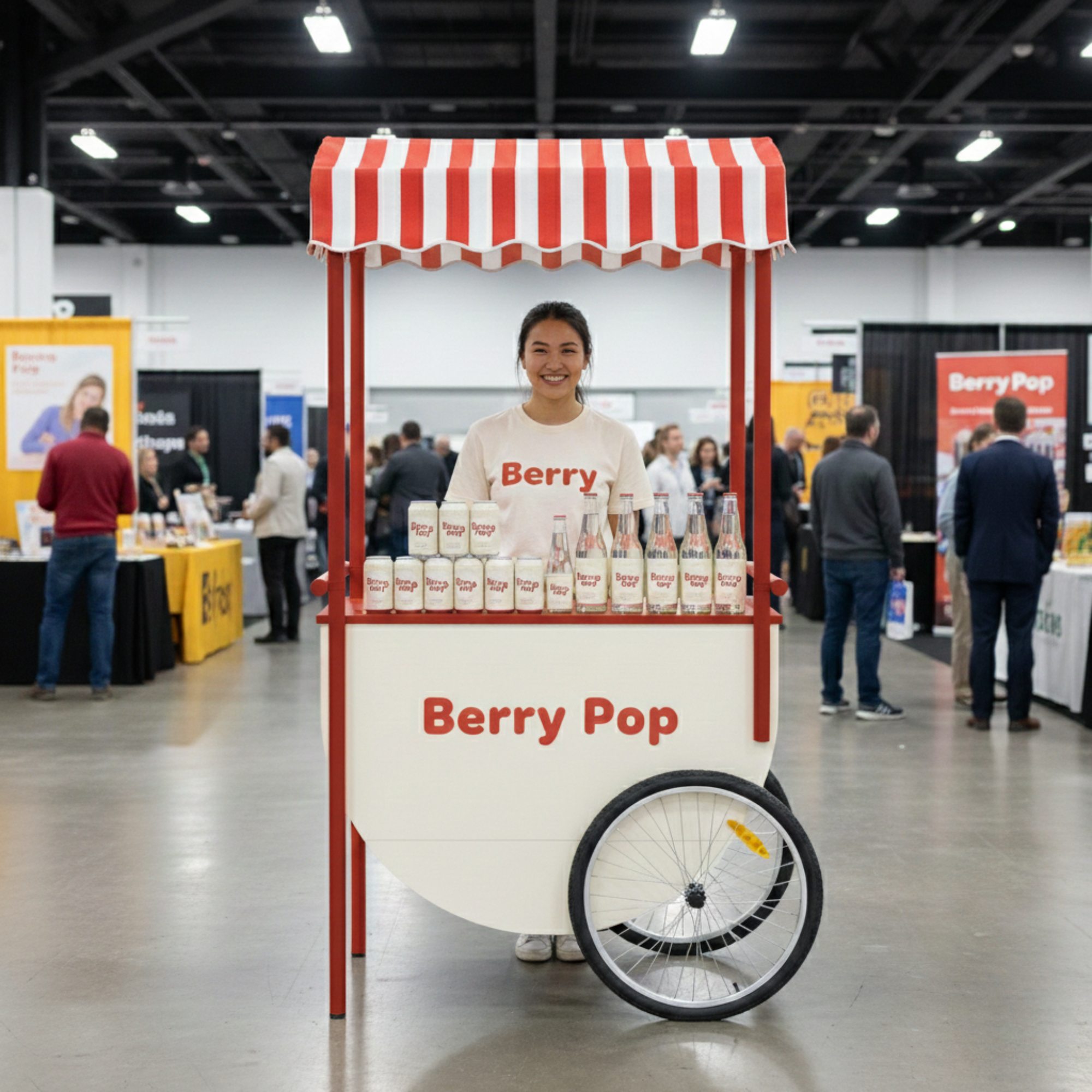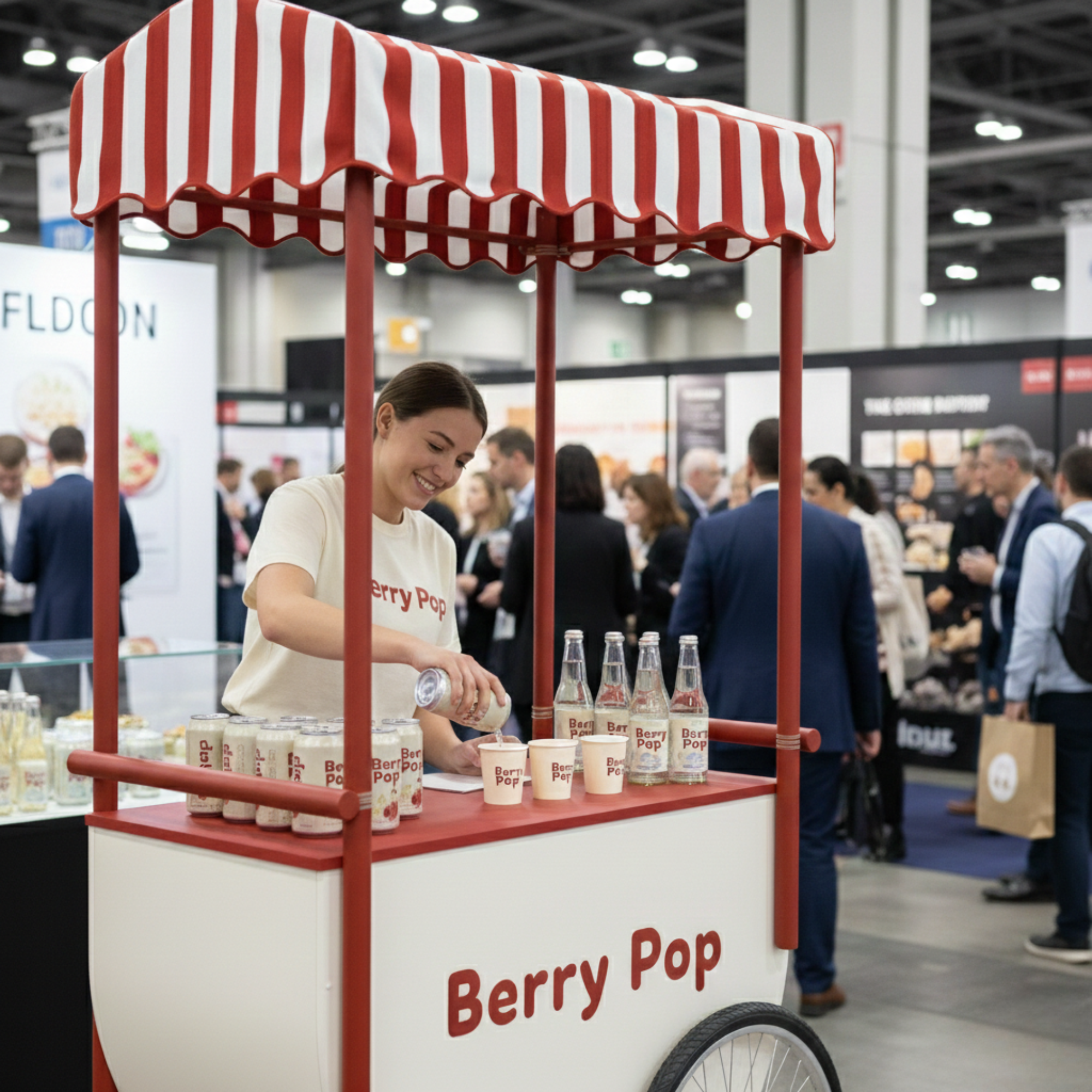 Musujący napój truskawkowy zyskuje własną, wyrazistą przestrzeń. Wózek staje się jego punktem centralnym – miejscem, które przyciąga uwagę, buduje klimat i naturalnie skupia wokół siebie ludzi.