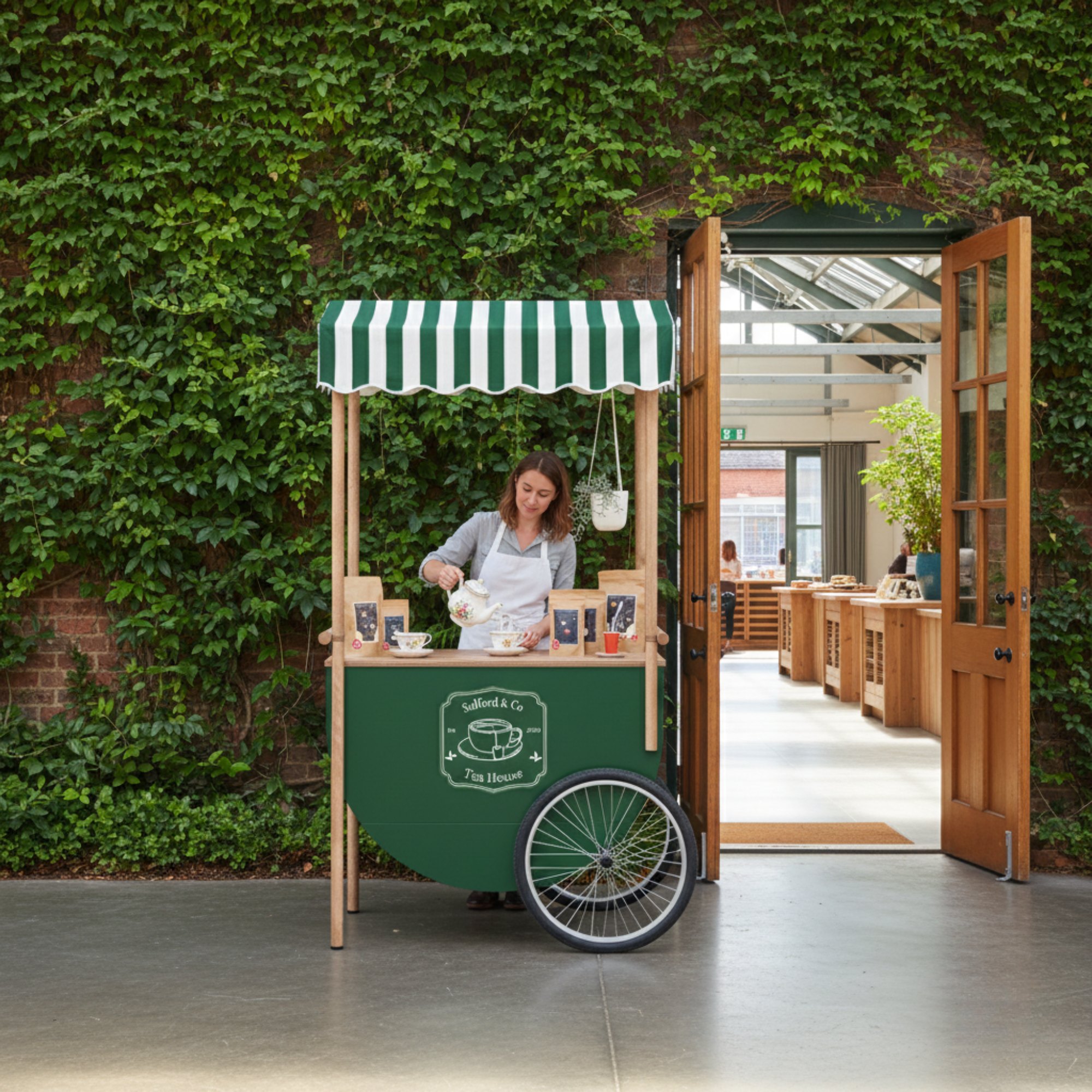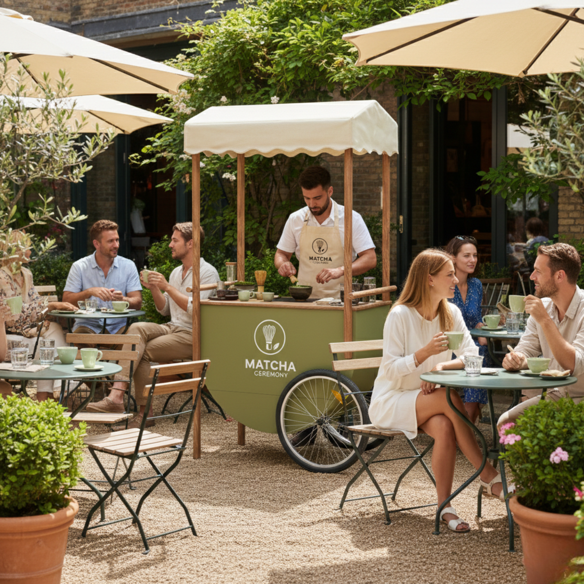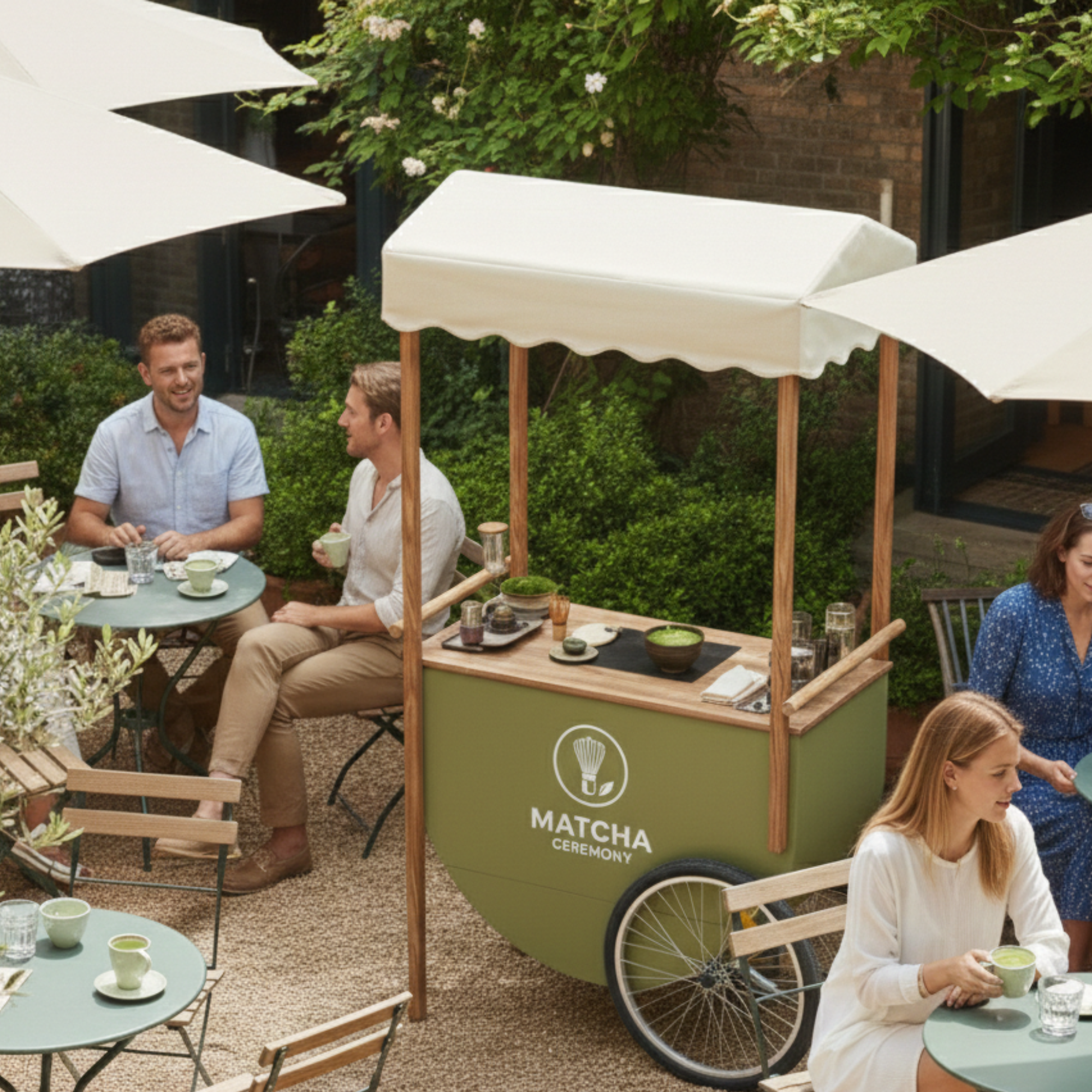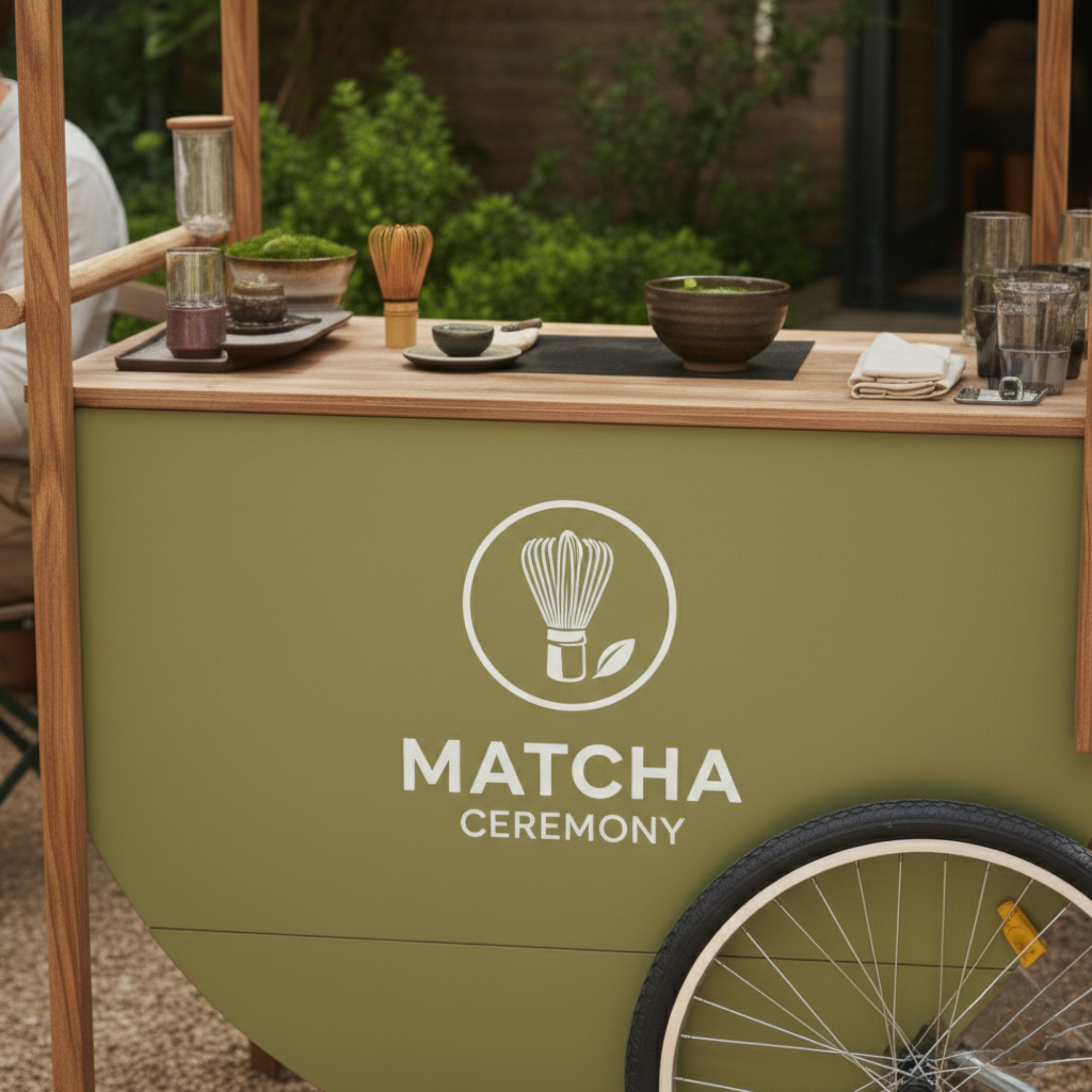 Wózek zaprojektowany jako mobilny matcha bar w ogródku restauracji pozwala przygotowywać napój na oczach gości i serwować go bezpośrednio przy stolikach. Tworzy swobodny, przyciągający uwagę punkt, w którym świeżo przyrządzana matcha staje się naturalną częścią spotkania i letniej atmosfery.