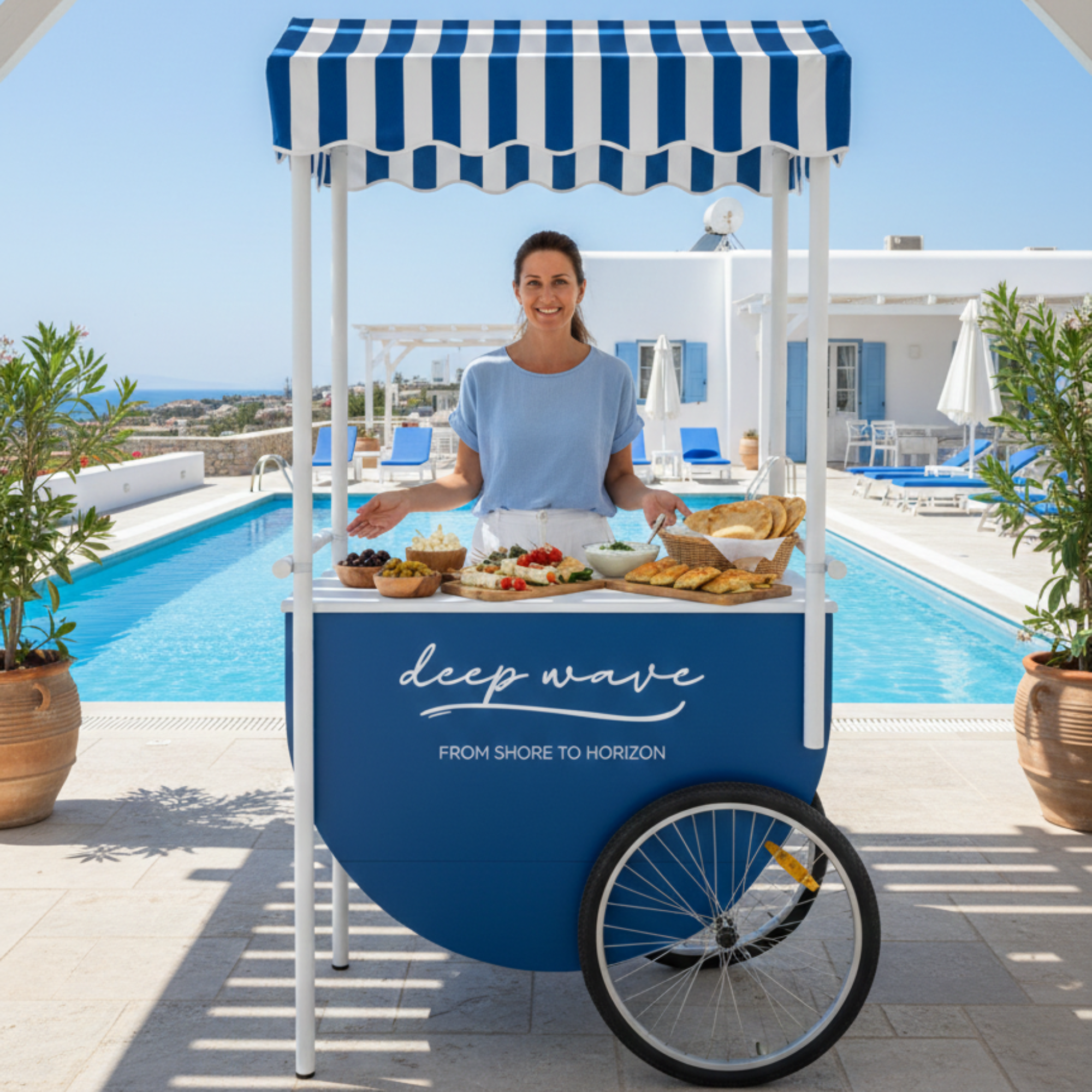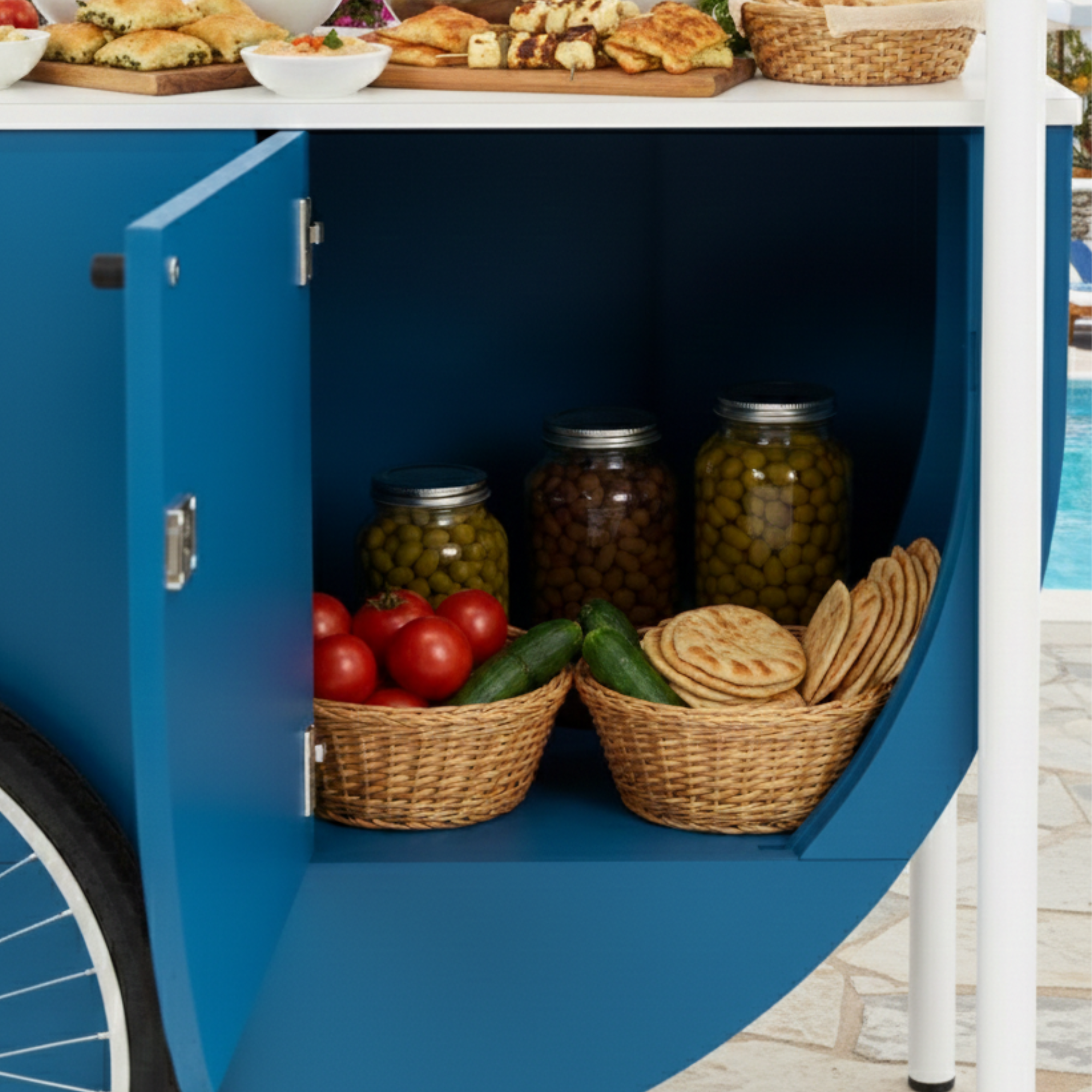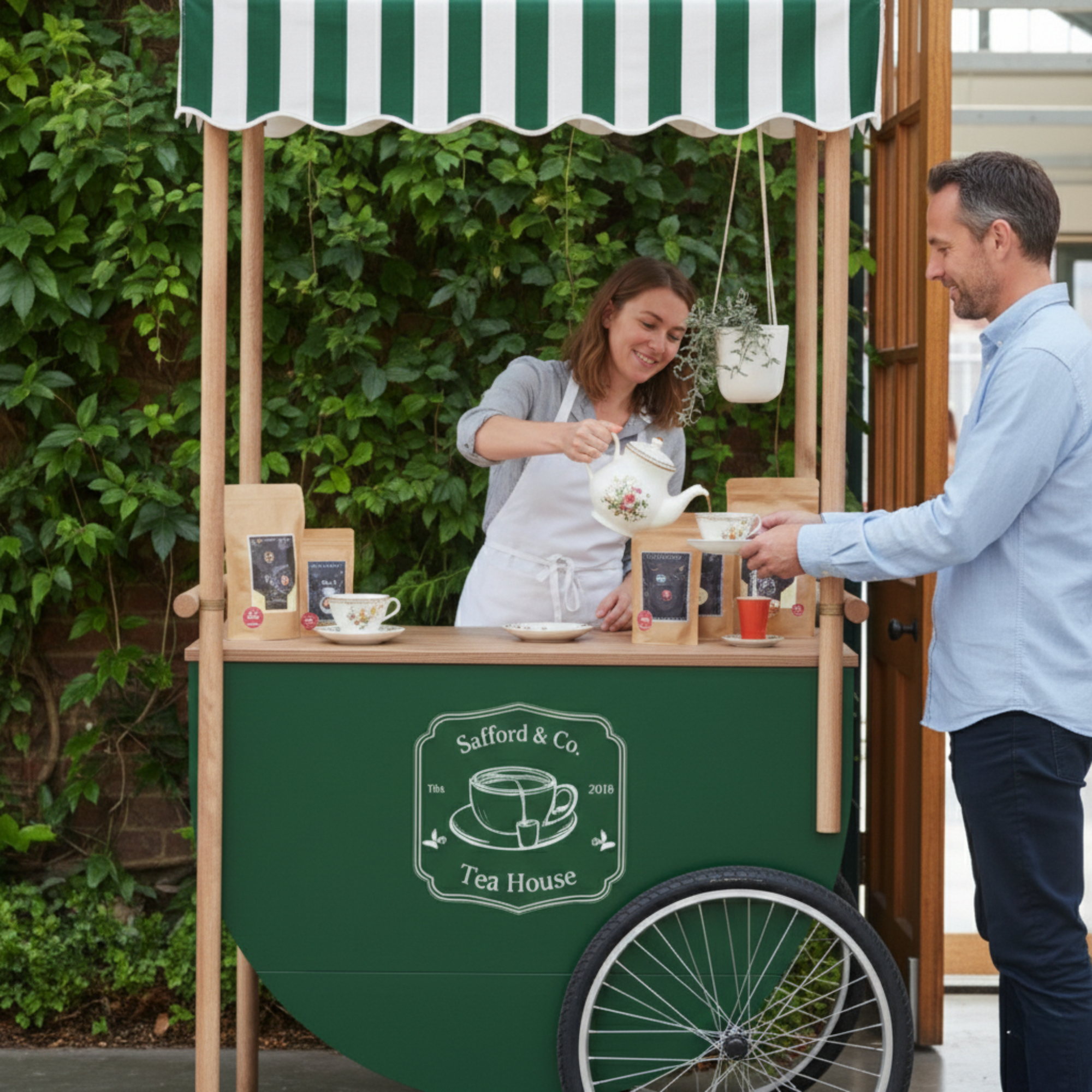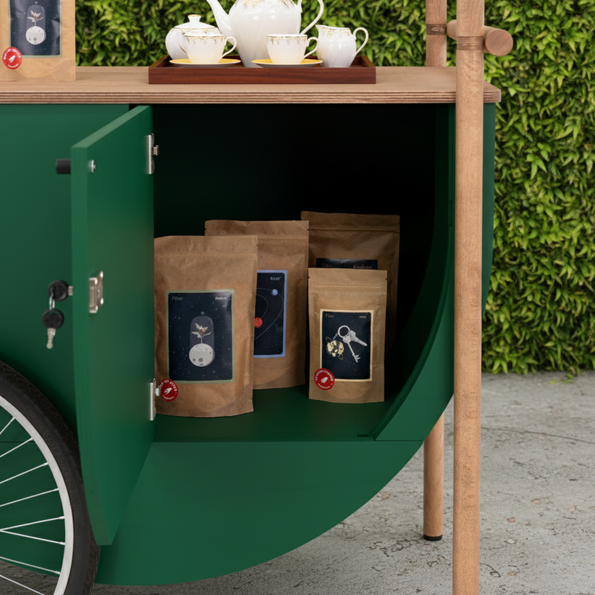 Wózek zaprojektowany jako mobilny matcha bar w ogródku restauracji pozwala przygotowywać napój na oczach gości i serwować go bezpośrednio przy stolikach. Tworzy swobodny, przyciągający uwagę punkt, w którym świeżo przyrządzana matcha staje się naturalną częścią spotkania i letniej atmosfery.