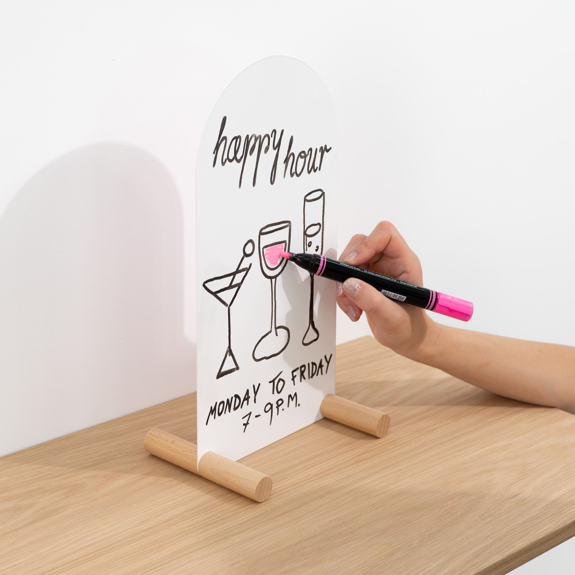 Biała, metalowa powierzchnia w połączeniu z solidnymi, naturalnymi drewnianymi nóżkami łączy nowoczesną estetykę z praktyczną funkcjonalnością. Magnetyczna powierzchnia umożliwia łatwe mocowanie drukowanych materiałów, a gładkie wykończenie świetnie współpracuje z markerami kredowymi na bazie płynnej – doskonałe rozwiązanie do częstej zmiany informacji lub tworzenia kreatywnych komunikatów.