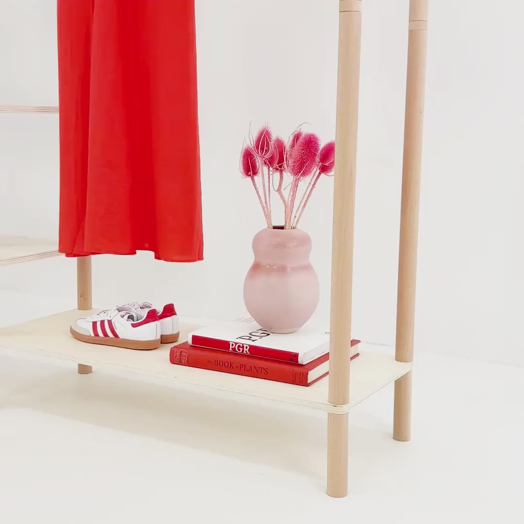 Wykonany z litego drewna bukowego i półek ze sklejki w naturalnym wykończeniu, regał stanowi czyste, neutralne tło, które pozwala w pełni wyeksponować Twoje produkty. Doskonale sprawdzi się zarówno do prezentacji odzieży i obuwia, jak i ceramiki, książek, kosmetyków czy akcesoriów dekoracyjnych – dopasowując się do różnych potrzeb ekspozycyjnych. Model dostępny jest w wersji z materiałowym panelem tylnym lub bez panelu, w zależności od indywidualnych wymagań ekspozycji. Panel może służyć jako tło brandingowe, przestrzeń reklamowa lub estetyczne wykończenie zabudowy.