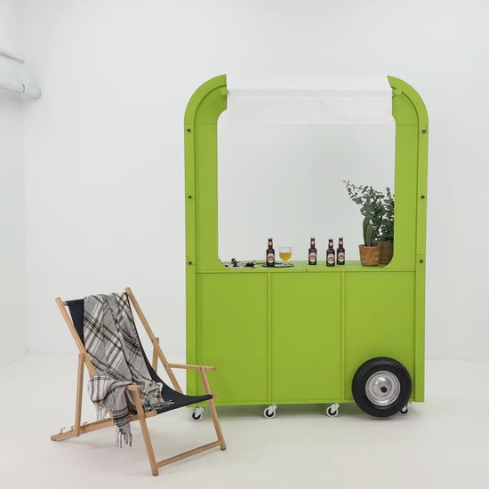 The cart is equipped with dedicated openings for gastronorm inserts, making it suitable for food and beverage service. While the inserts themselves are not included, the cart features custom lids that cover the openings when not in use, creating a smooth and unified worktop surface. This flexibility allows agencies to adapt the cart for both catering and non-catering purposes, ensuring maximum usability across different event formats. The canopy can be fully customized with your logo, graphics, or bespoke designs, making it a striking branding surface that captures attention from afar. You can choose any cart color from the RAL or NCS palette, allowing agencies to match the display precisely to brand guidelines or event themes and create a cohesive, professional presentation. The plywood panels offer versatile branding options: you can apply vinyl decals with logos or graphics for a clean, removable solution, or opt for direct UV printing on the plywood. Prints can be applied either as spot graphics in selected areas or as a full-surface design covering the entire panel, giving maximum creative freedom for impactful visual storytelling. With its strong branding potential, versatile design, and professional finish, the Camper Style Display Cart is the ideal solution for event agencies planning brand activations, marketing companies creating experiential campaigns, catering and hospitality businesses offering mobile service points, as well as retailers and lifestyle brands running pop-up shops or seasonal promotions.