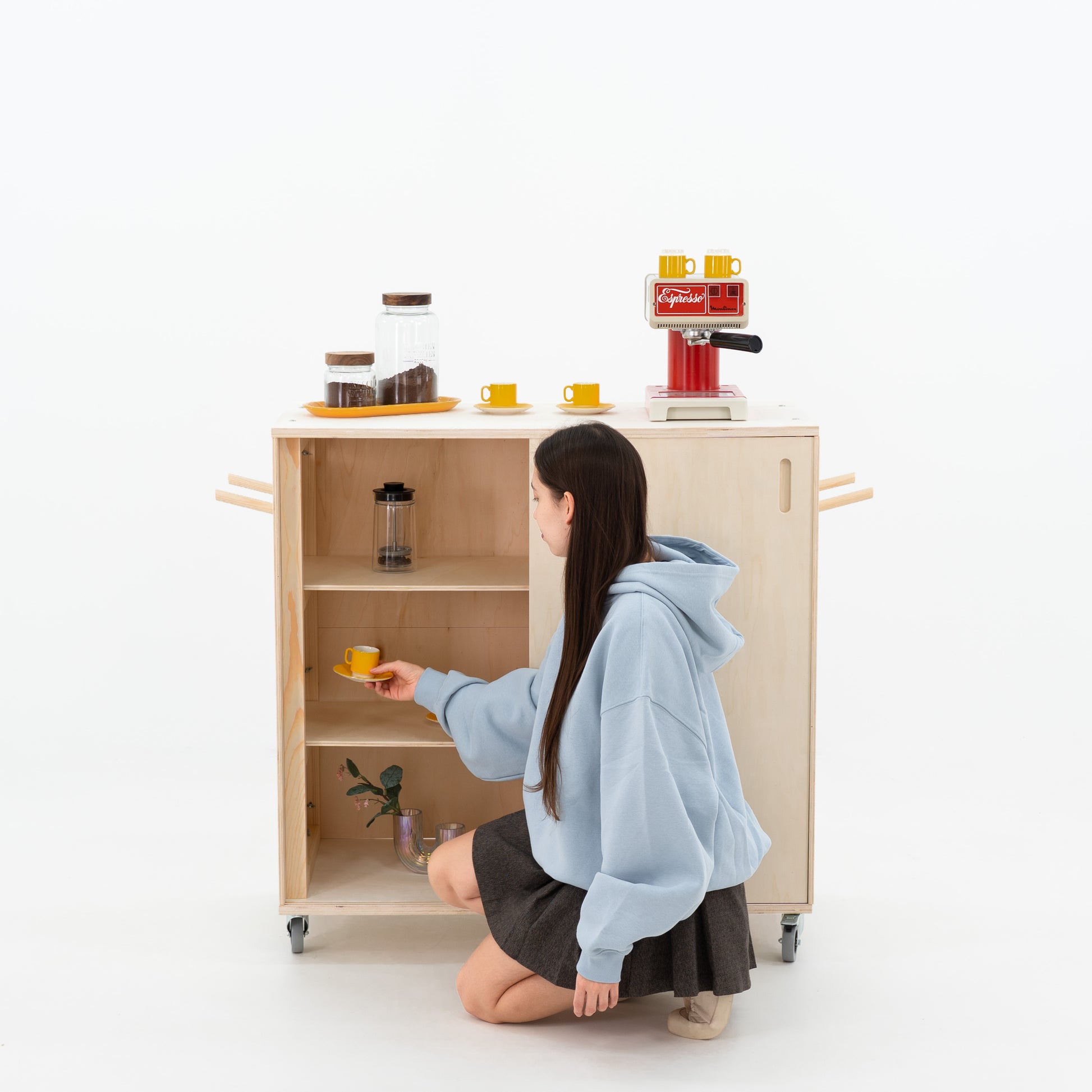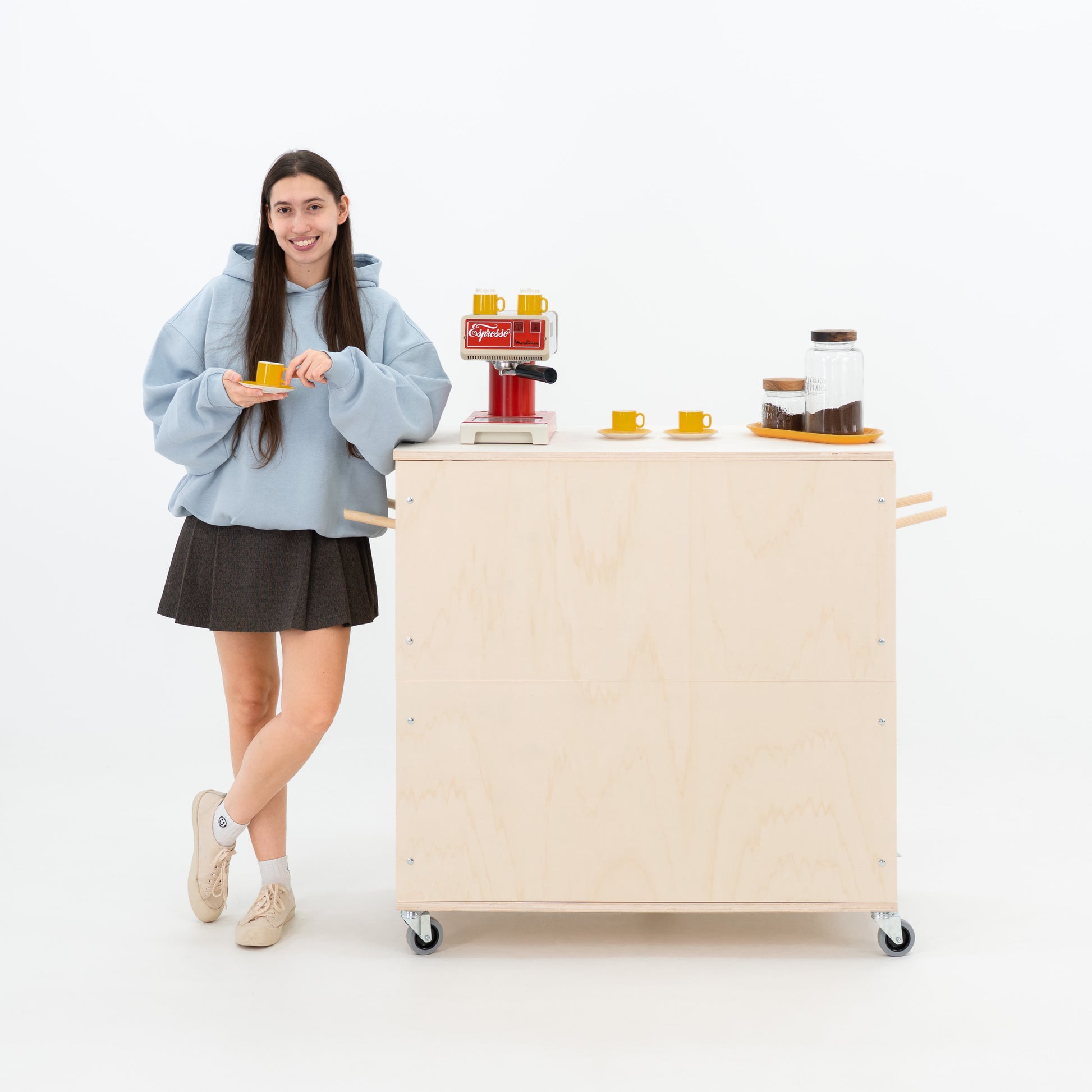 The counter includes sliding lockable doors and three spacious shelves to neatly store everything from point-of-sale materials to packaging supplies. The natural finish adds an eco-conscious, minimalist look, perfectly suiting handmade goods, boutique products, or artisan displays.