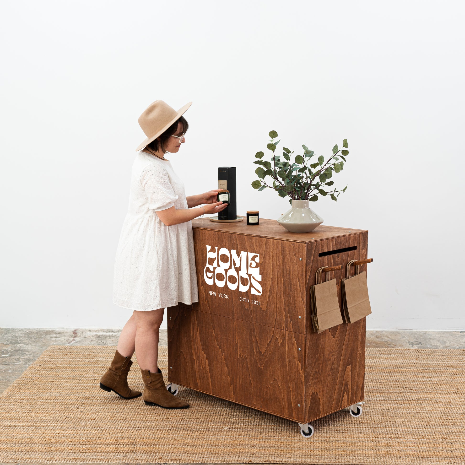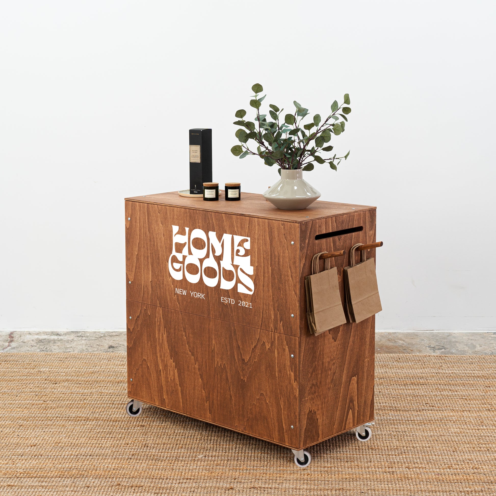 Crafted from durable wood in a rich coffee-colored finish, the counter includes three internal shelves for organizing POS materials, packaging supplies, or personal items. The lockable compartment ensures security for valuables during busy trade events or retail operations. Equipped with side handles for easy lifting and caster wheels for smooth repositioning, this vendor counter provides flexibility and mobility for any event setup. Its collapsible design packs flat, fitting conveniently into a standard passenger car for repeatable transport between venues.