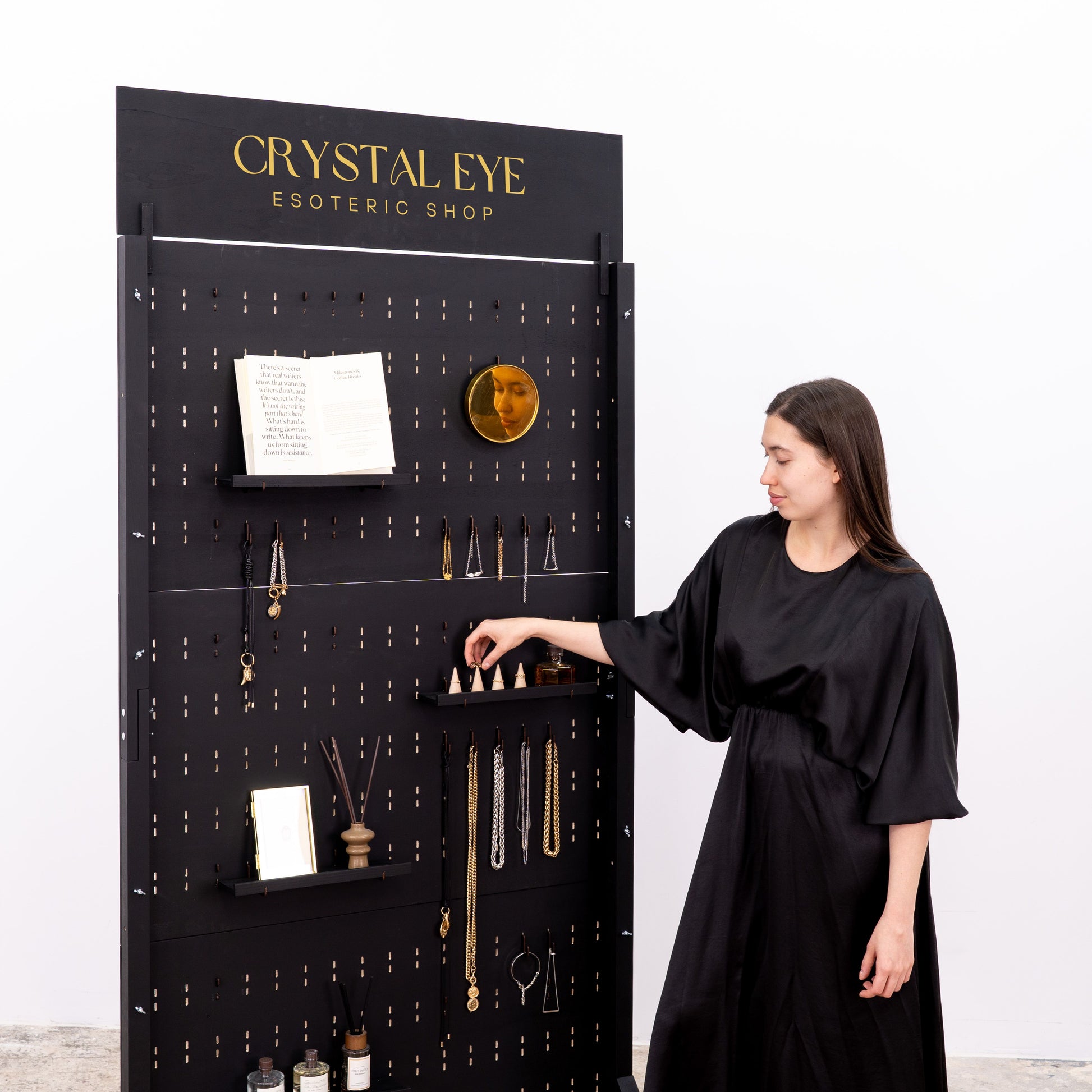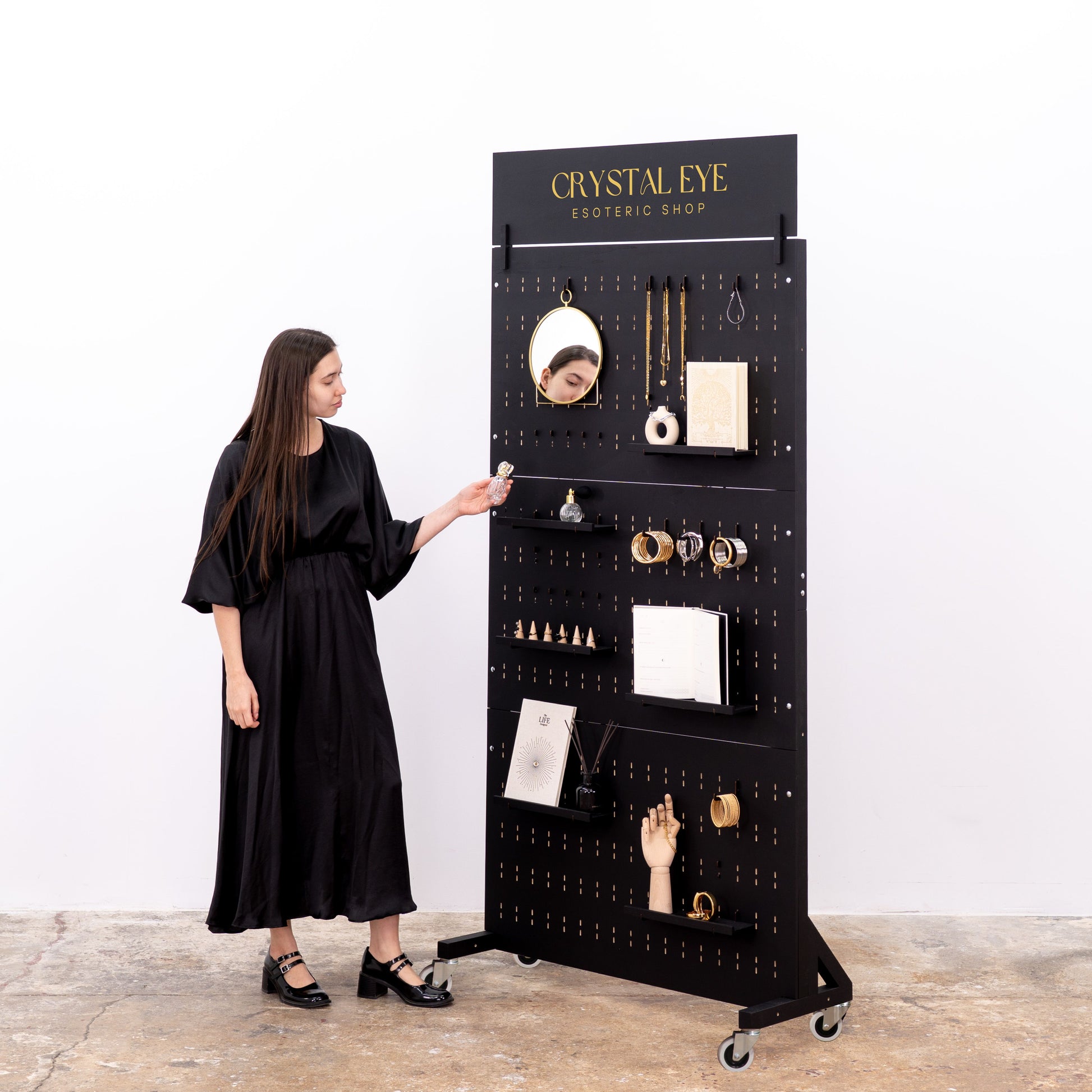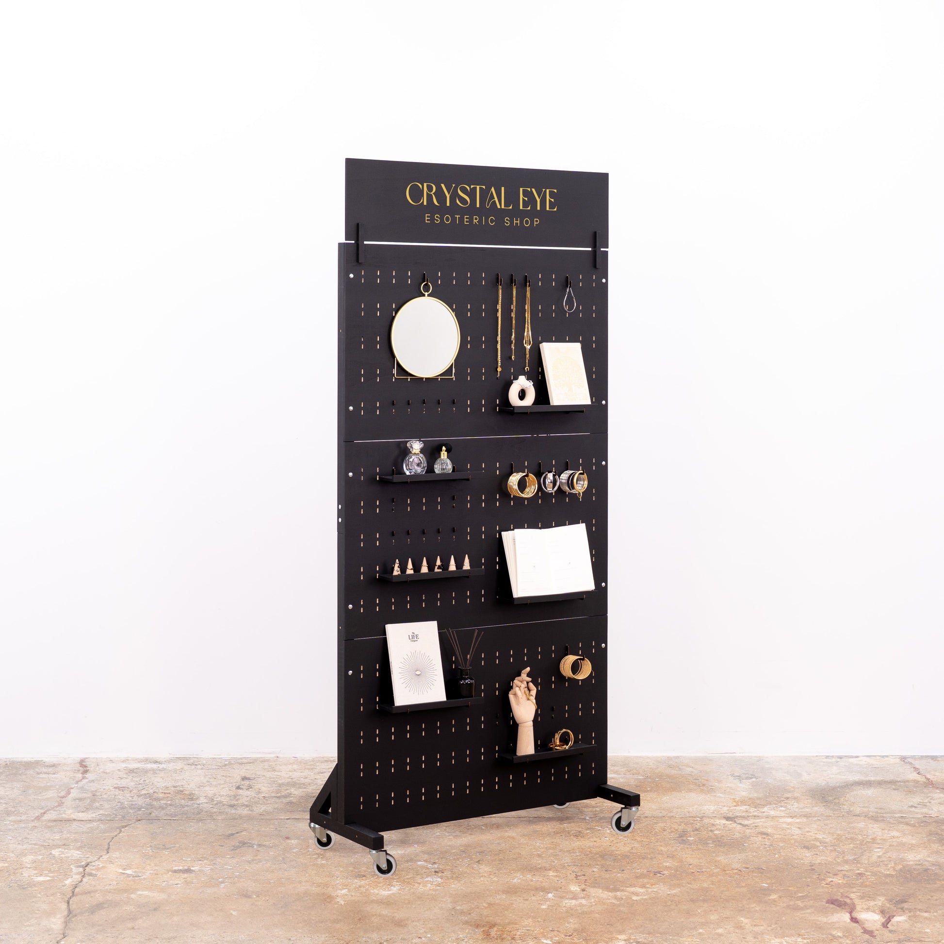 This freestanding pegboard rack on wheels allows for smooth repositioning across your store, event space, or exhibition booth. The double-sided perforated board gives you maximum surface area to display products using pegs, hooks, mini shelves, and trays – from jewelry, candles, and accessories to cosmetics, books, and home decor.
