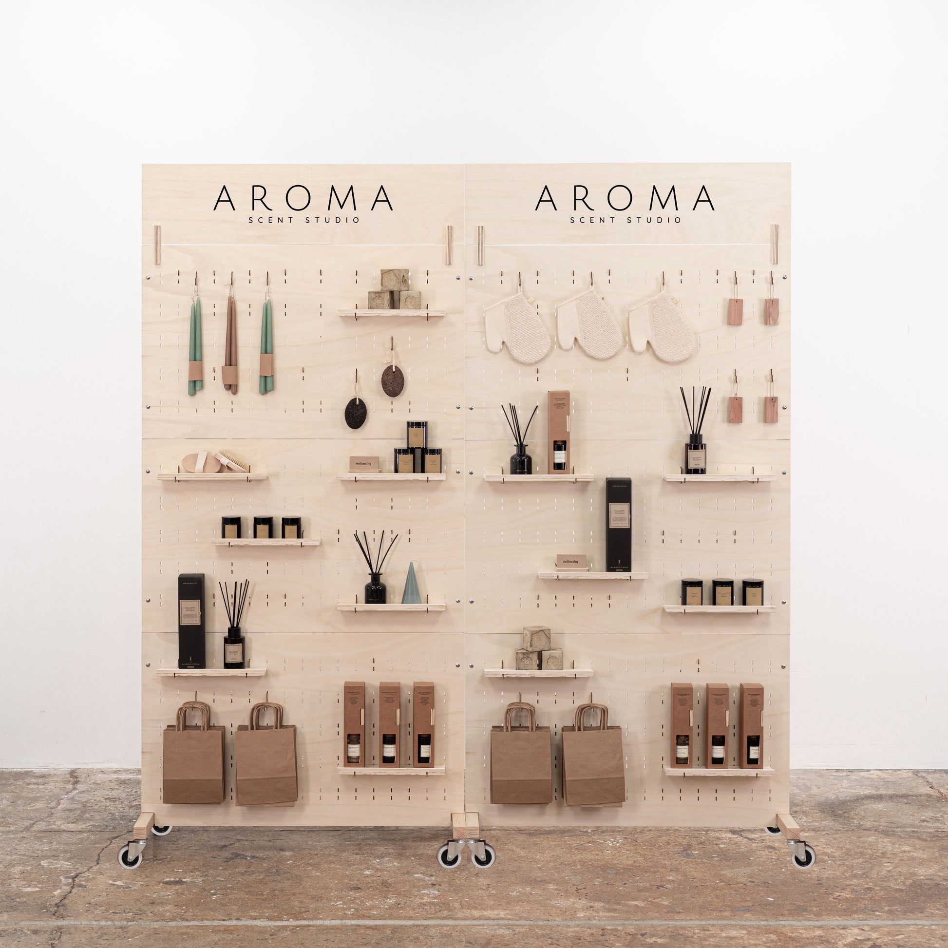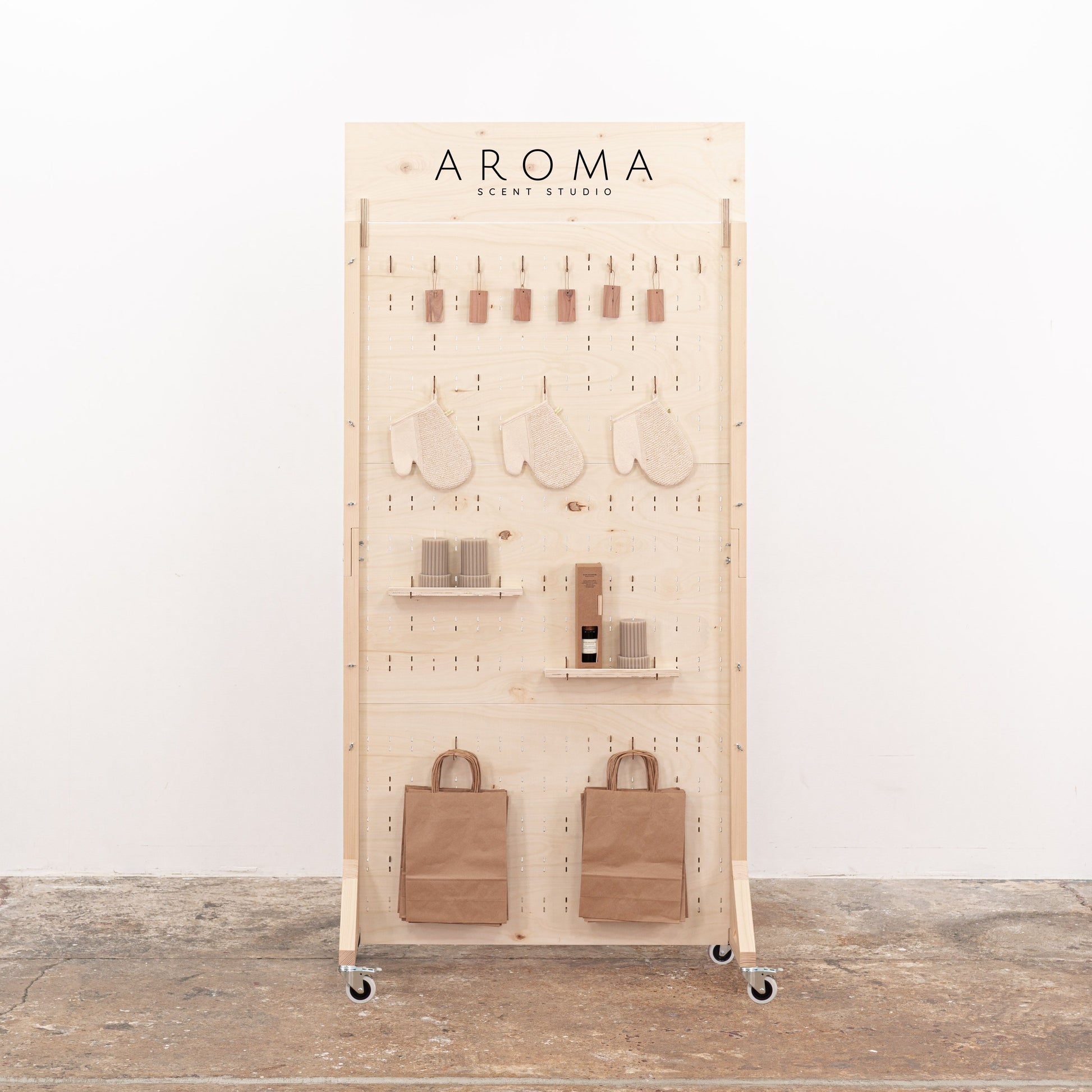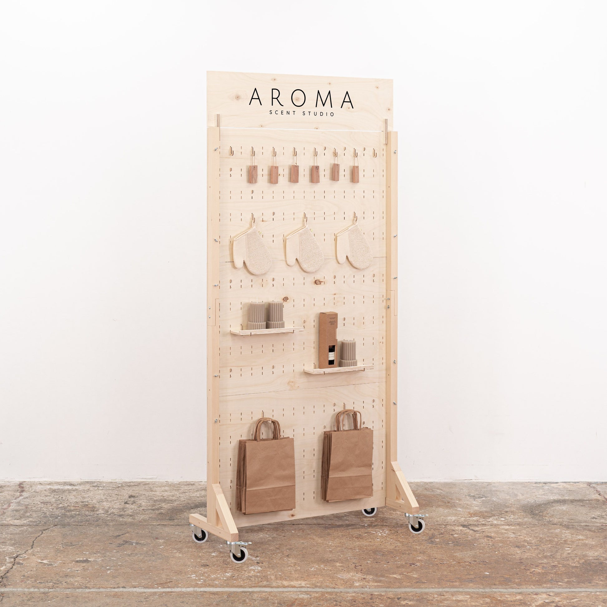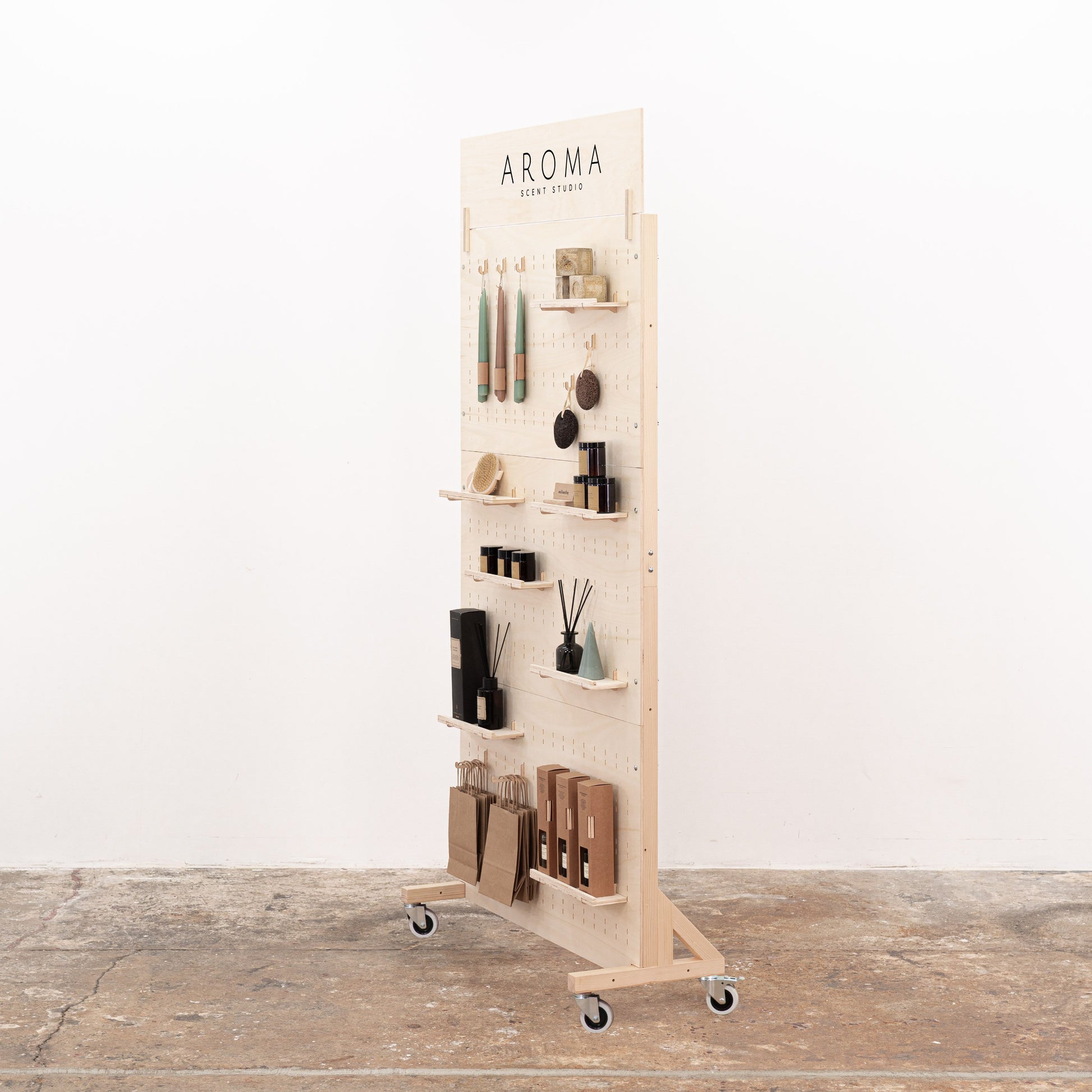 This natural wood mobile pegboard display is a flexible and modern merchandising solution, designed to adapt to changing retail and event needs. Featuring a double-sided pegboard panel, it allows you to freely arrange shelves, hooks, and pegs for an entirely custom display setup. Perfect for pop-up shops, market stalls, trade show booths, and boutique interiors, it gives you endless possibilities for showcasing small goods, hanging items, or even promotional materials.