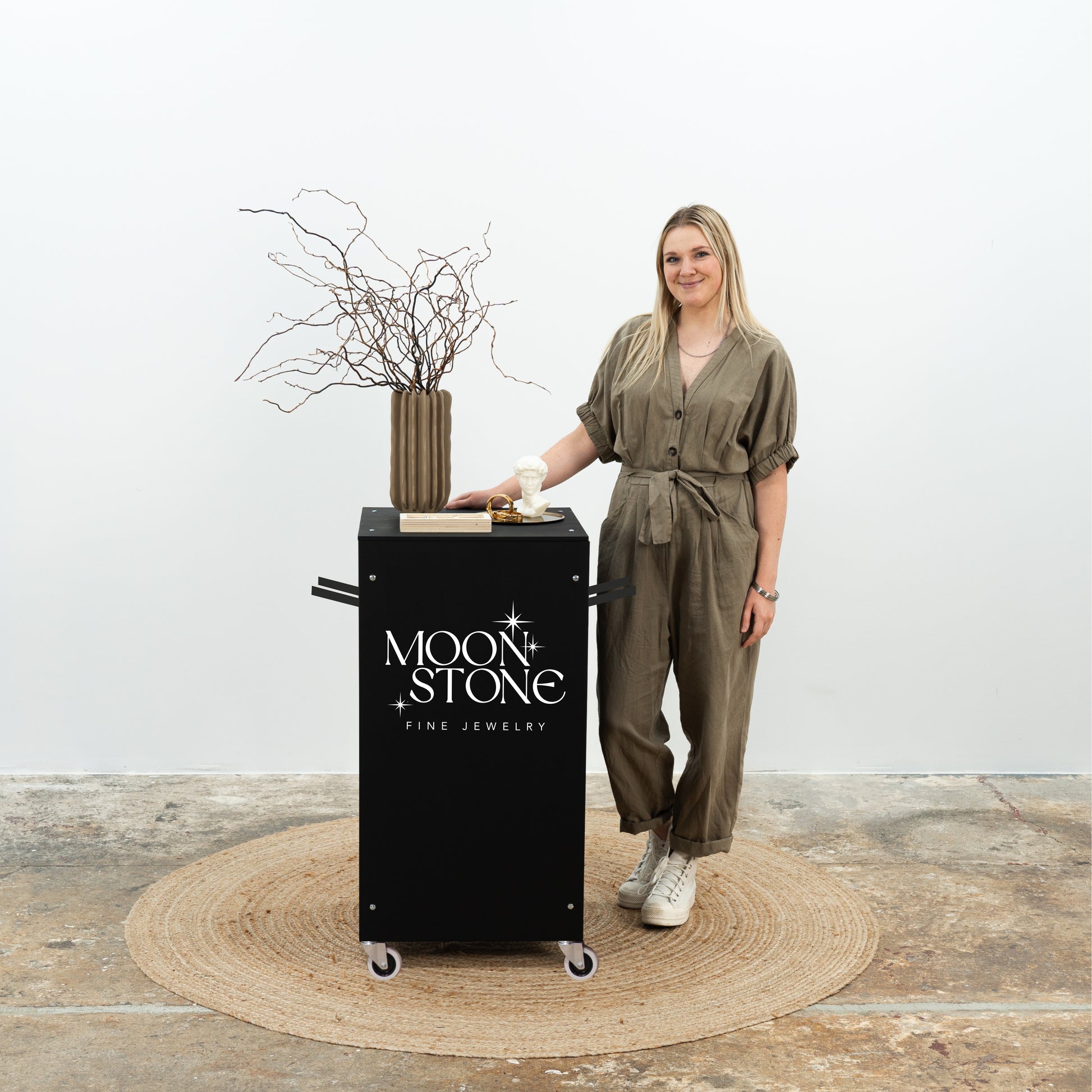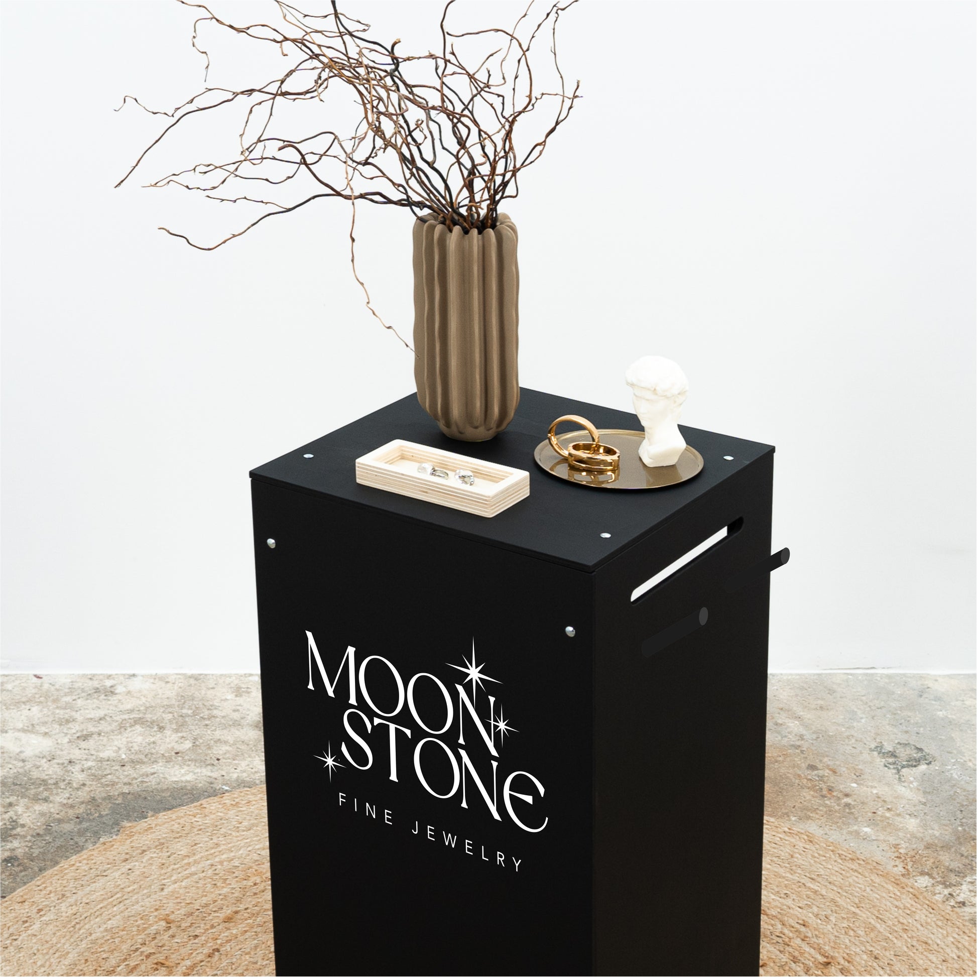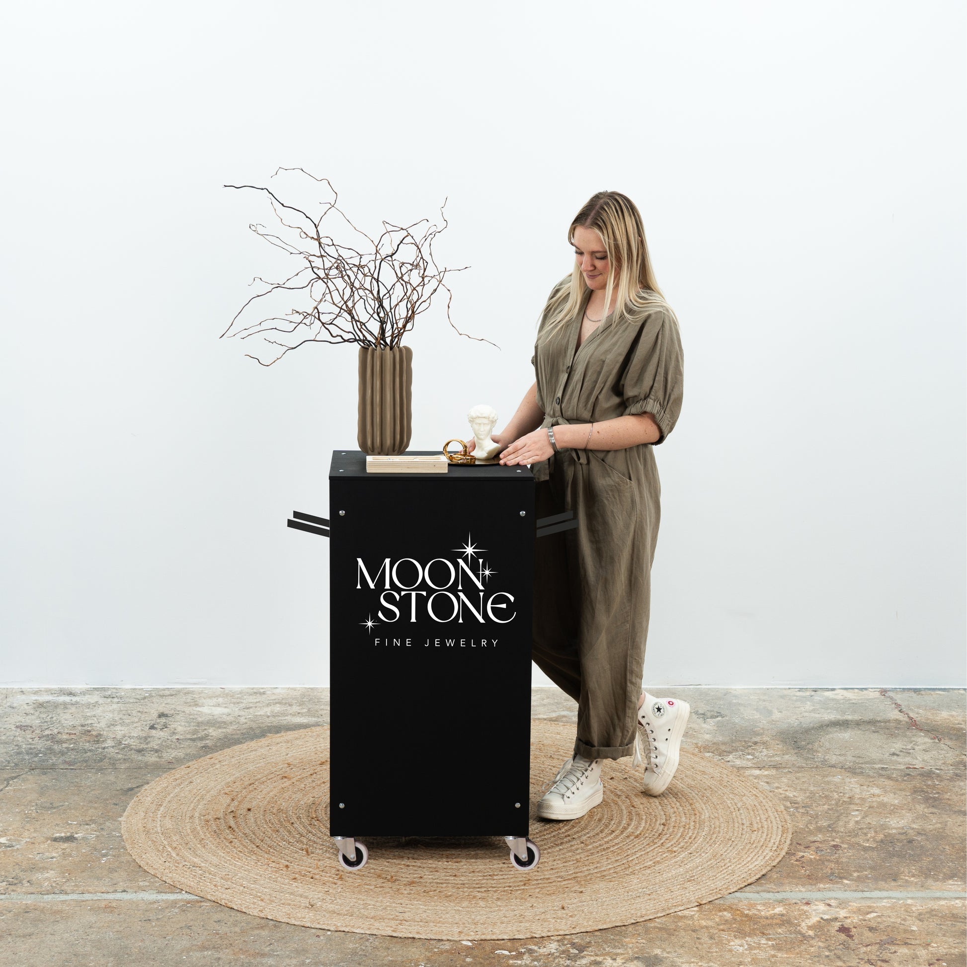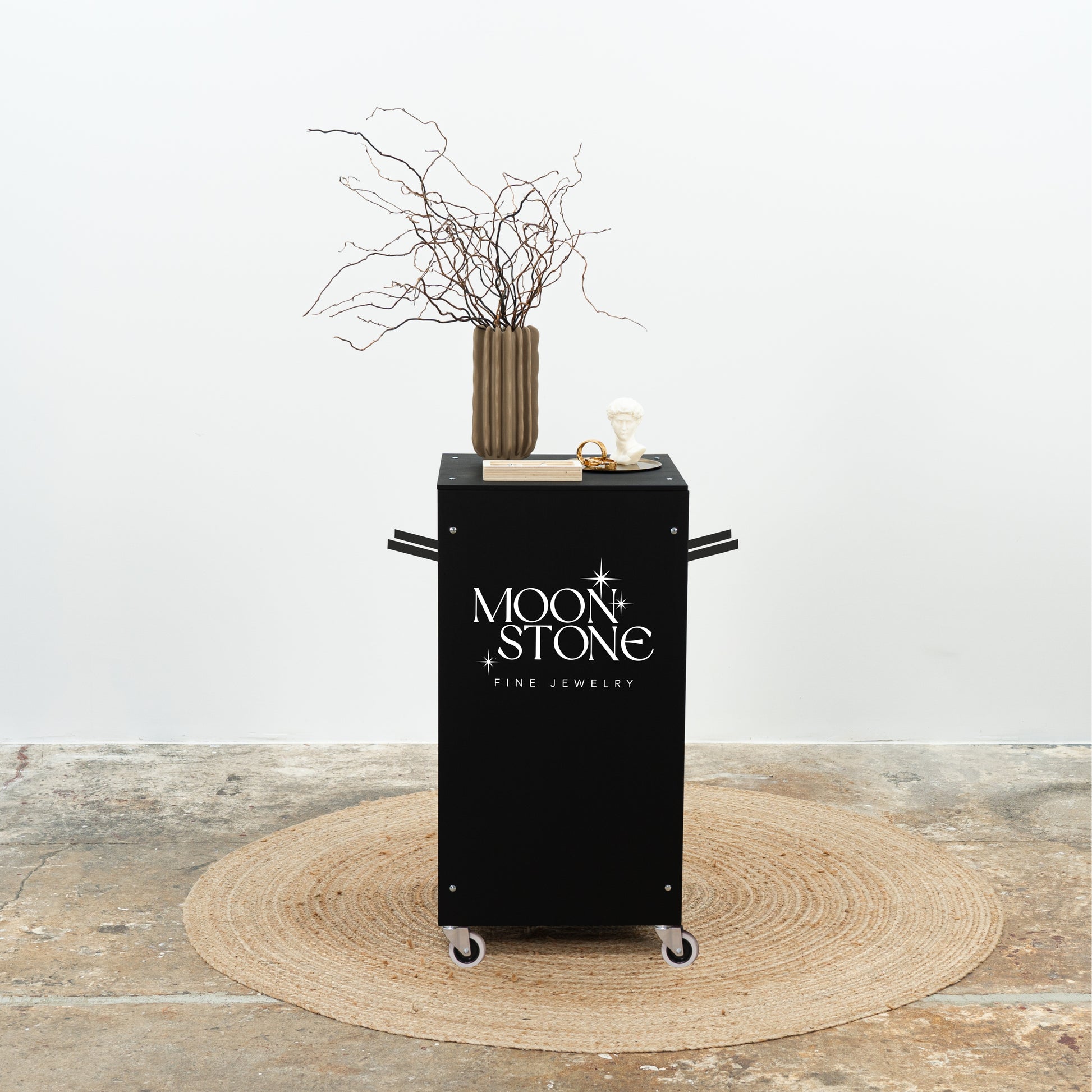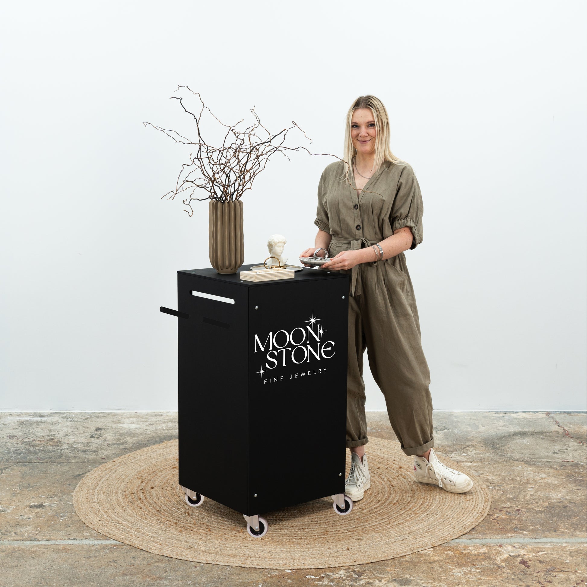 Make a bold statement at your next event with this black portable counter on wheels, designed for trade shows, retail pop-ups, and branded activations. With its durable plywood construction, tool-free assembly, and customizable front panel, this mobile display unit is a practical and eye-catching choice for event professionals, vendor booths, or brand showcases.