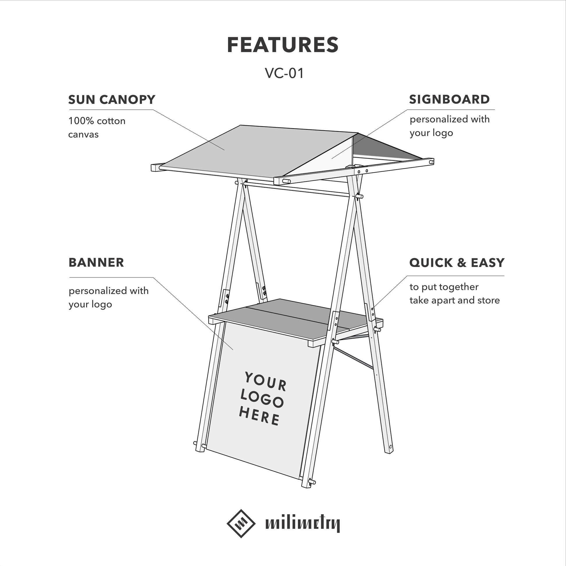 This versatile market stall is designed to meet the needs of vendors, artisans, and brands at trade fairs, exhibitions, pop-up events, and farmer’s markets. Available in four configurations – with a personalized branding board, cotton front panel, sun canopy, or a full version combining all elements – it offers unparalleled flexibility for any type of retail activation or product showcase.