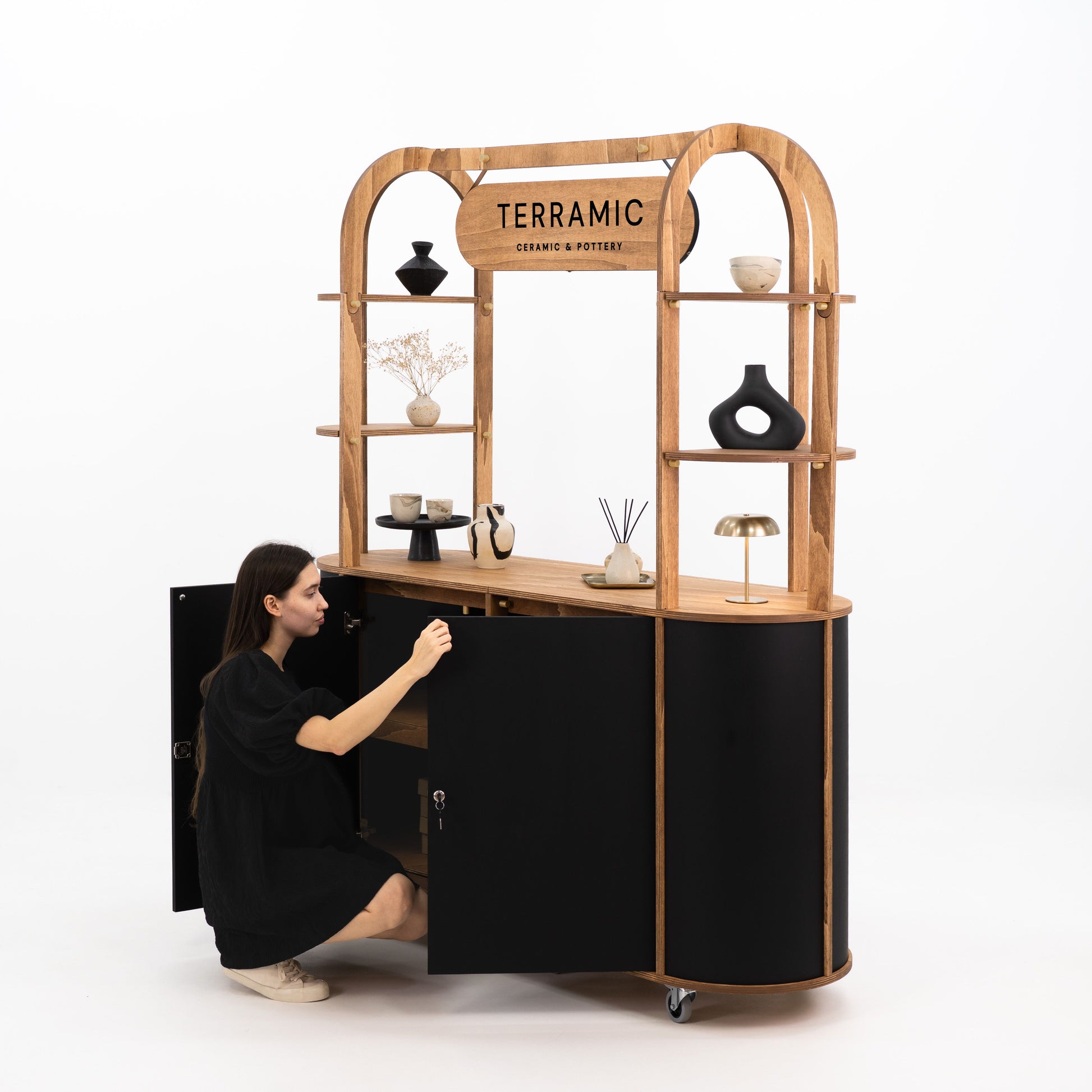 The VC-29 Display Cart is a versatile, stylish, and functional solution designed for a wide range of uses, making it perfect for events, trade shows, retail spaces, or any service-oriented setting. Whether you're setting up a mobile bar, gift shop, promotional stand, or checkout counter, this cart offers the ideal combination of elegance and practicality, adaptable to various environments such as weddings, corporate events, pop-up shops, or food and beverage service.