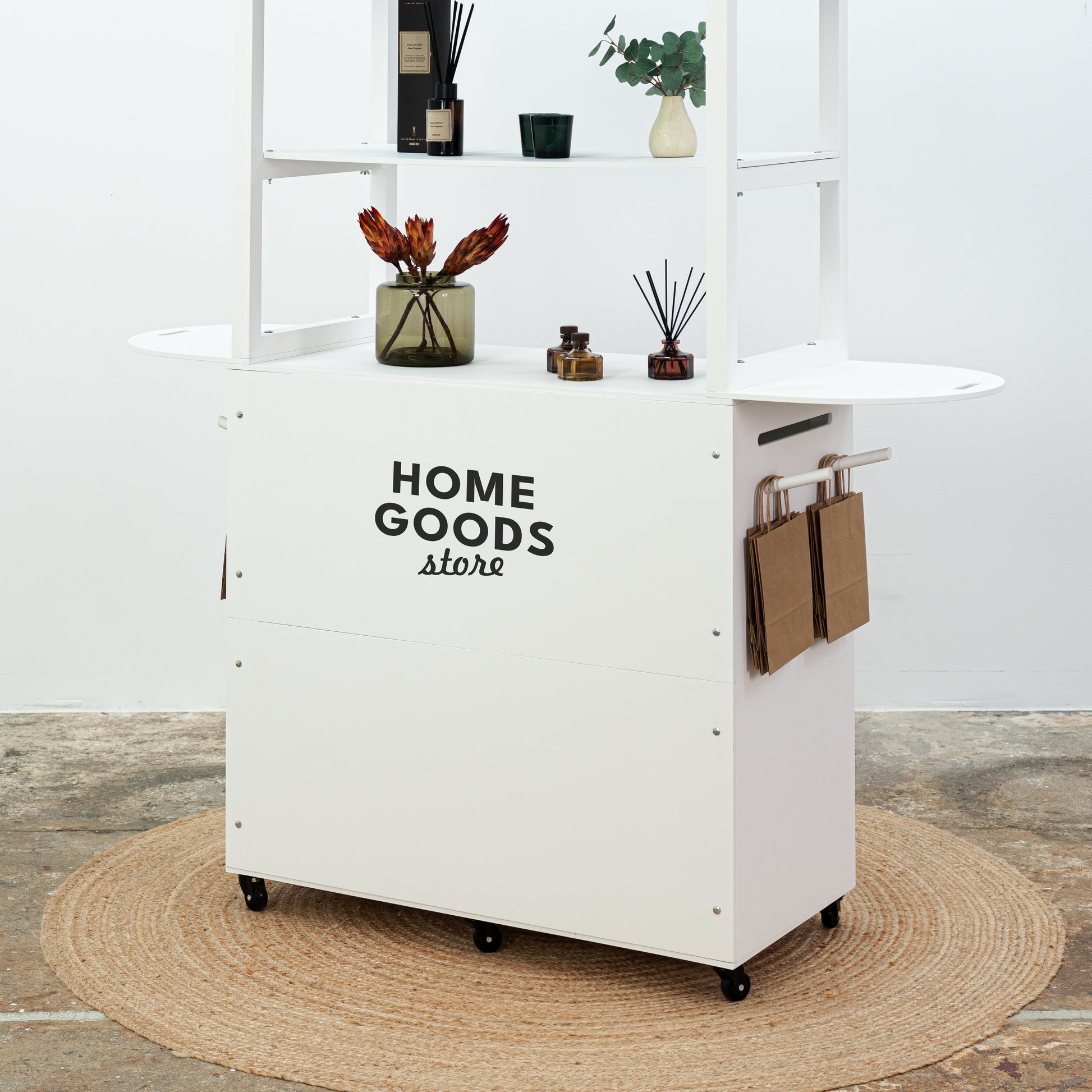 This white display cart is a versatile, flat-pack mobile station designed to elevate your brand presence at trade shows, pop-up shops, and promotional events. Handcrafted from durable plywood and spruce wood and finished with a clear matte coating, it combines elegance and mobility in one.