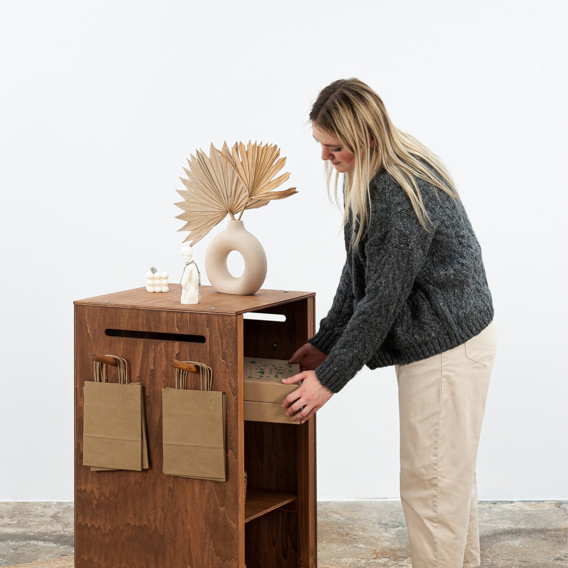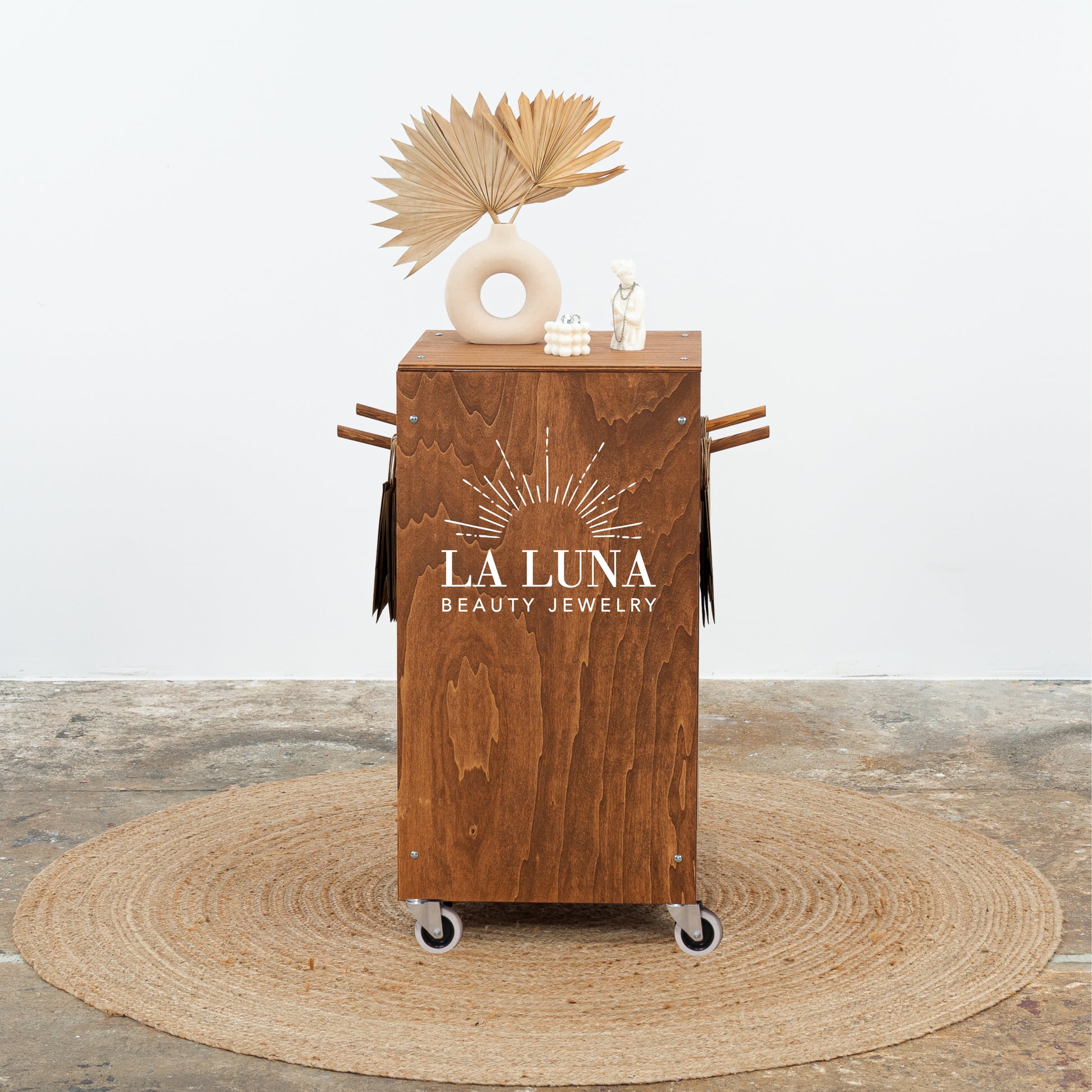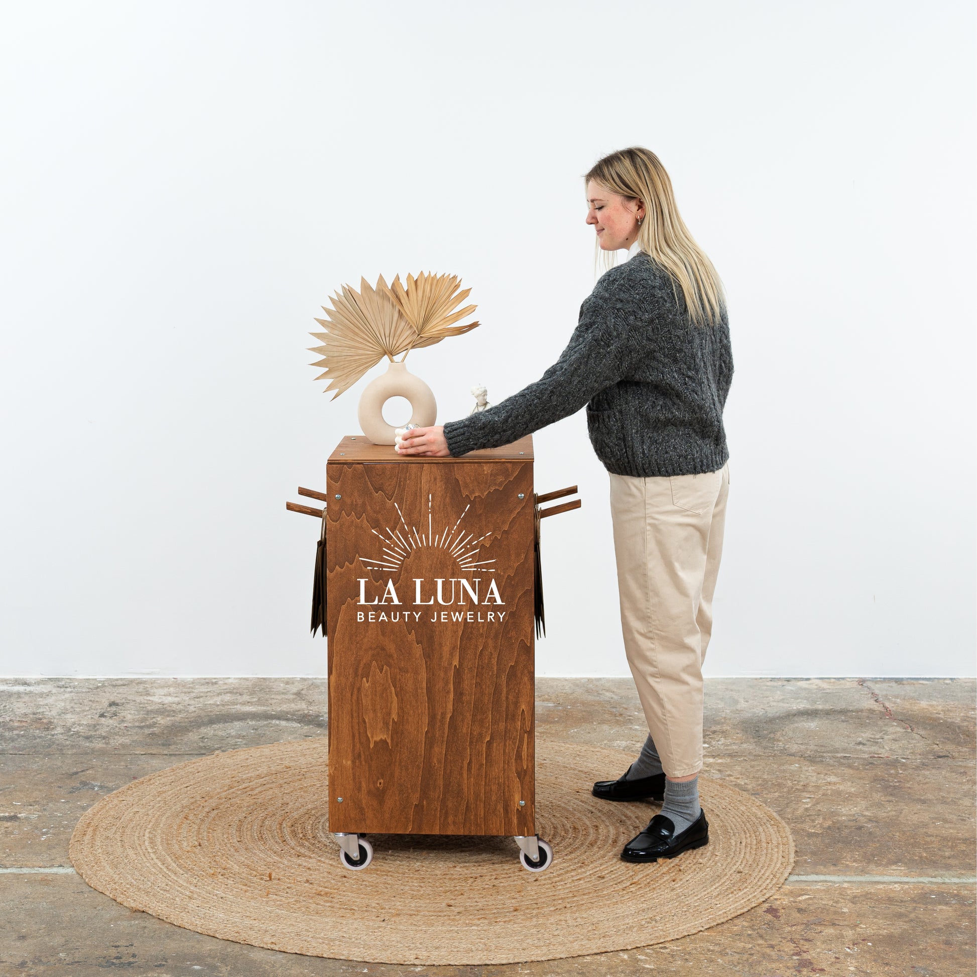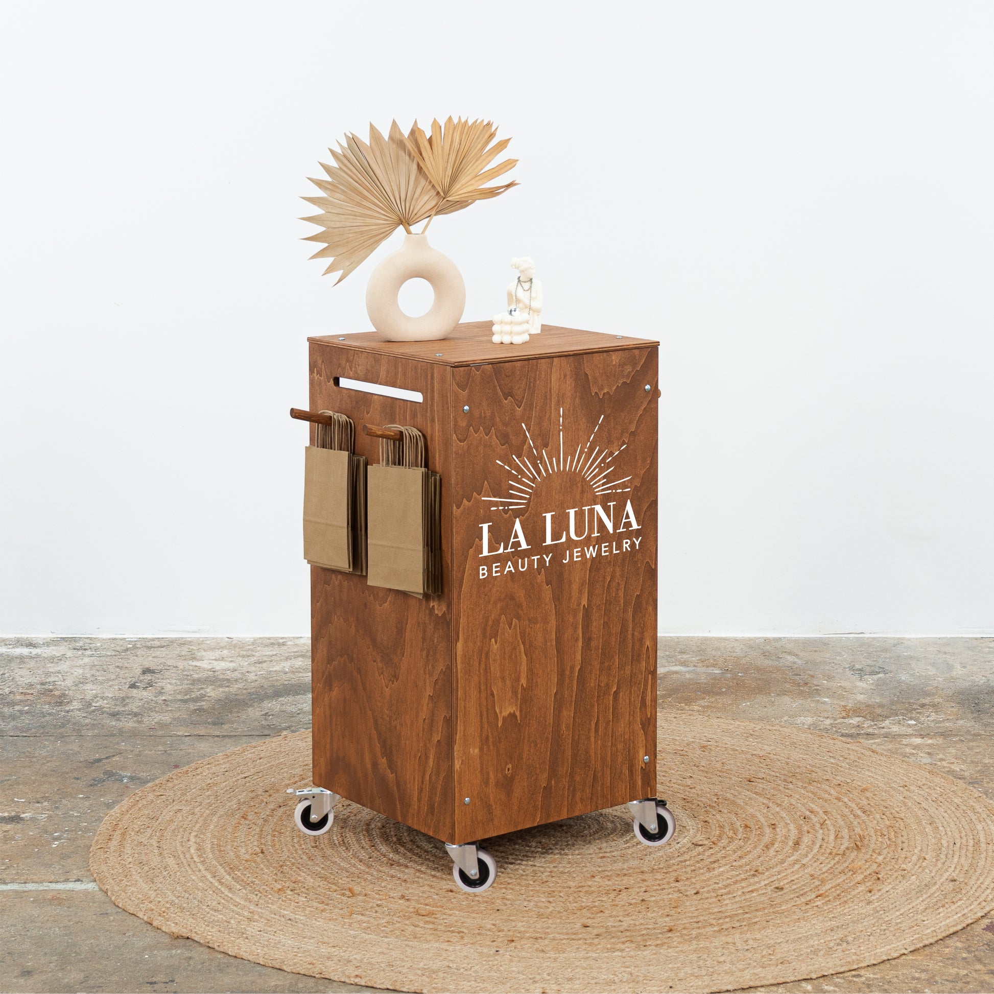 Elevate your next brand activation with the mobile host stand in a warm coffee-stained wood finish. Designed specifically for trade shows, retail activations, pop-up events, and brand experiences, this compact workstation brings both style and functionality to any event setup.