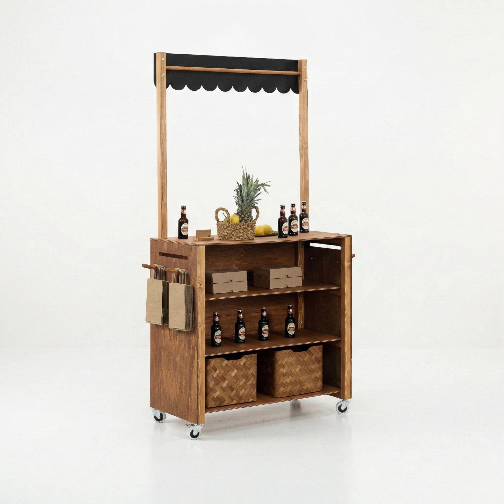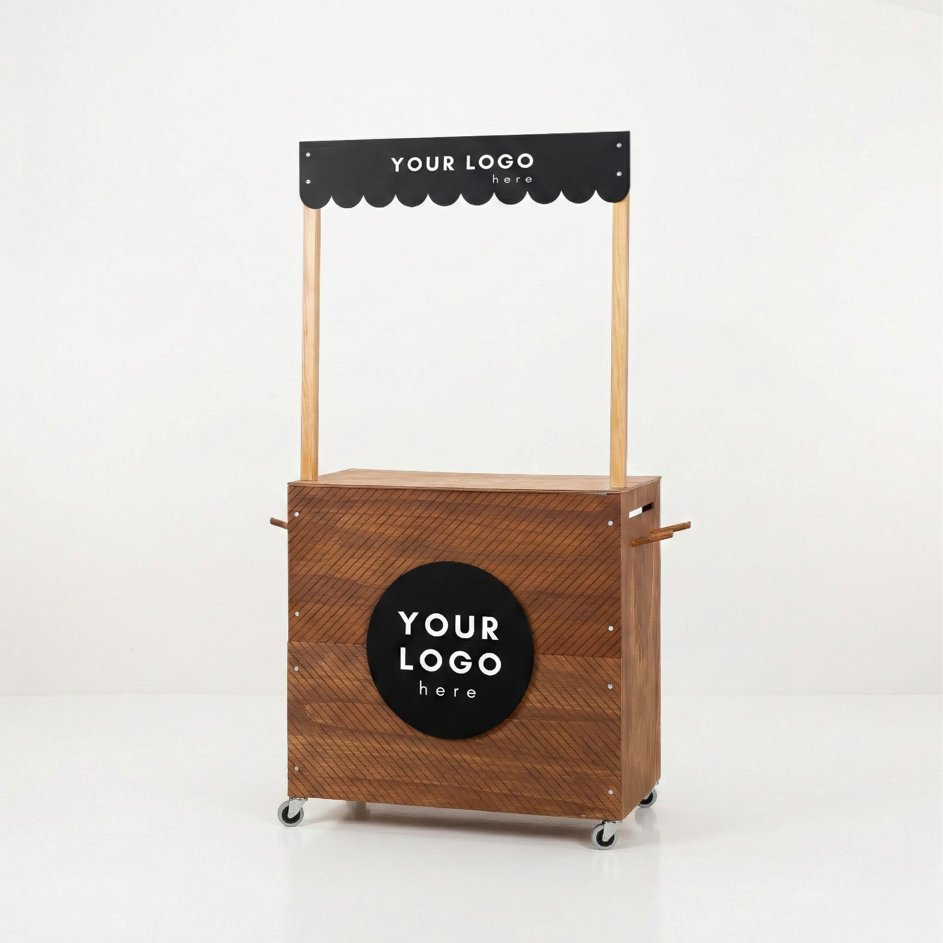 The warm coffee wood finish adds an elegant touch, making it stand out in any exhibition hall or marketplace. Built from solid spruce and high-quality plywood, the cart is robust enough for repeated use while remaining lightweight and portable. It features spacious storage with three back shelves, perfect for keeping extra stock, bags, or personal items organized and within reach during busy events. The circular front panel and upper signage area can be personalized with your logo or custom graphics, ensuring your booth is instantly recognizable. With its flat-pack design and tool-free assembly, the cart is easy to transport and quick to set up—ideal for exhibitors attending multiple fairs or events. Whether used as a vendor booth, retail counter, or pop-up tasting kiosk, SET Coffee Edition offers both functionality and premium aesthetics.