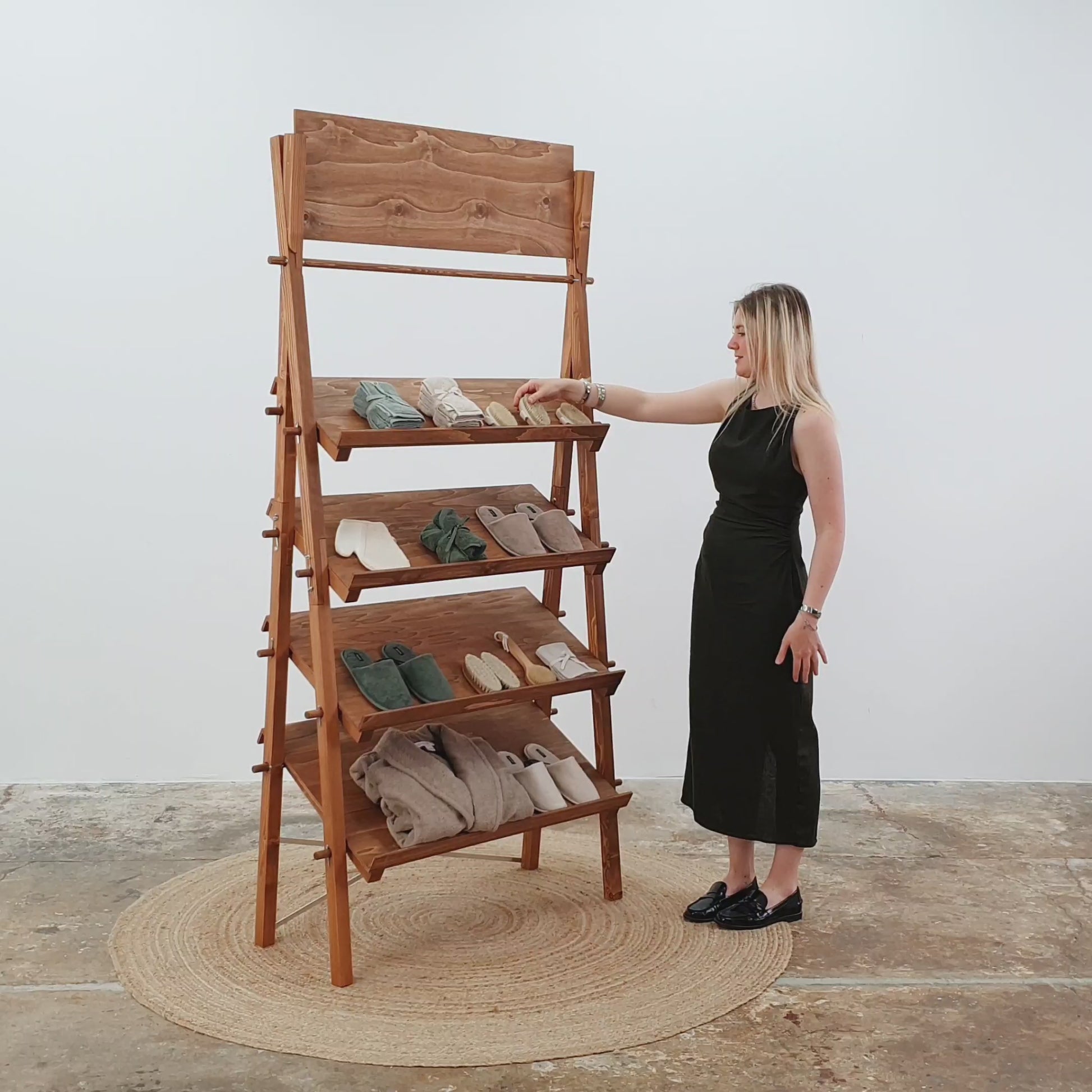 Coffee-colored A-frame shelving unit - designed for brands that value natural tones, authentic craftsmanship, and functional display solutions. Whether you're a small-batch producer, artisan label, or lifestyle brand, this foldable display shelf blends aesthetic warmth with practicality — making it ideal for pop-up shops, craft fairs, retail stores, and wellness events.